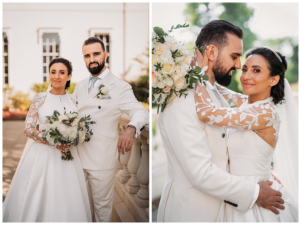 For Georgina’s bridal bouquet, we used a mix of Dorchester Meyer roses (an interesting coincidence only), mixed in with peonies, scented O’Hara hint of blush garden roses, spray roses and lisianthus, with just a little accent eucalyptus and lacy gypsophila, to echo the stunning lace design of Georgina’s dress sleeves.