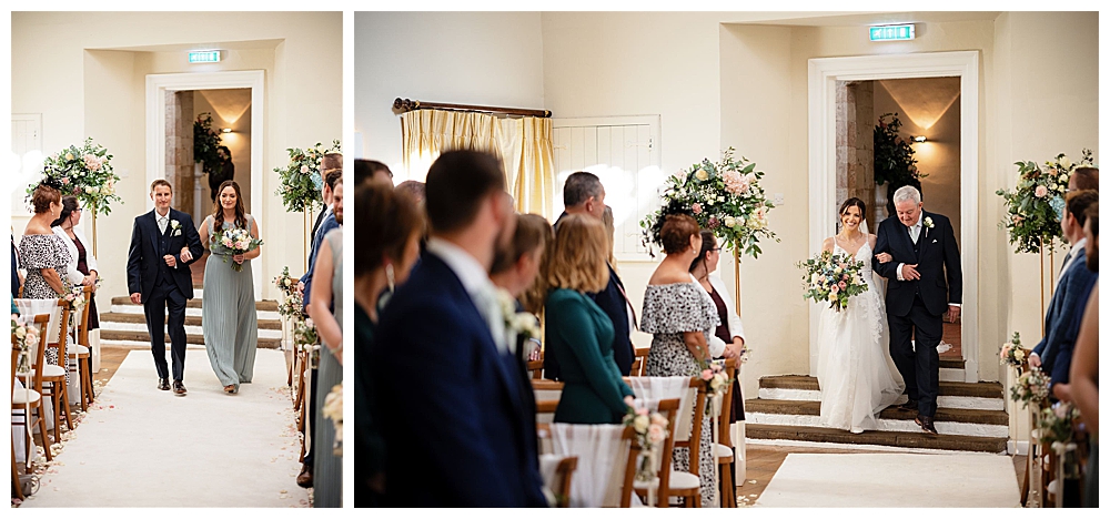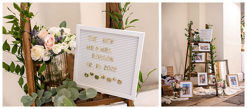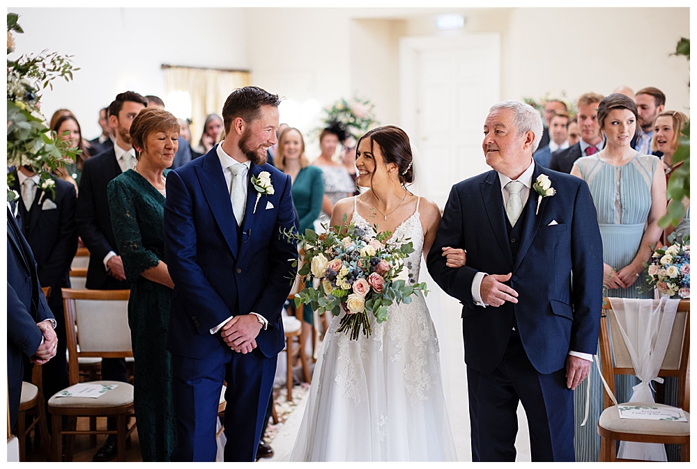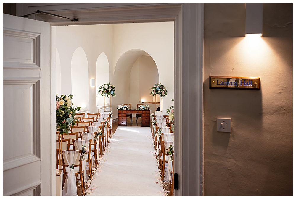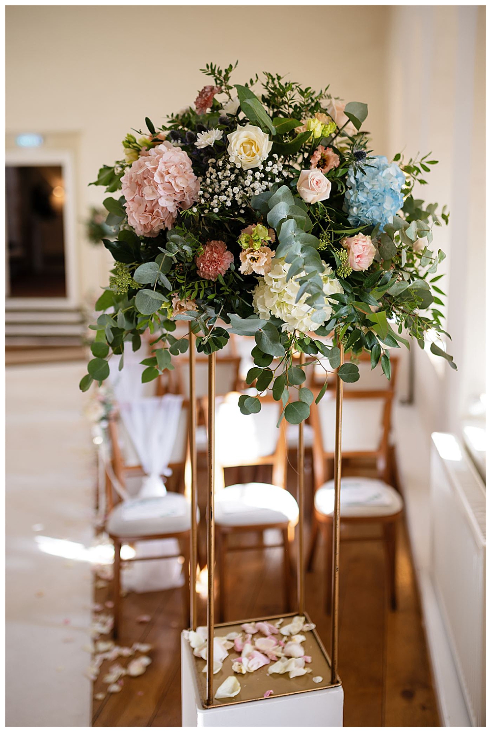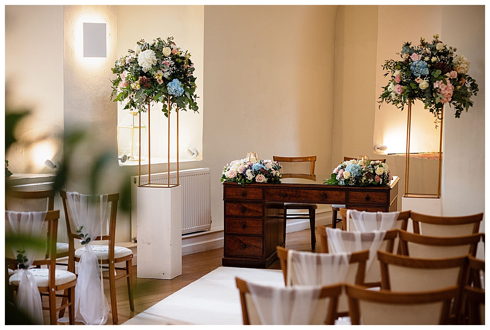 The ceremony room was dressed with 4 tall impressive floral displays on gold stands, and the windowsills were styled with alternating lanterns, and floral wreaths with a candlelit lantern in the middle. The ceremony table was also dressed with 2 candlelit wreaths, giving enough of them that they could be later reused as table centrepieces on half of the guest tables. And finally, the chairs were dressed with pretty floral posies on every other row and styled with Grecian style chair sashes with a sprig of eucalyptus tucked in. Petals scatter down the aisle completed the look for the ceremony