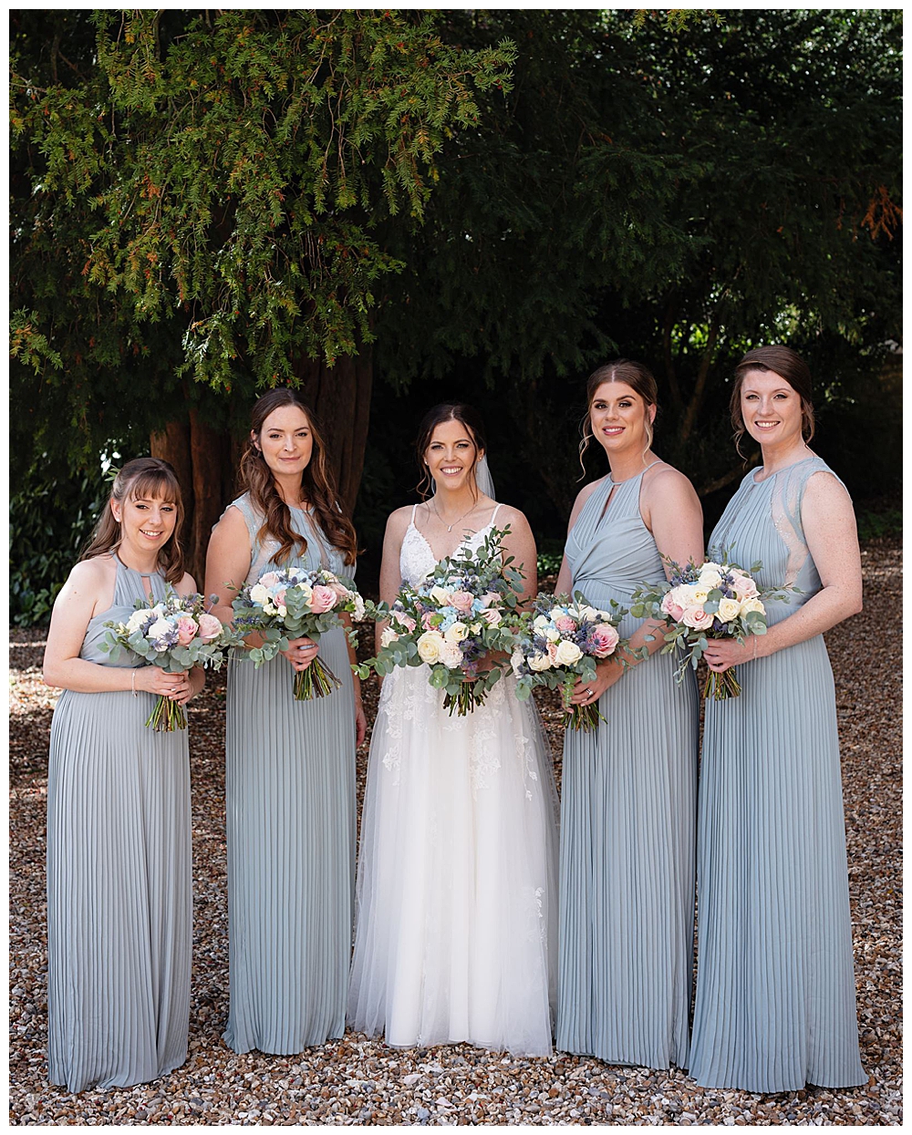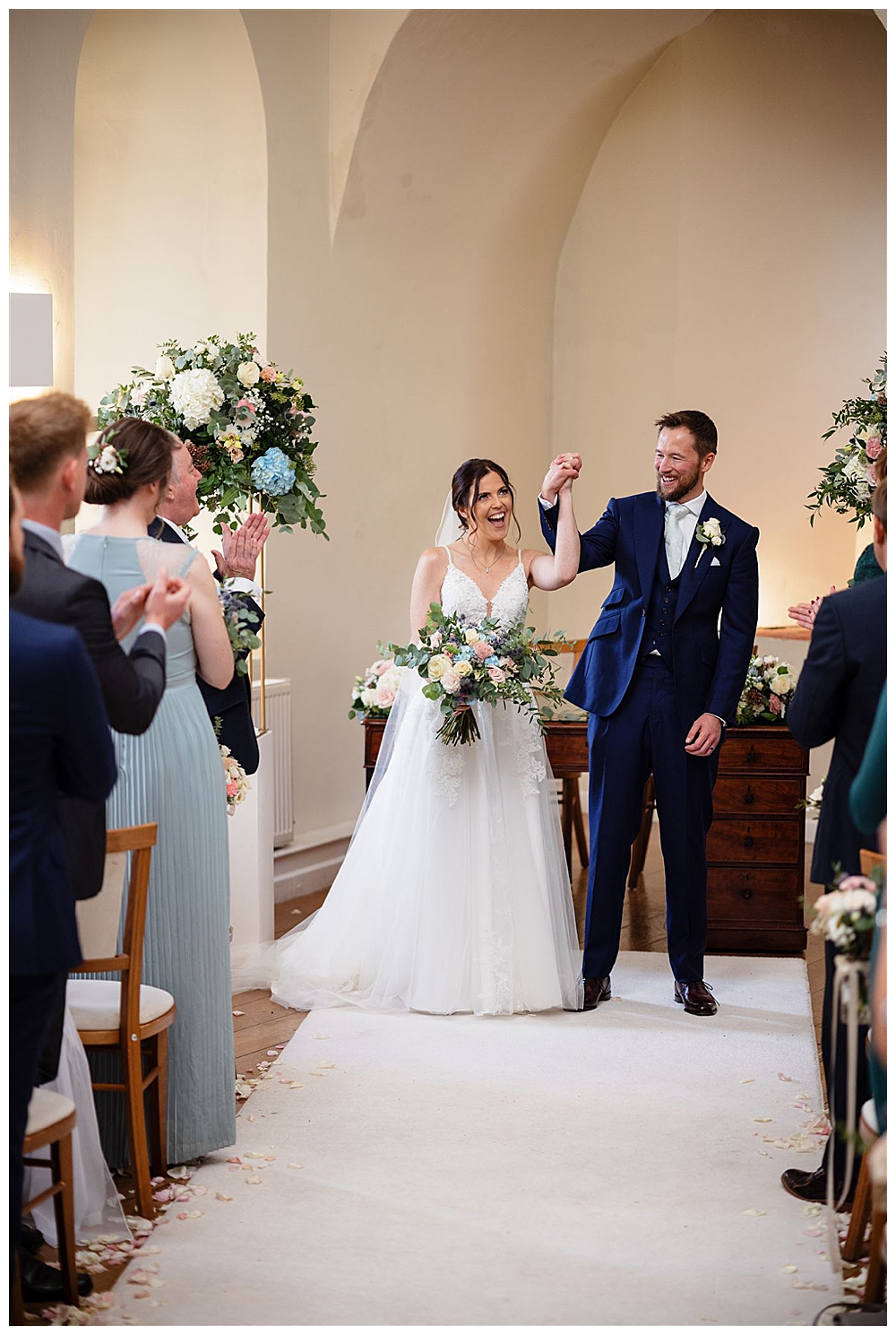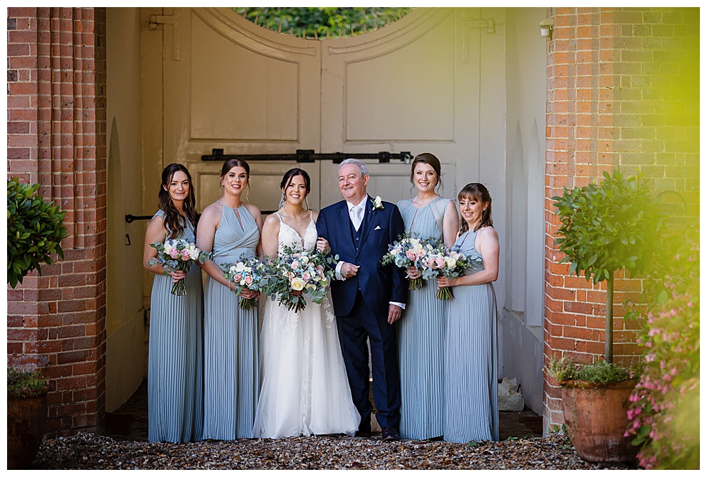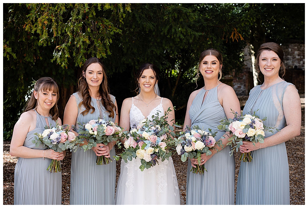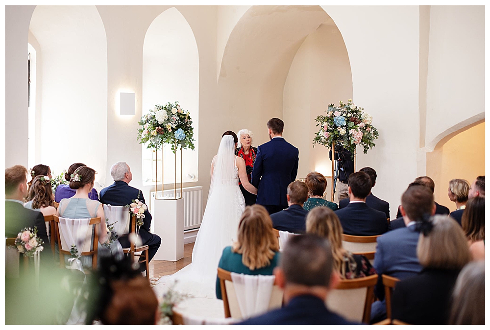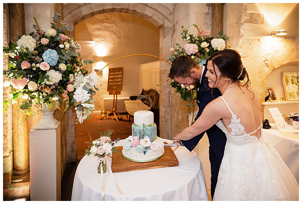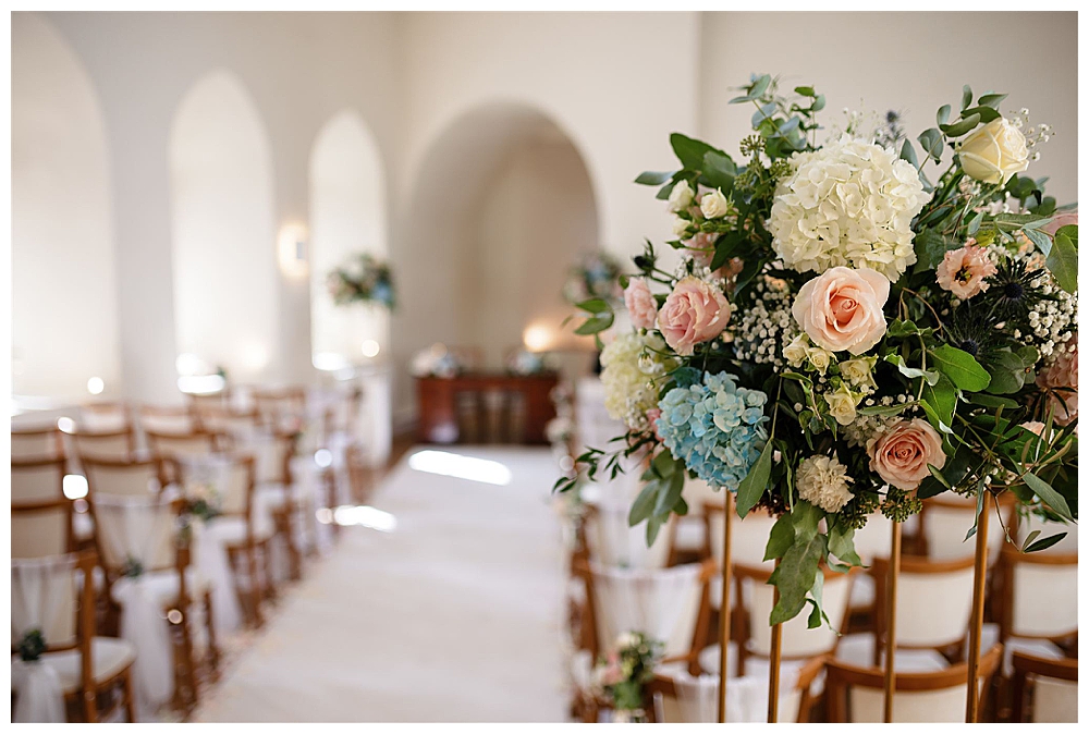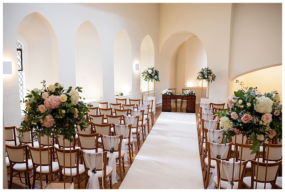 For Leah and Aaron’s wedding, I absolutely loved the dusty blue and pink wedding flowers mix we created. The wedding was at historic Farnham Castle, with the ceremony in the beautifully light Lantern Hall. With a grand arched recess behind the ceremony table and fantastic deep arched windows along one side, the room is so impressive and stunning, dressing it with flowers is an absolute pleasure.