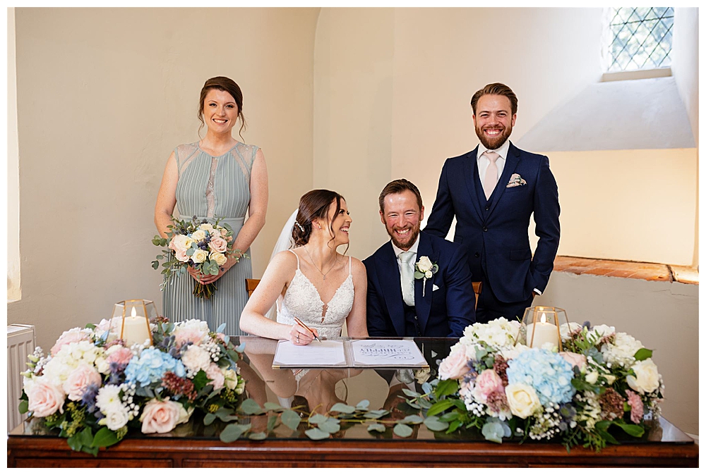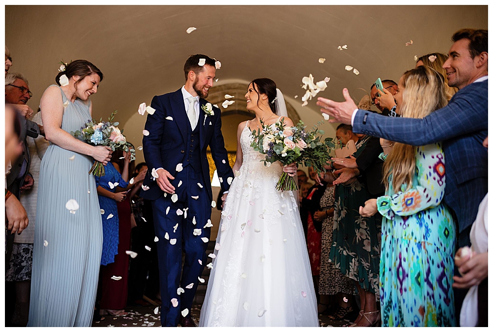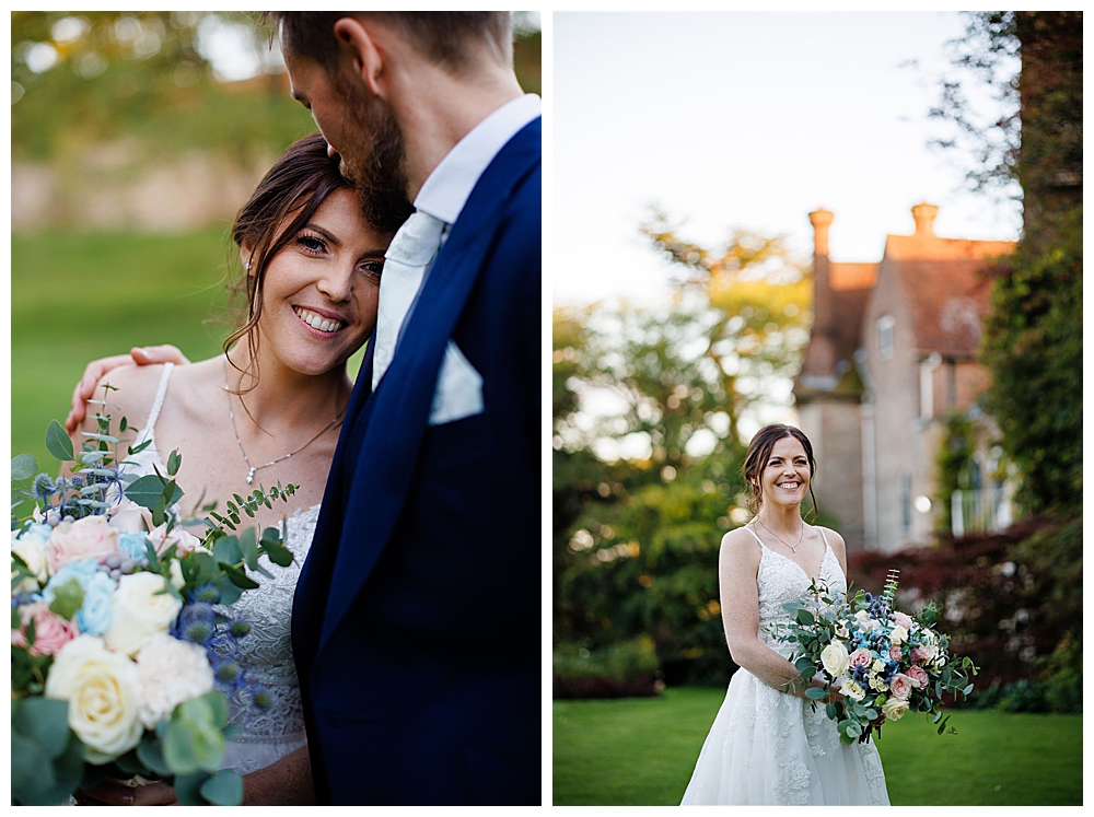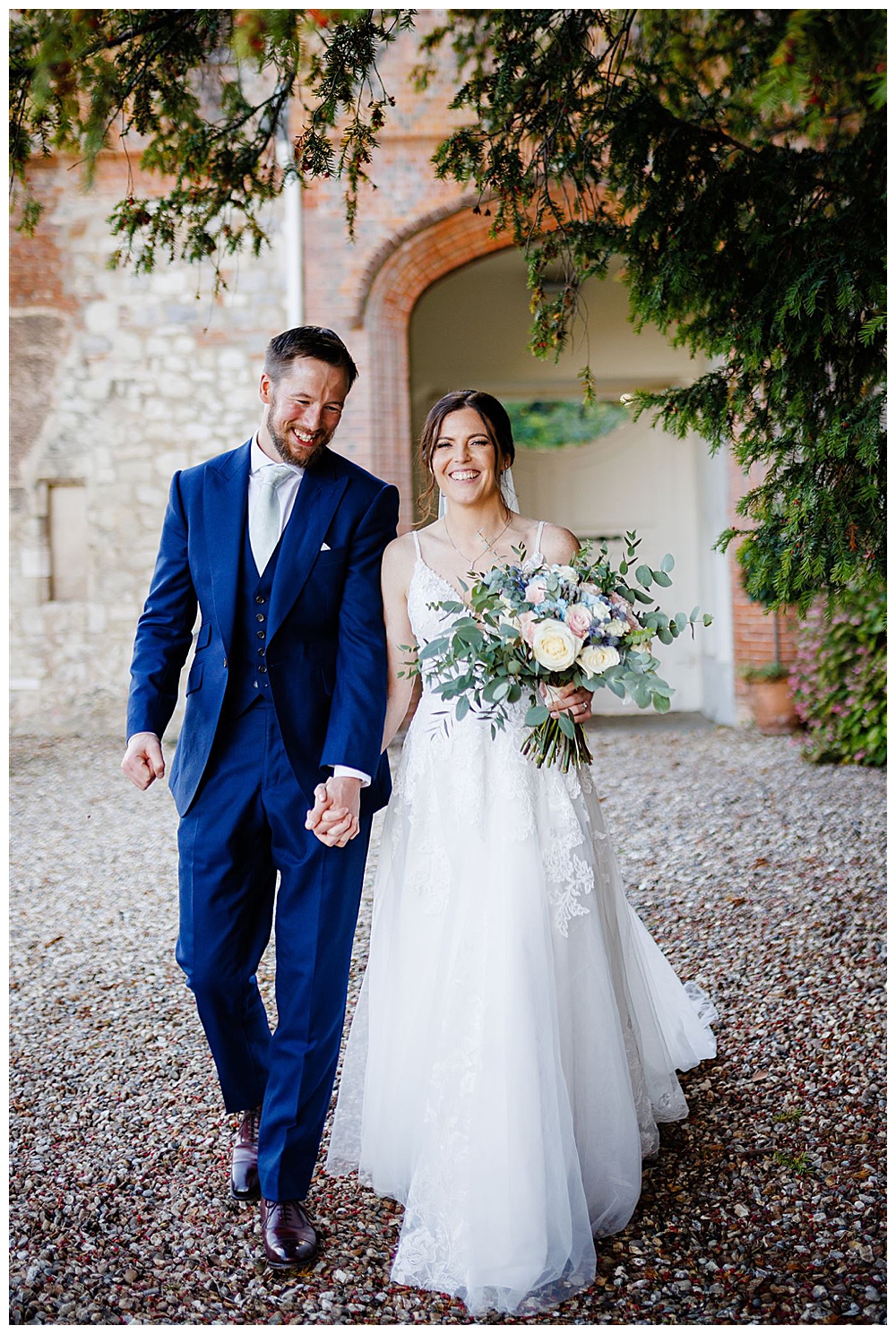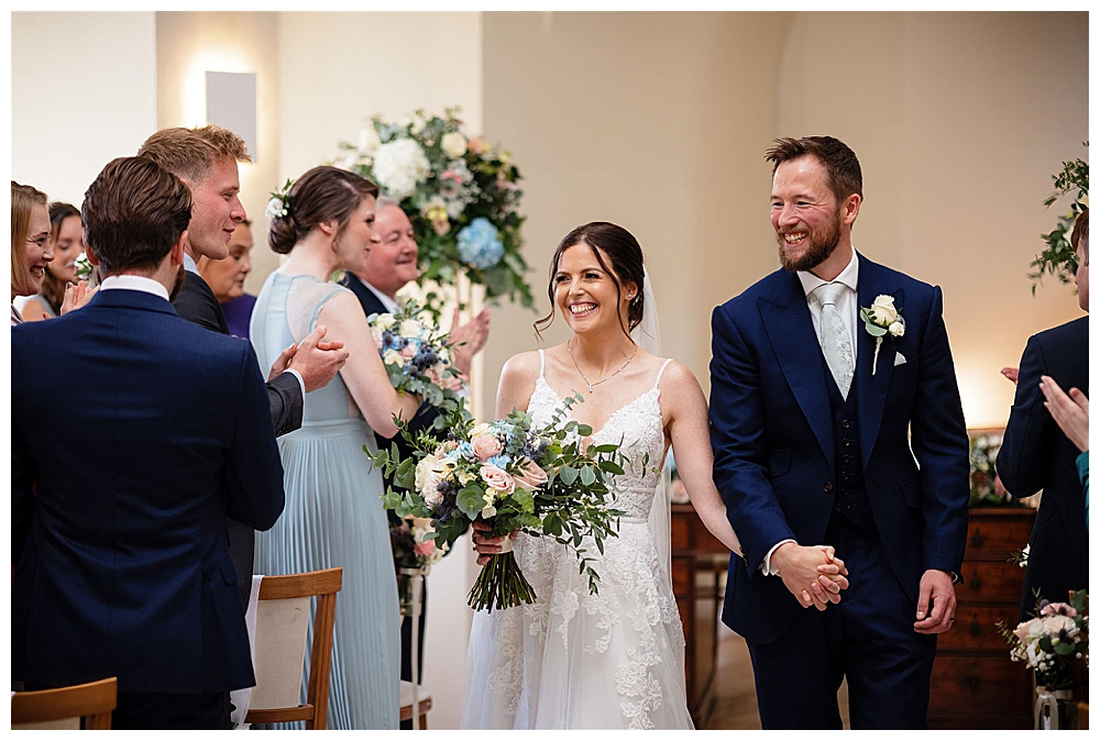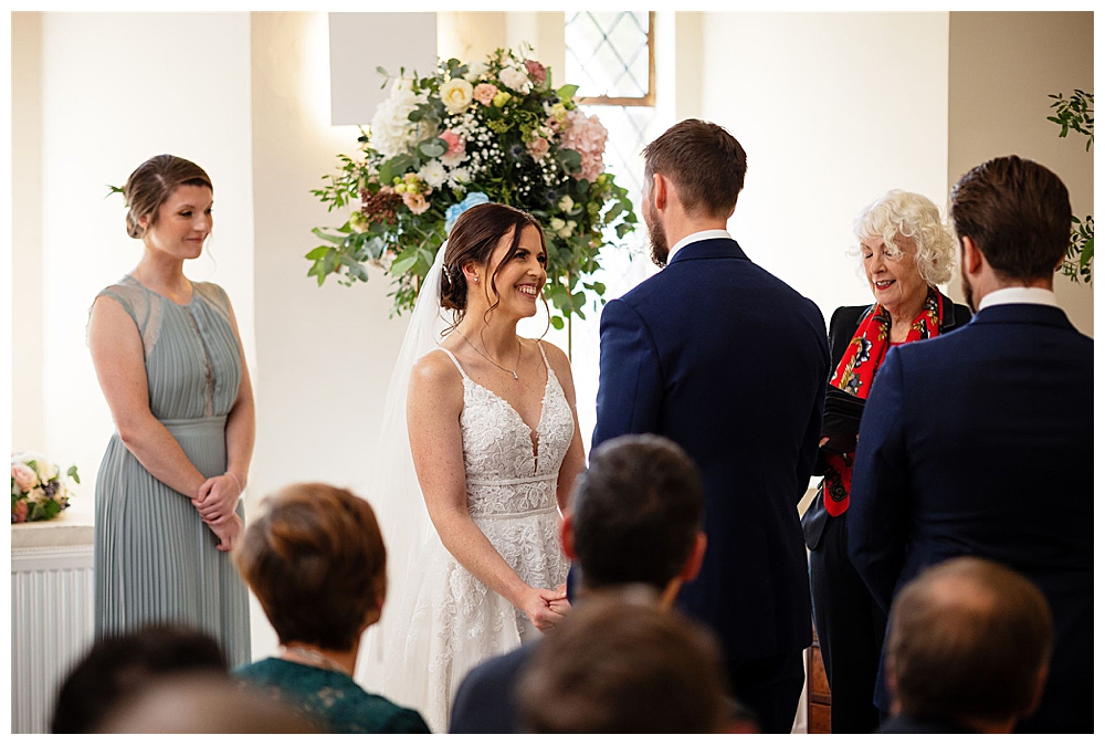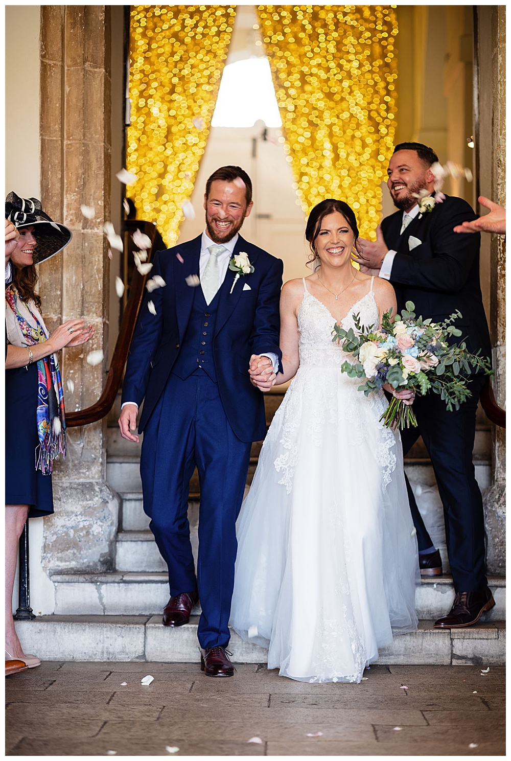 For Leah and Aaron’s wedding, I absolutely loved the dusty blue and pink wedding flowers mix we created. The wedding was at historic Farnham Castle, with the ceremony in the beautifully light Lantern Hall. With a grand arched recess behind the ceremony table and fantastic deep arched windows along one side, the room is so impressive and stunning, dressing it with flowers is an absolute pleasure.