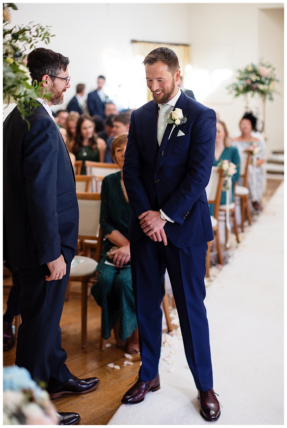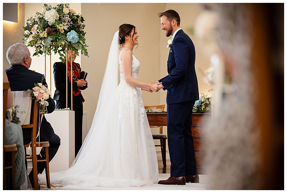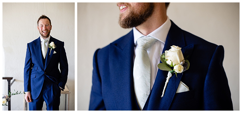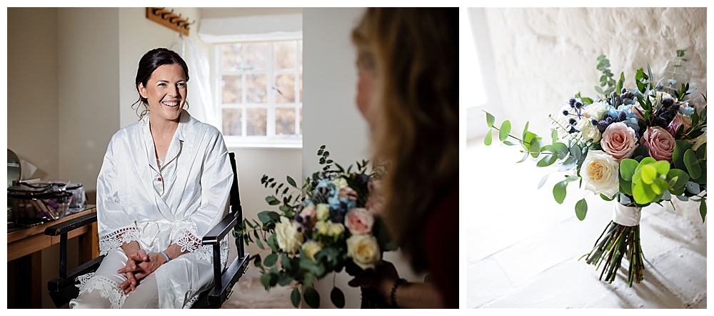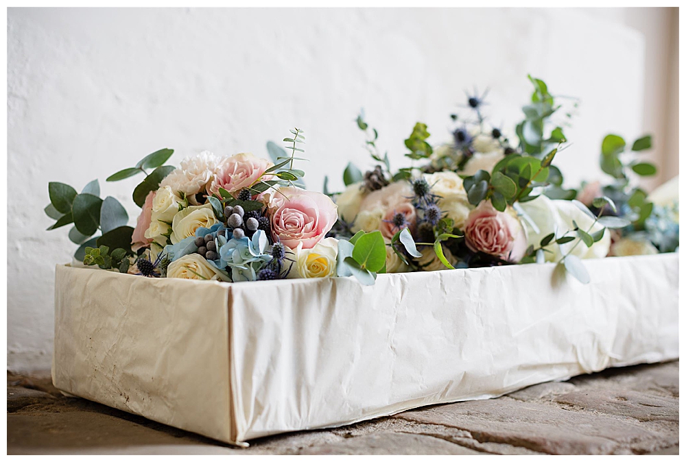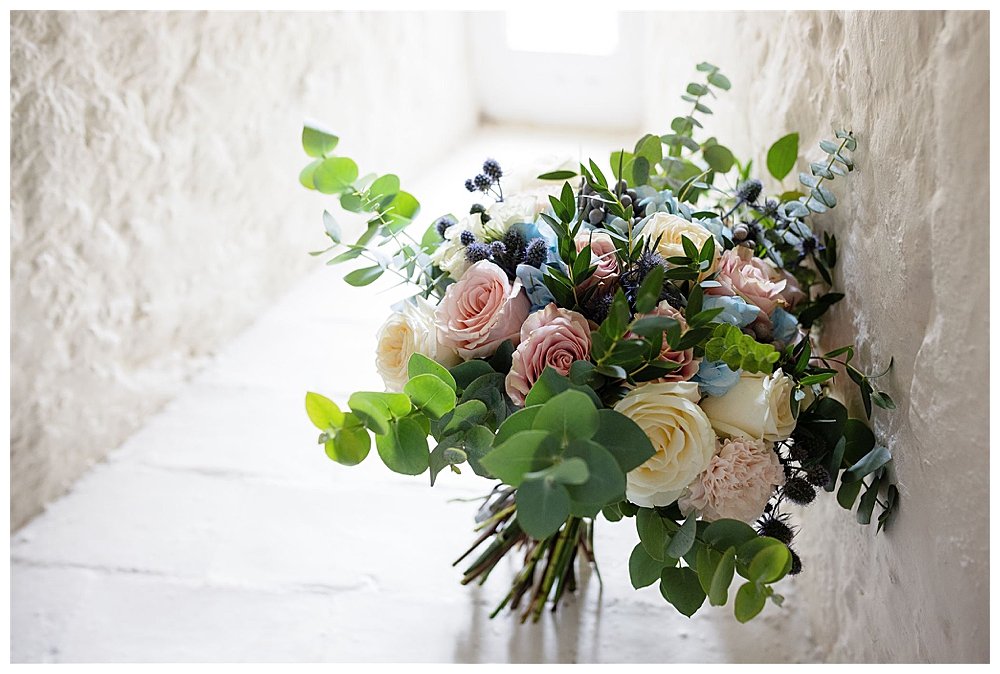 Leah and her bridesmaids carried bouquets of dusty blue hydrangeas, blush & dusty pink roses, blue thistles and sage green eucalyptus., with grey brunnia berries. The feature flowers were gorgeously scented O’Hara garden roses in a delicate shade of ivory with a hint of blush, these are my absolute all time favourite rose varieties, every time I walk past them in the workshop I stop to take a little sniff. Arron and the key men wore ivory rose buttonholes with thistles and spray rose detail, which looked great against the dark blue, almost navy suits.