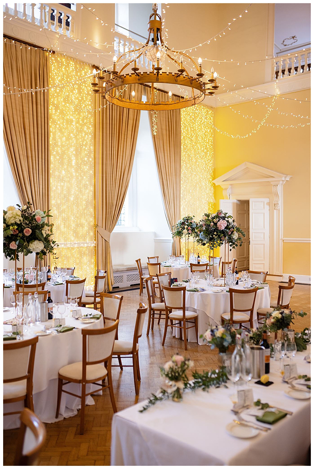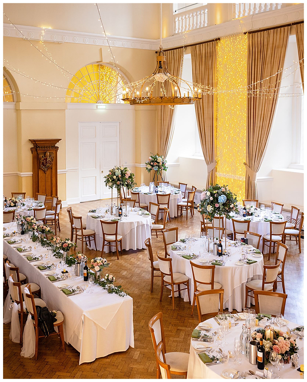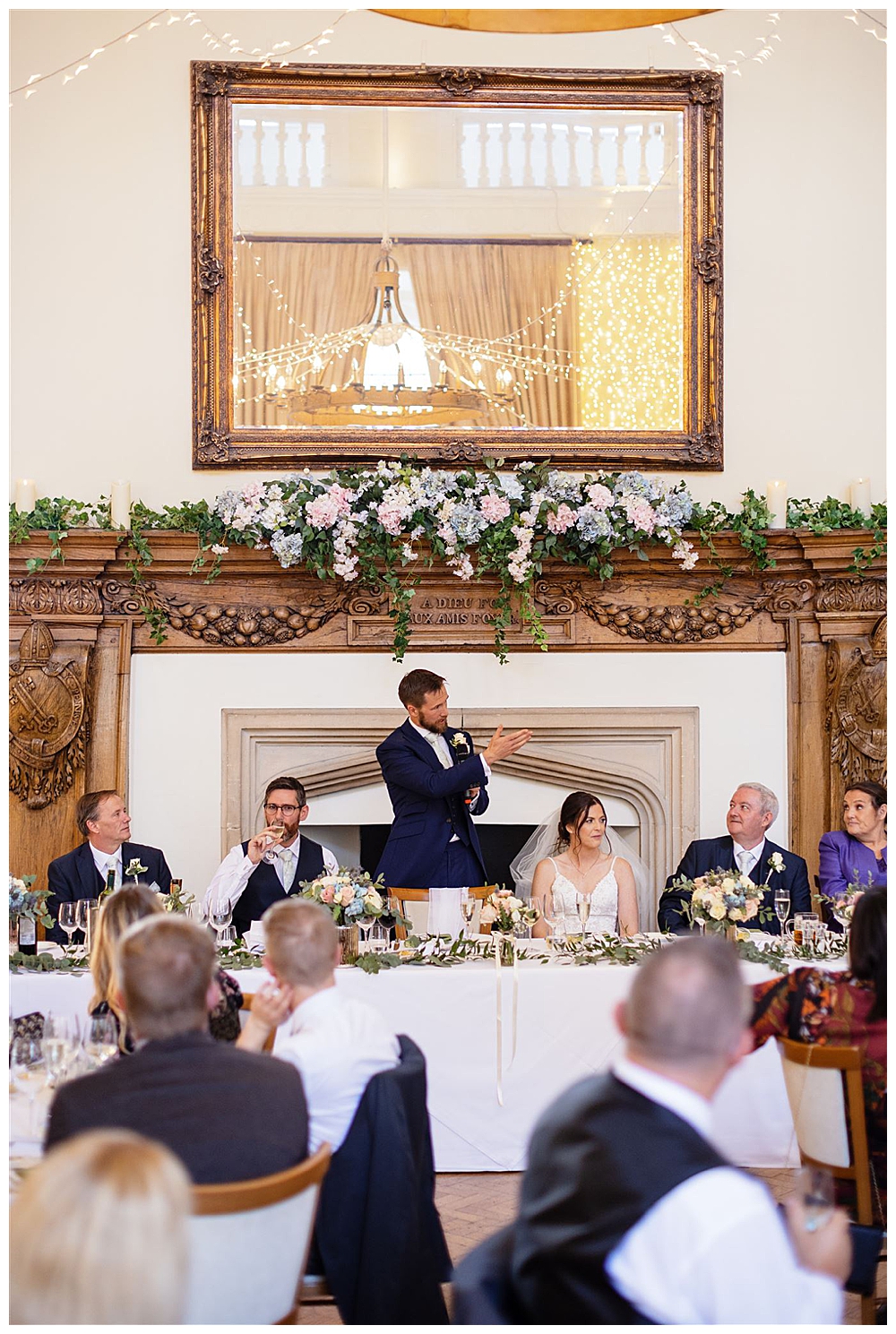 For the wedding breakfast in the Great Hall, the dusty blue and pink combination with lots of foliage looked really lovely with the table napkins styling. The top table was dressed with the bridesmaids bouquets and the chair flower posies, connected by lovely trailing foliage, while the rest f the guest tables were styled with a mix candlelit wreaths and tall geometric stands centrepieces from the ceremony room. The pièce de résistance was a beautiful long floral display for the grand mantlepiece behind the top table, extended all the way to the edges with trailing foliage and candles – such a beautiful backdrop to the top table, especially during speeches.