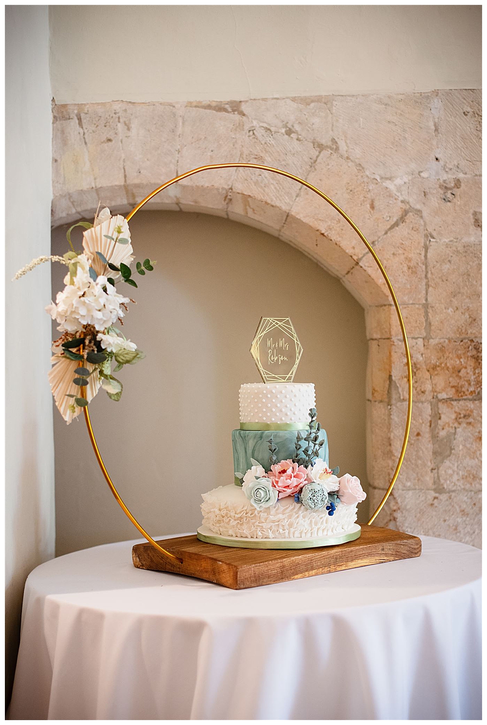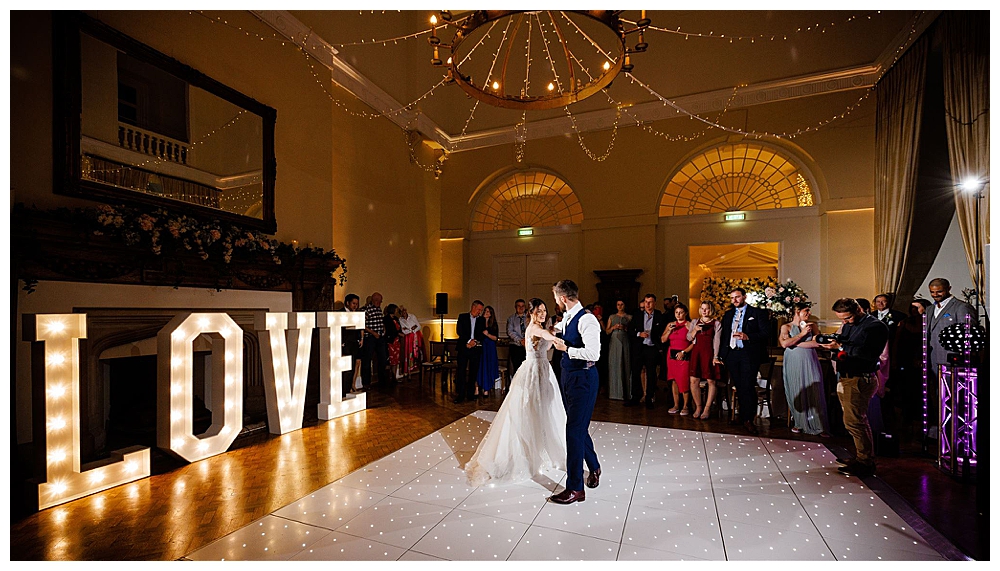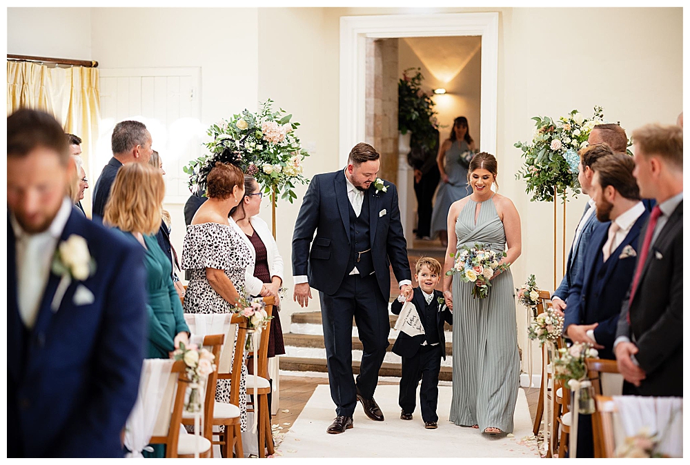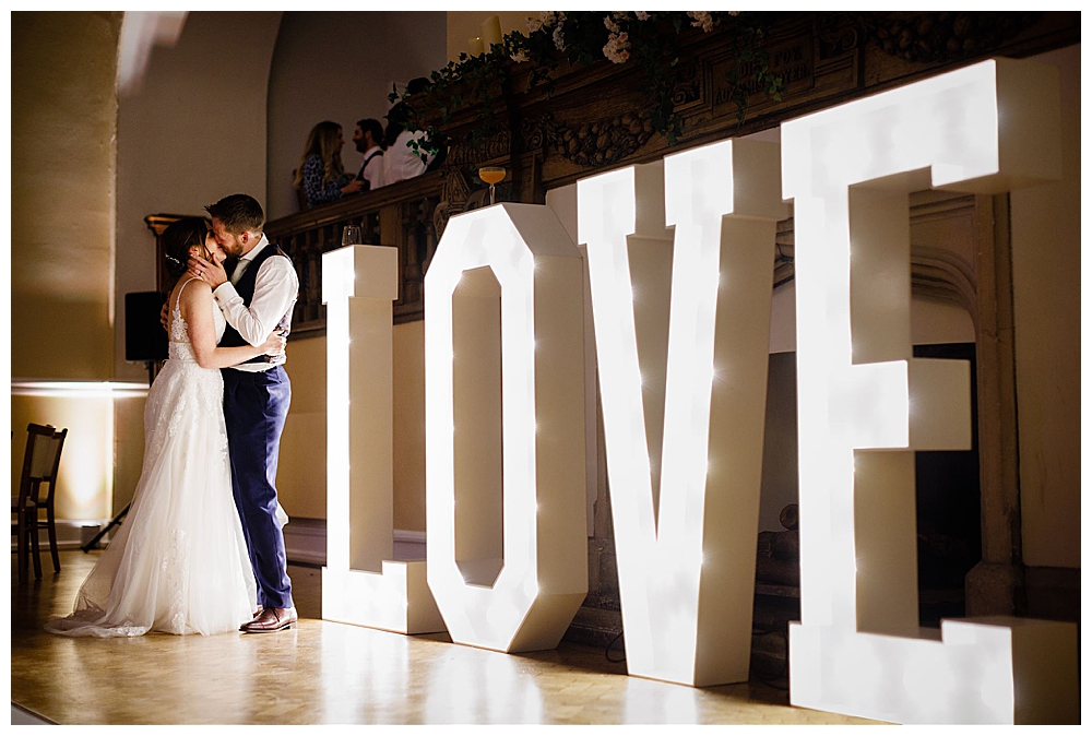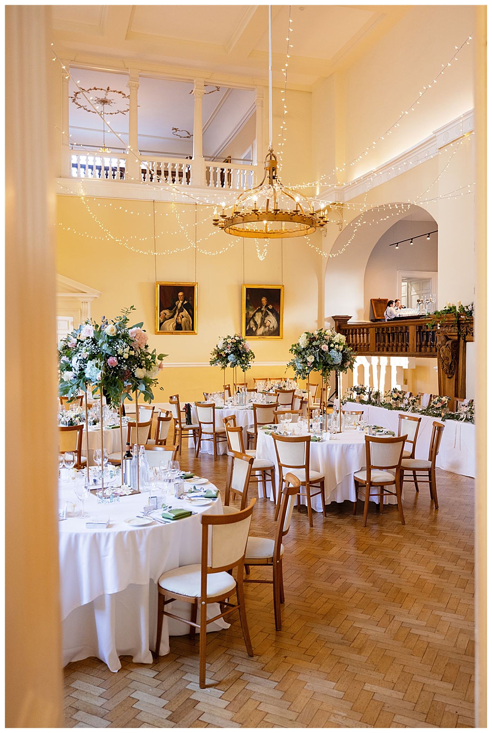 For the wedding breakfast in the Great Hall, the dusty blue and pink combination with lots of foliage looked really lovely with the table napkins styling. The top table was dressed with the bridesmaids bouquets and the chair flower posies, connected by lovely trailing foliage, while the rest f the guest tables were styled with a mix candlelit wreaths and tall geometric stands centrepieces from the ceremony room. The pièce de résistance was a beautiful long floral display for the grand mantlepiece behind the top table, extended all the way to the edges with trailing foliage and candles – such a beautiful backdrop to the top table, especially during speeches.