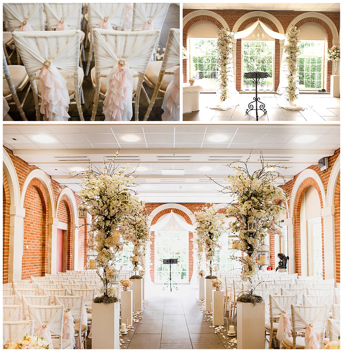 For their mid summer wedding at Great Fosters, in Surrey, Laura and Michael opted for an indoor wedding ceremony in the Orangery, with the reception naturally held in the beautiful Tithe Barn. Our blossom flower trees came into their own down the aisle, creating a magical space, while for the ceremony, we created an ethereal part-arch part-canopy structure to showcase the wedding ceremony area. The white Chiavari chairs, supplied by Host With Style, were dressed with blush & ivory mermaid tails and luxury broaches which really transformed and elevated the seating.