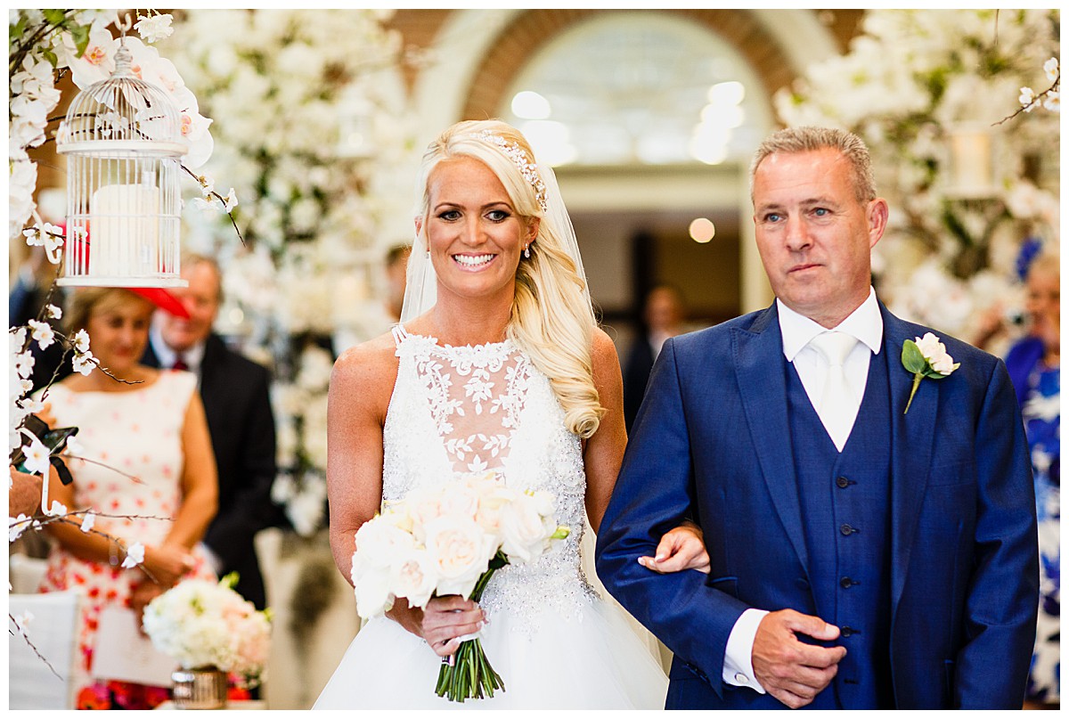 The list of luxury wedding flowers at this wedding didn’t stop there. For the wedding breakfast, Laura and Michael wanted the barn to look quite different and opted for more polished and luxurious table centrepieces, bursting with gorgeous ivory and blush summer blooms undiluted by any foliage for a really opulent look. Tall centrepieces draping with pearls strands dressed the tables in the high part of the barn, while romantic candle-lit clusters of low vases and candles with pearl details, dressed the tables under the eaves of the barn.