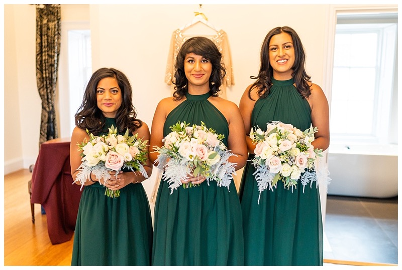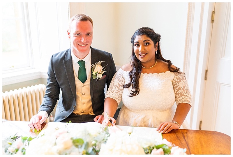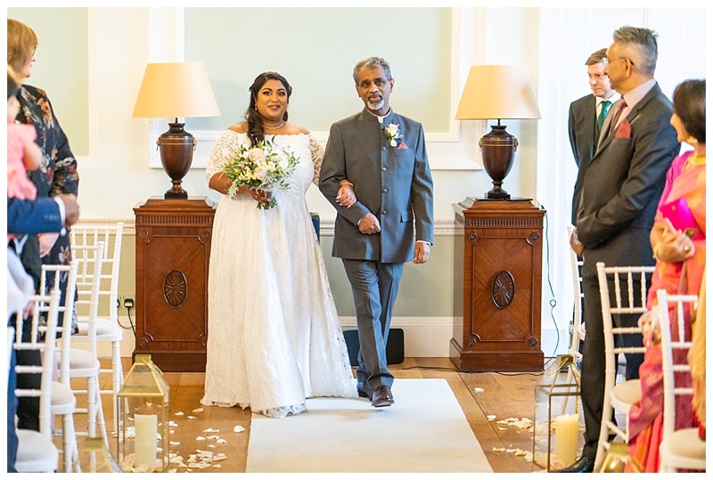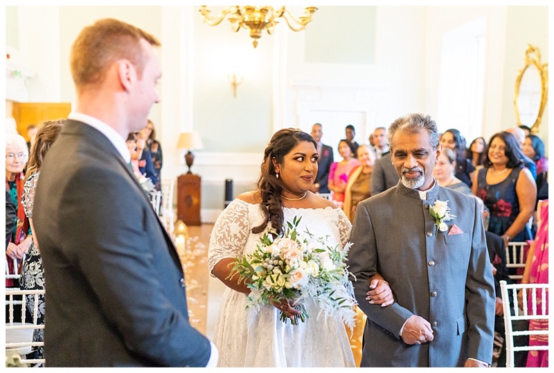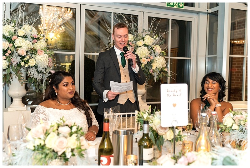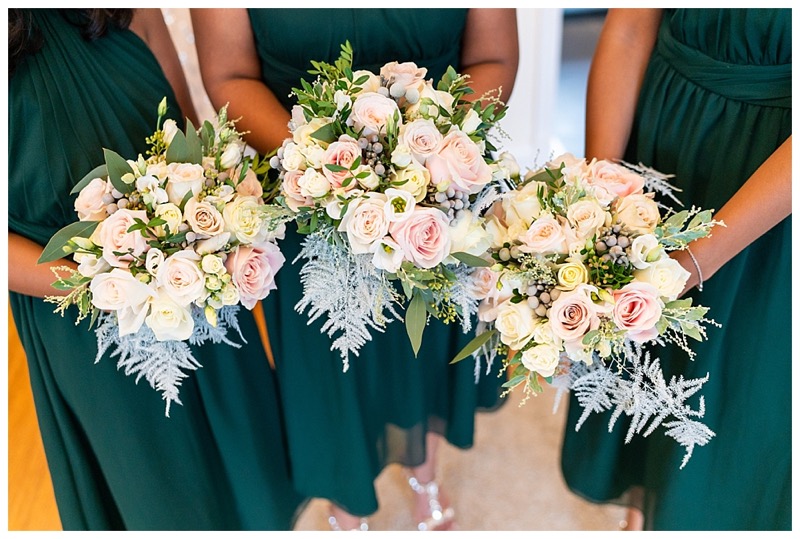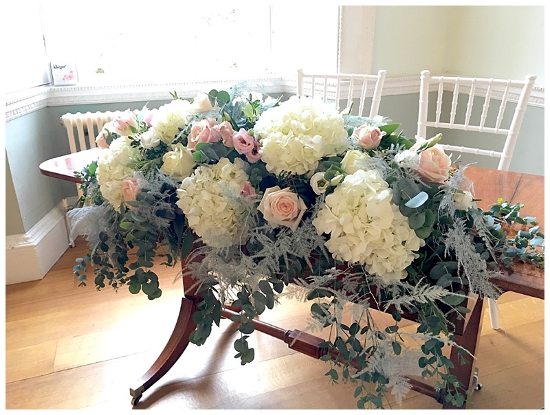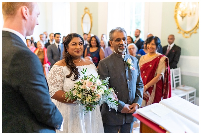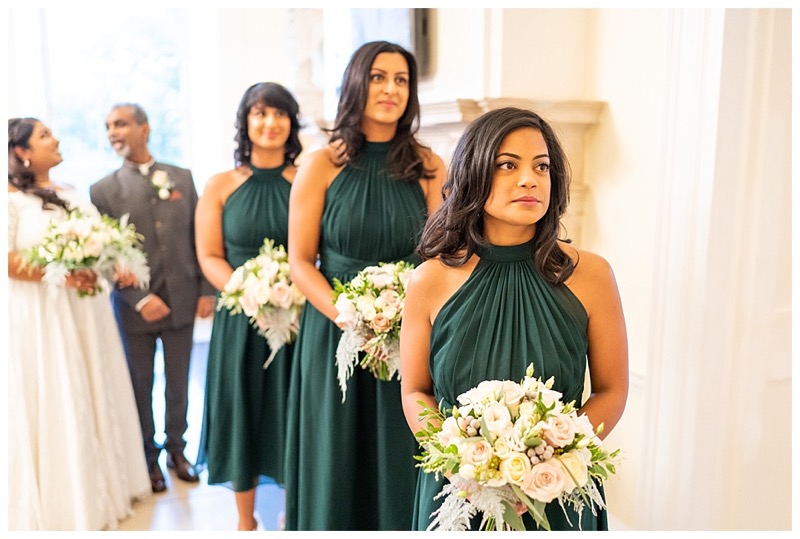 Nishali and Chris undoubtedly deserve the badge of most chilled out couple of the year. From the moment I met them to discuss their wedding flowers plans, to the wedding day and beyond, they remanned refreshingly focused on just having a lovely and laid back wedding. Nishali’s bridesmaids wore deep emerald green dresses, so Nishali opted for a soft colour palette for flowers, of ivory, nude and blush pinks, with touches of winter ferns. The best woman, one of Chris’ close friends from way back, wore a matching dress and opted for a pretty wrist corsage to match the bridesmaids bouquets. Chris and his ushers opted for nude pink Quicksand rose buttonholes with winter ferns.