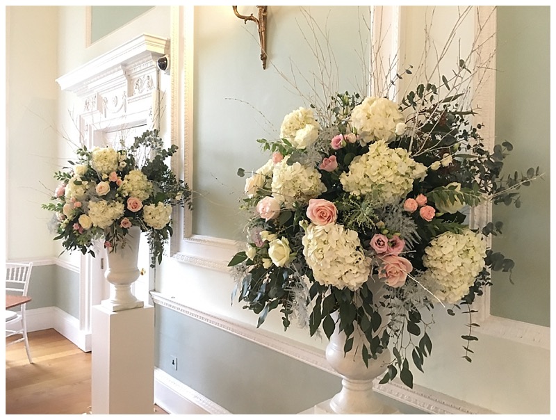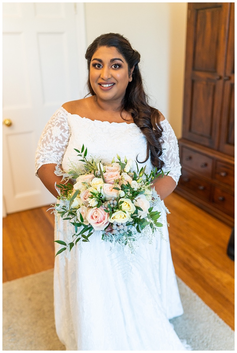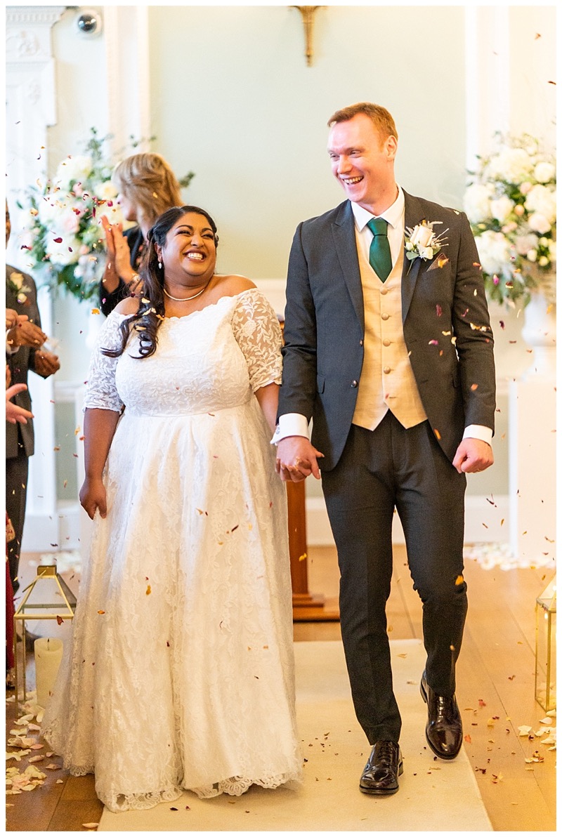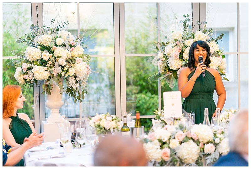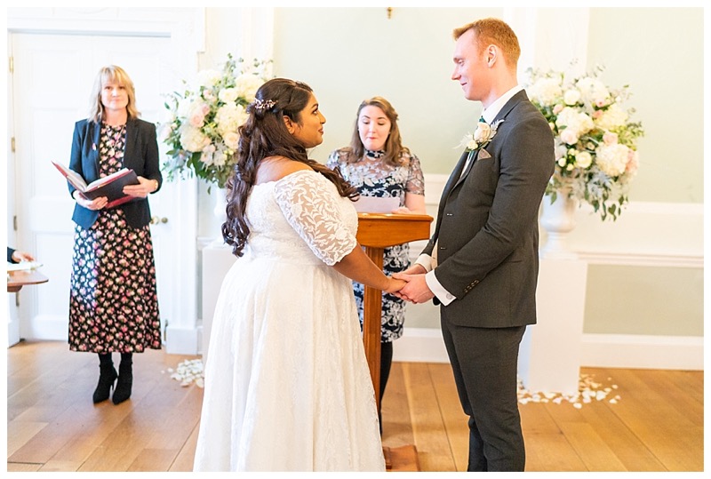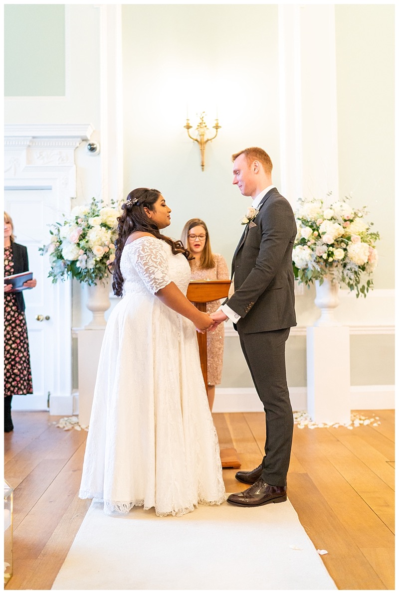 Nishali and Chris undoubtedly deserve the badge of most chilled out couple of the year. From the moment I met them to discuss their wedding flowers plans, to the wedding day and beyond, they remanned refreshingly focused on just having a lovely and laid back wedding. Nishali’s bridesmaids wore deep emerald green dresses, so Nishali opted for a soft colour palette for flowers, of ivory, nude and blush pinks, with touches of winter ferns. The best woman, one of Chris’ close friends from way back, wore a matching dress and opted for a pretty wrist corsage to match the bridesmaids bouquets. Chris and his ushers opted for nude pink Quicksand rose buttonholes with winter ferns.