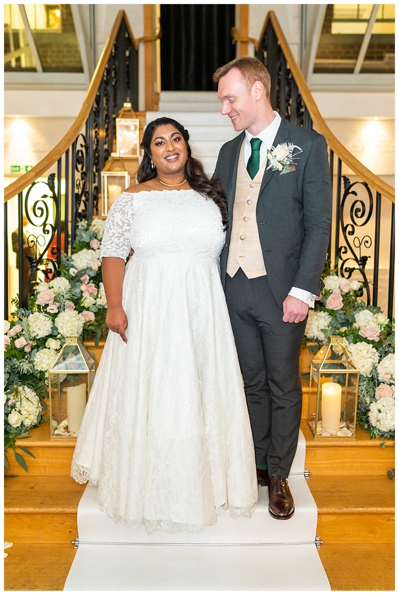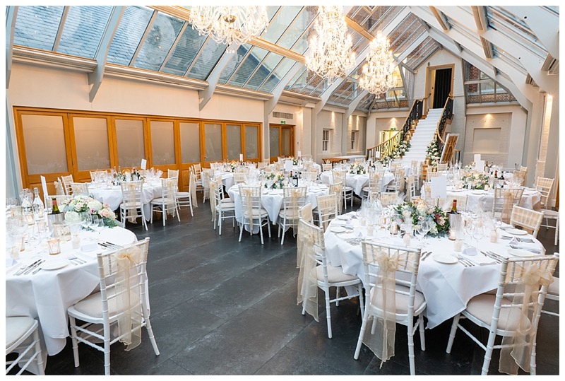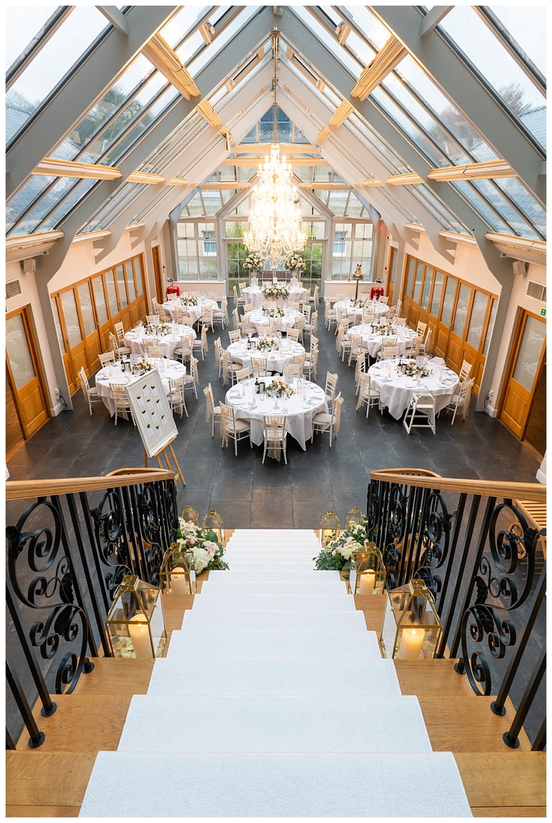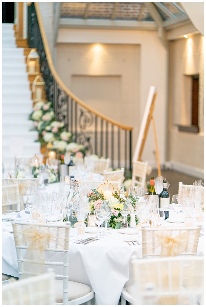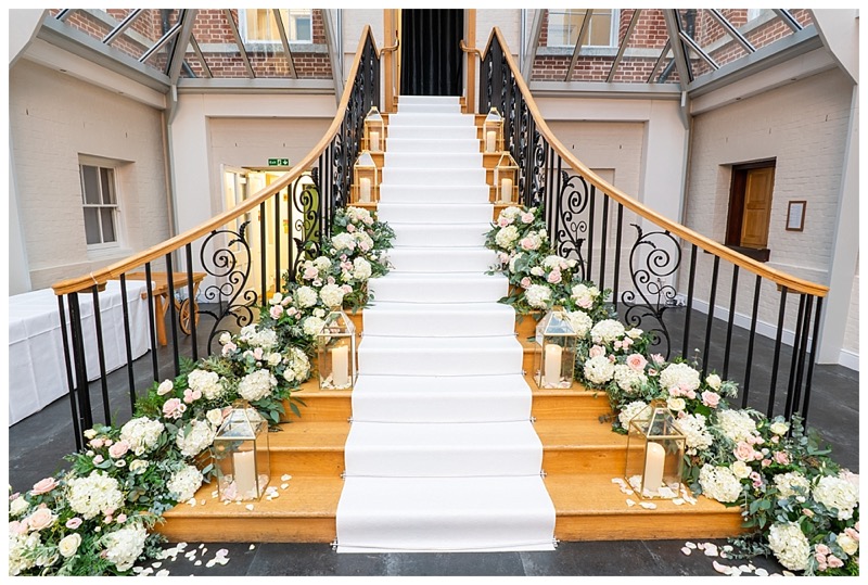 Nishali and Chris wanted to somehow integrated their theme of Disney fairytales into their floral decor – we did this by building floral displays around Nishali’s golden princess carriages candle holders, for all the guest tables in the Atrium. Nishali and Chris opted for Display fairy tales themed wedding table names to further build on their theme. The long display from the ceremony table was reused as a top table display, and the 2 statement displays from the ceremony area were used to beautifully flank the top table throughout the wedding breakfast. The gold lanterns from the ceremony aisle were repurposed to dress the upper steps down to the atrium, while the lower steps were dressed with beautiful floral displays.