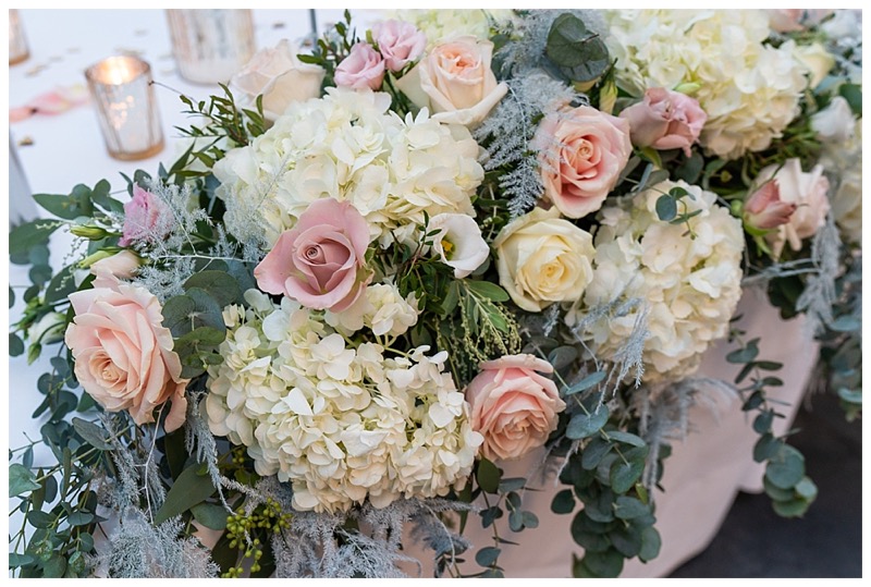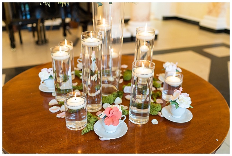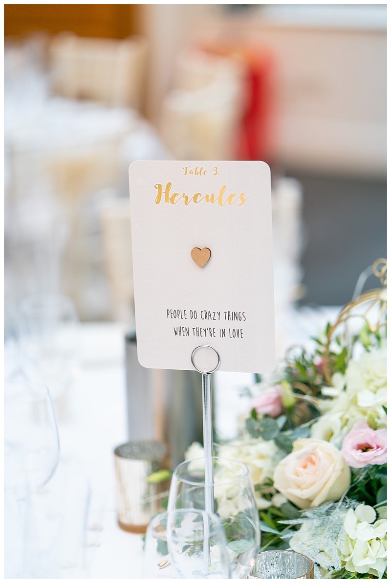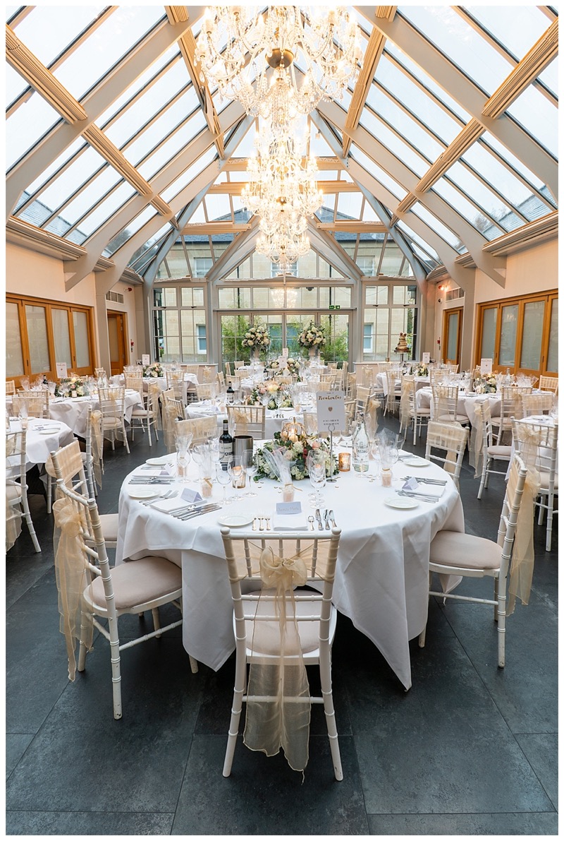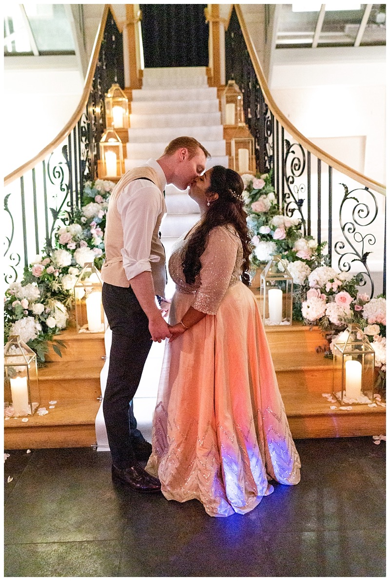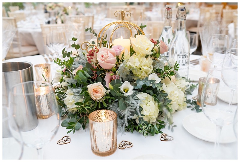 Nishali and Chris wanted to somehow integrated their theme of Disney fairytales into their floral decor – we did this by building floral displays around Nishali’s golden princess carriages candle holders, for all the guest tables in the Atrium. Nishali and Chris opted for Display fairy tales themed wedding table names to further build on their theme. The long display from the ceremony table was reused as a top table display, and the 2 statement displays from the ceremony area were used to beautifully flank the top table throughout the wedding breakfast. The gold lanterns from the ceremony aisle were repurposed to dress the upper steps down to the atrium, while the lower steps were dressed with beautiful floral displays.