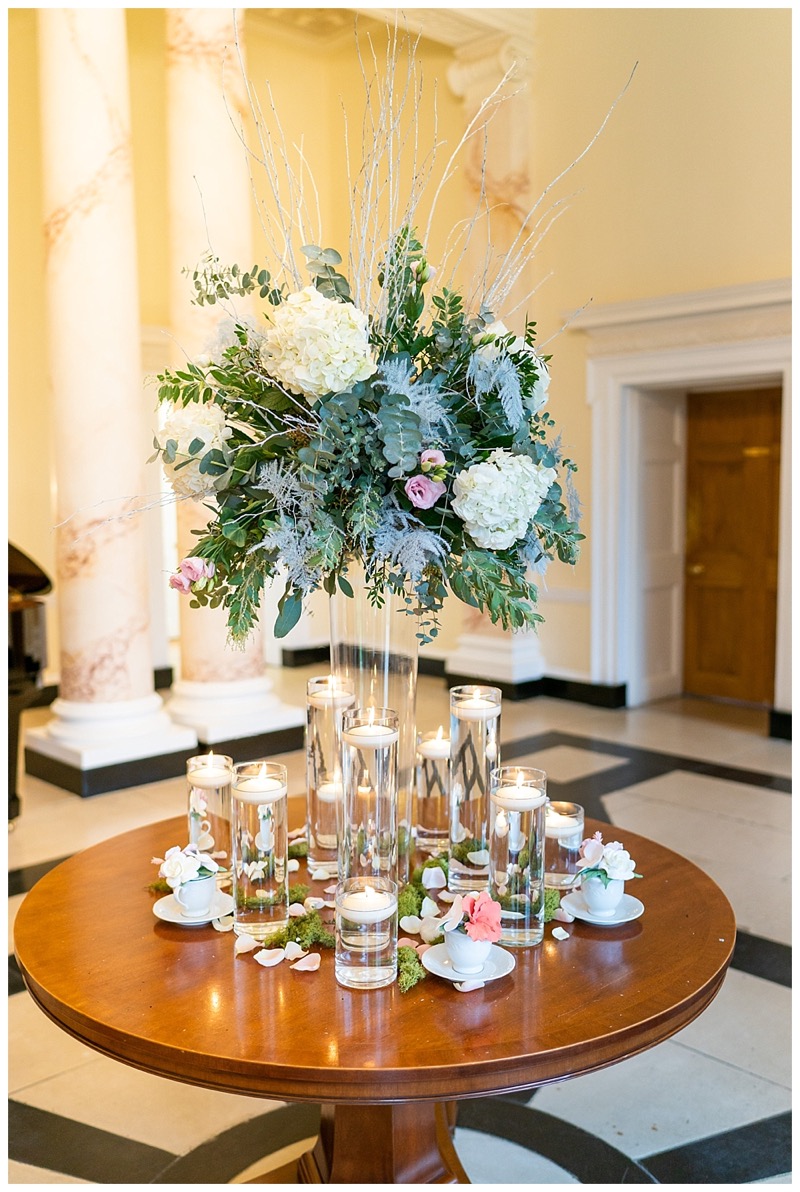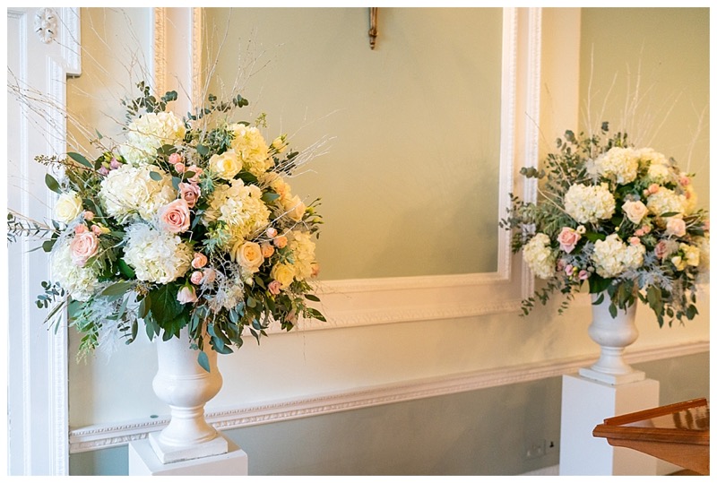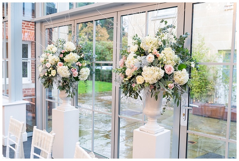Welcoming guests to the venue was a clustering of floating candle vases and a central tall display, on the table in the entrance hall. The ceremony was held at Botleys Mansion in the gorgeous Green Room. This was dressed with two statement floral ceremony displays and a trailing long display on the ceremony table, all in softest ivory and blush shades, with winter white ferns. Gold geometric lanterns and rose petals scatter down the aisle finished off the decor.