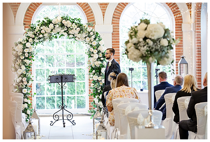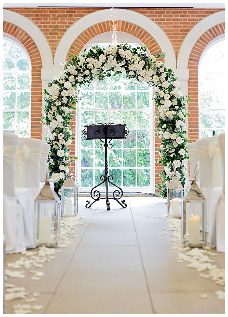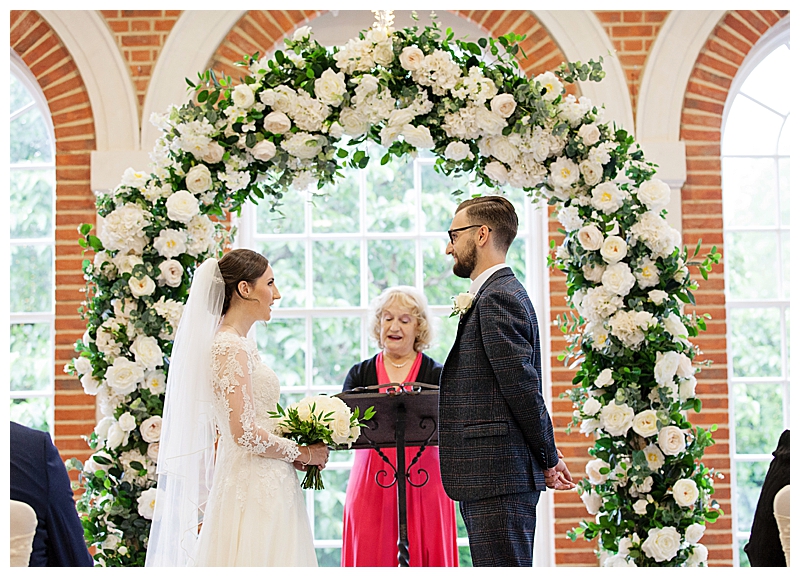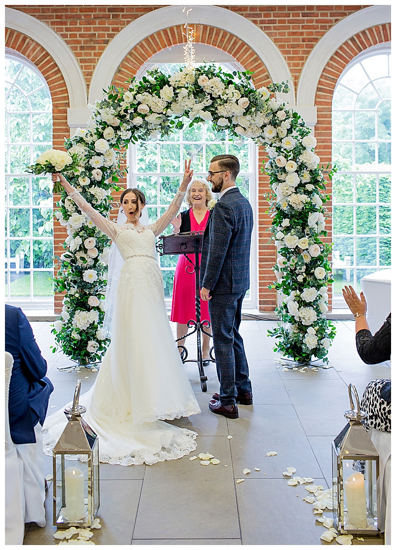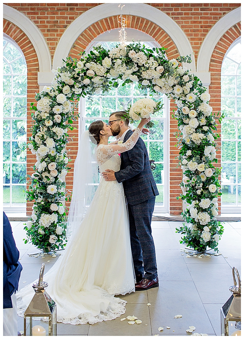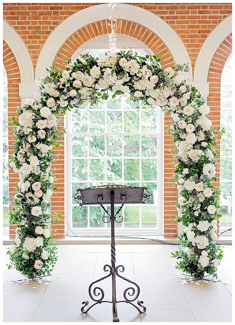 This classically beautiful ivory white wedding was initially meant to be in October 2020 but due to the C word that we won’t mention was rearranged to sunnier times, giving Jess & Jordan a sunny and beautiful wedding day. The 1 year delay also meant that she got to have our newly constructed beautiful floral arch for her wedding, and I’m so glad that she did as it looked absolutely gorgeous against the similarly shaped feature windows in Great Fosters’ Orangery, during the ceremony.