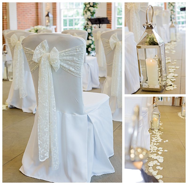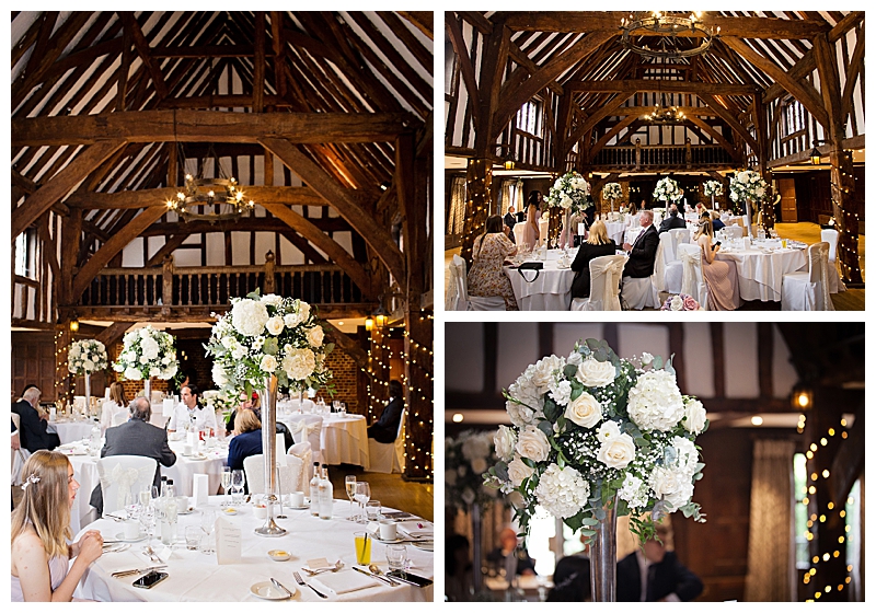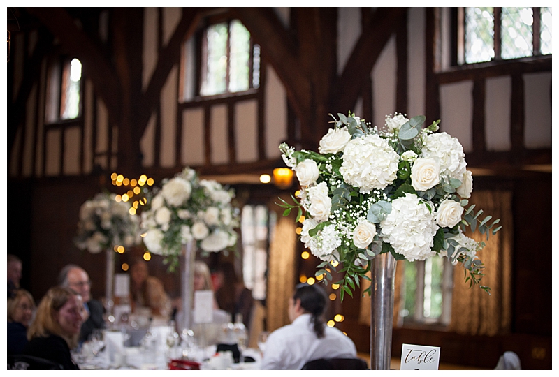 The wedding ceremony and reception were both held at Great Fosters, the ceremony in the beautifully light Orangery, and the reception in the atmospheric and cosy but grant Tithe Barn – both spaces looked simply stunning with the classic all ivory white wedding flowers and the feature arch was the pièce de résistance. For the wedding aisle, Jess chose covered chairs classical styled with lace bows from Host With Style, and we added pretty silver lanterns and rose petals scatter down the aisle – the lanterns were later reused at the bottom of the long top table adding to the ambiance in the Tithe Barn. Carrying on with the silver theme, some of the tall dramatic table centrepieces, with hydrangeas, roses and gypsophila flowers, on tall elegant silver vases, were used to flank the back of the wedding aisle.