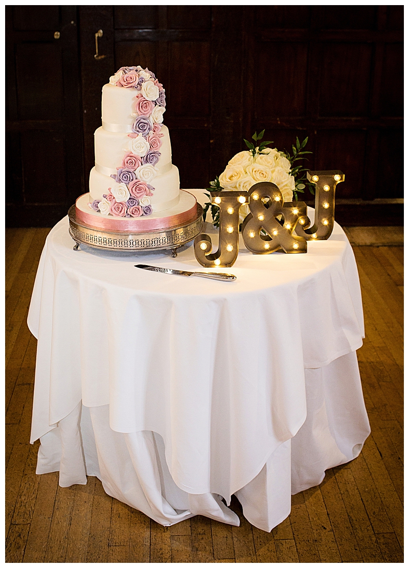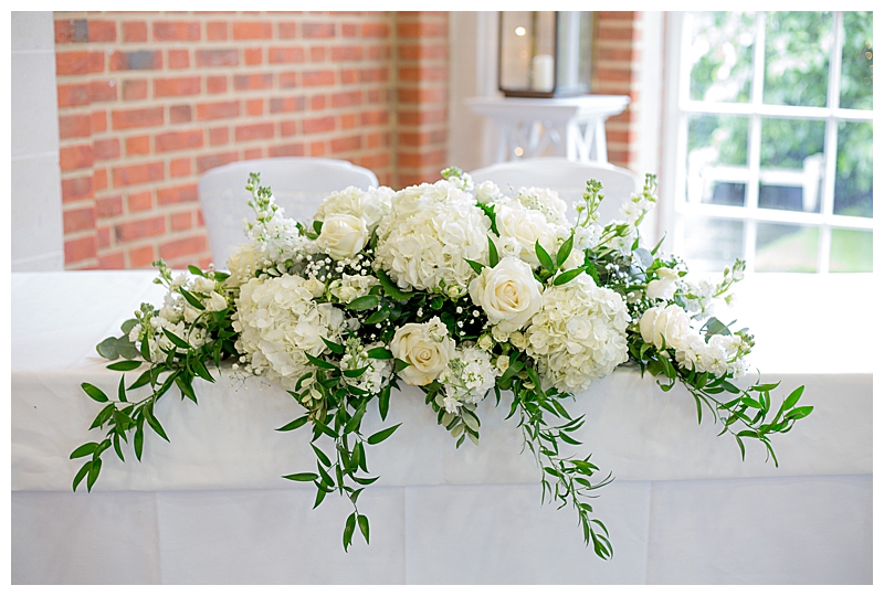 Last but not least, the ceremony table display, later reused on the top table, was a pretty mix of Jess’s favourite flowers, roses, hydrangeas and gypsophila with long arching soft ruscus foliage.