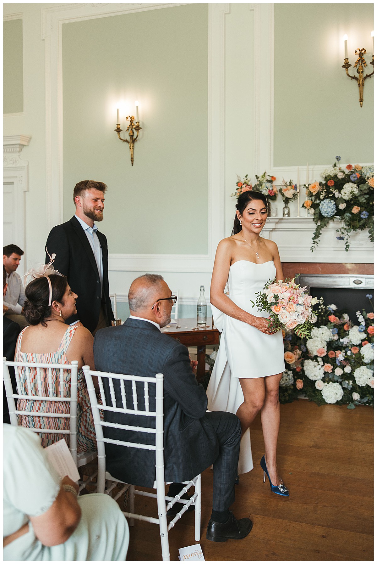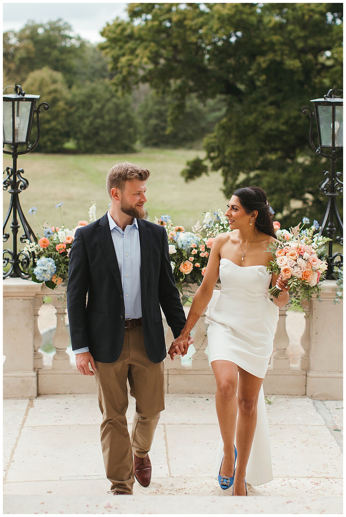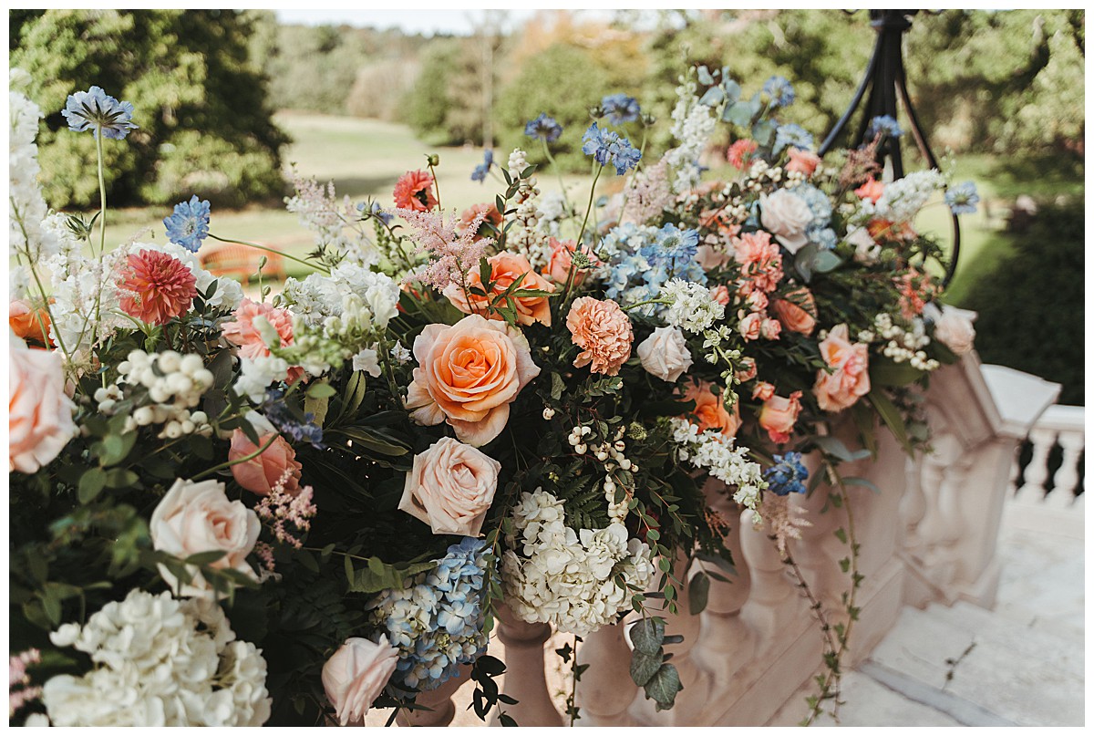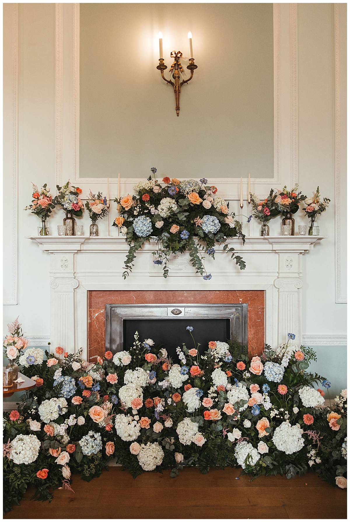 Jess & Nick’s big 2-days started off with a blessing ceremony – with more guests than I’ve ever seen filling up the Green Room at this Indian wedding at Botleys Mansion, we opted to have the ceremony facing the beautiful fireplace with long curved rows of seats being laid out amphitheatre style to maximise seating space. We created a semi-circle floral meadow in front of the mantlepiece, to surround Jess & Nick as they were saying their vows, and added pretty florals to the mantlepiece. To echo the beautiful gold wall lights and chandelier in the Green Room, we used gold vases and candlesticks to create a warm colour effect, perfectly complementing the delicate ivory, blush, apricot, pale coral and pale blue colour scheme. Jess wore a sexy short dress with drop-dead-gorgeous blue shoes and the pair really looked a million dollars and absolutely slayed! The rest of the day was spend on a fun outdoor Mendhi party in the Temple bar wing, with Indian street food and packing in many traditional customs, and finished with a Jaggo ceremony. During the Jaggo the relatives danced with pots on their heads decorated with oil candles (Jaggo literally translates to “wake-up” and this event would have historically happened by alerting the village at night about the upcoming wedding).