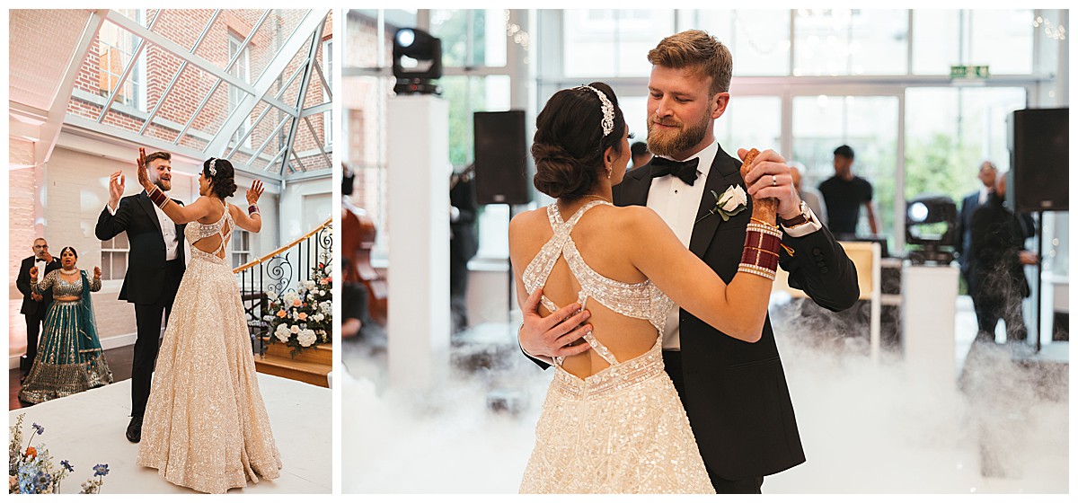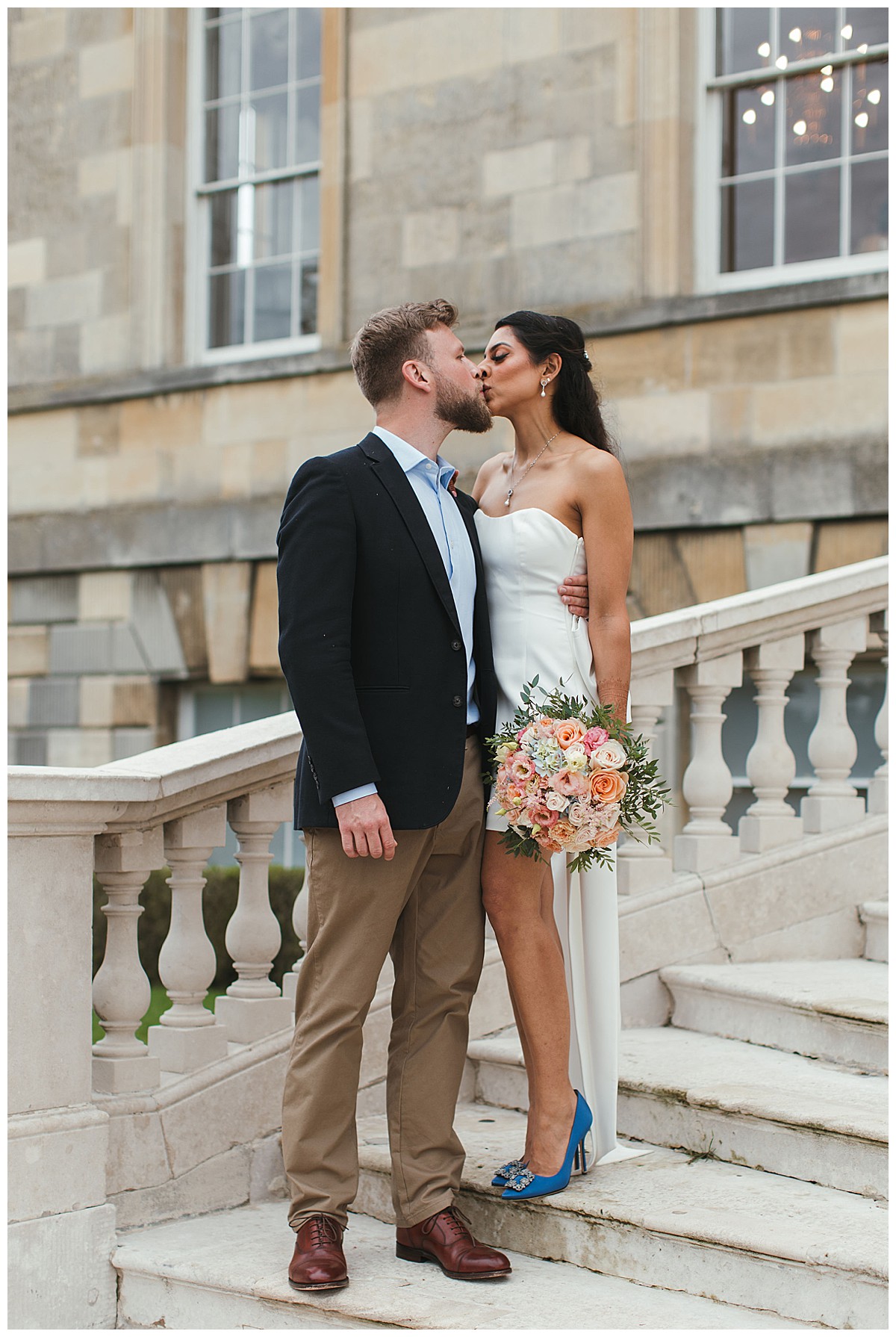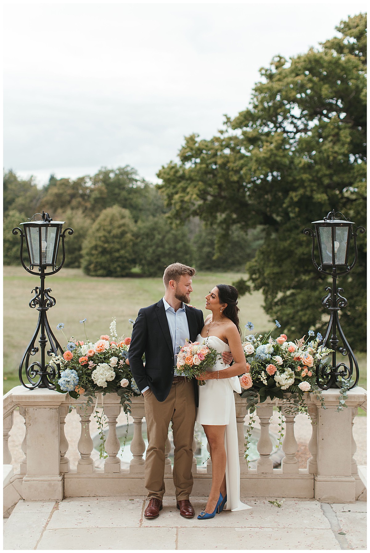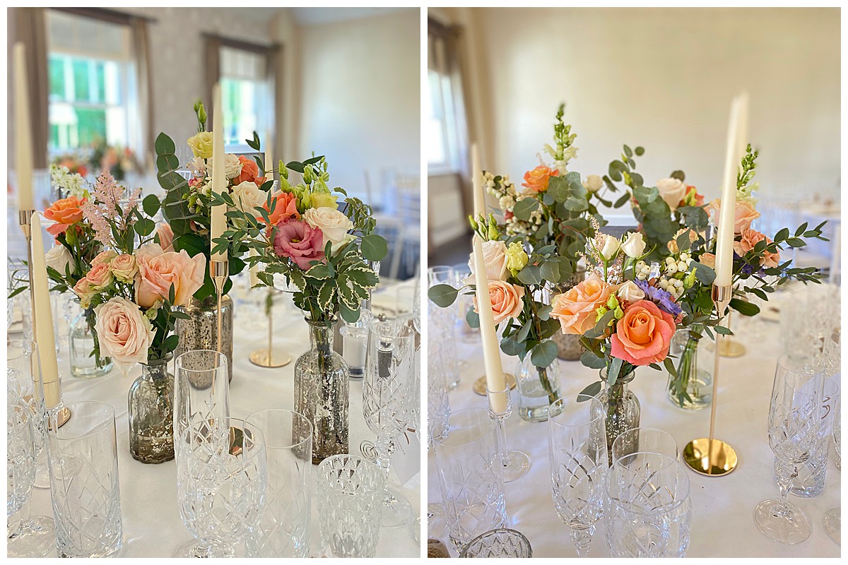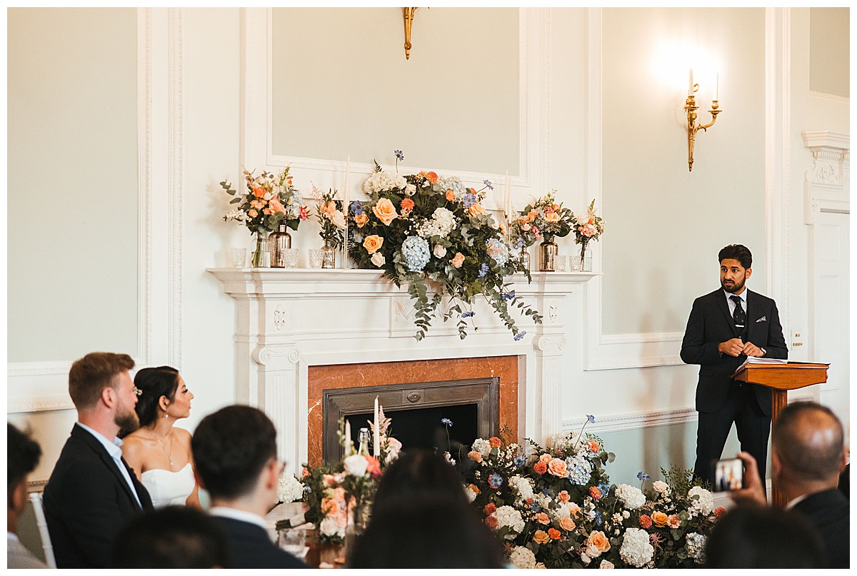 Jess & Nick’s big 2-days started off with a blessing ceremony – with more guests than I’ve ever seen filling up the Green Room at this Indian wedding at Botleys Mansion, we opted to have the ceremony facing the beautiful fireplace with long curved rows of seats being laid out amphitheatre style to maximise seating space. We created a semi-circle floral meadow in front of the mantlepiece, to surround Jess & Nick as they were saying their vows, and added pretty florals to the mantlepiece. To echo the beautiful gold wall lights and chandelier in the Green Room, we used gold vases and candlesticks to create a warm colour effect, perfectly complementing the delicate ivory, blush, apricot, pale coral and pale blue colour scheme. Jess wore a sexy short dress with drop-dead-gorgeous blue shoes and the pair really looked a million dollars and absolutely slayed! The rest of the day was spend on a fun outdoor Mendhi party in the Temple bar wing, with Indian street food and packing in many traditional customs, and finished with a Jaggo ceremony. During the Jaggo the relatives danced with pots on their heads decorated with oil candles (Jaggo literally translates to “wake-up” and this event would have historically happened by alerting the village at night about the upcoming wedding).