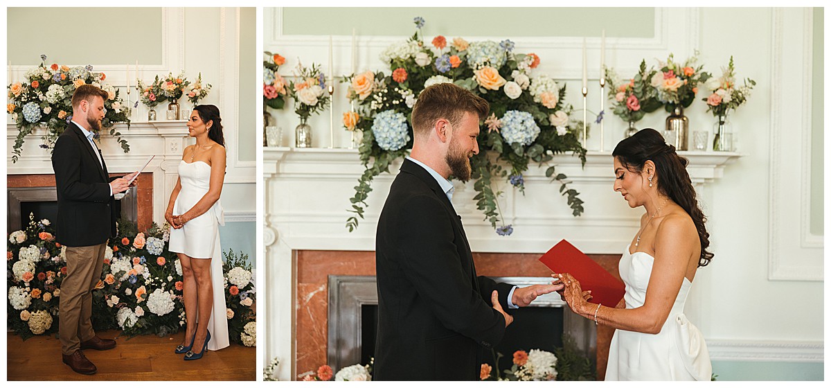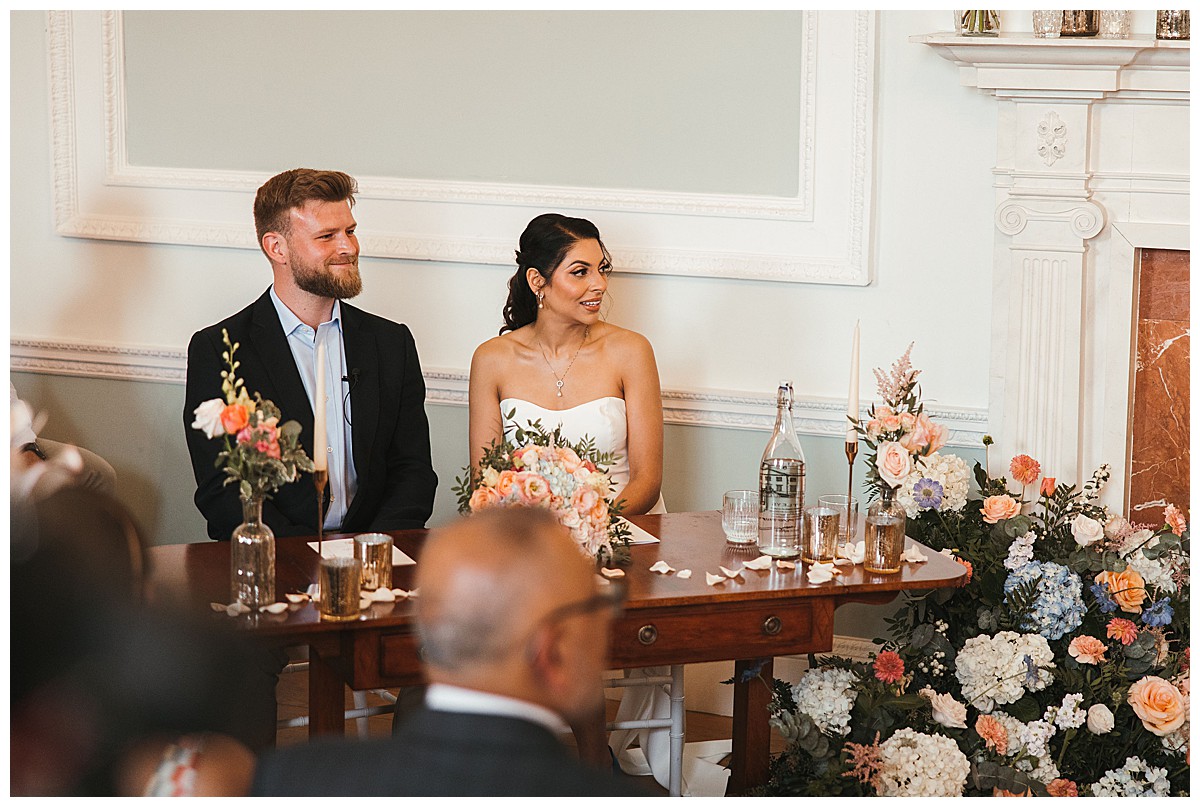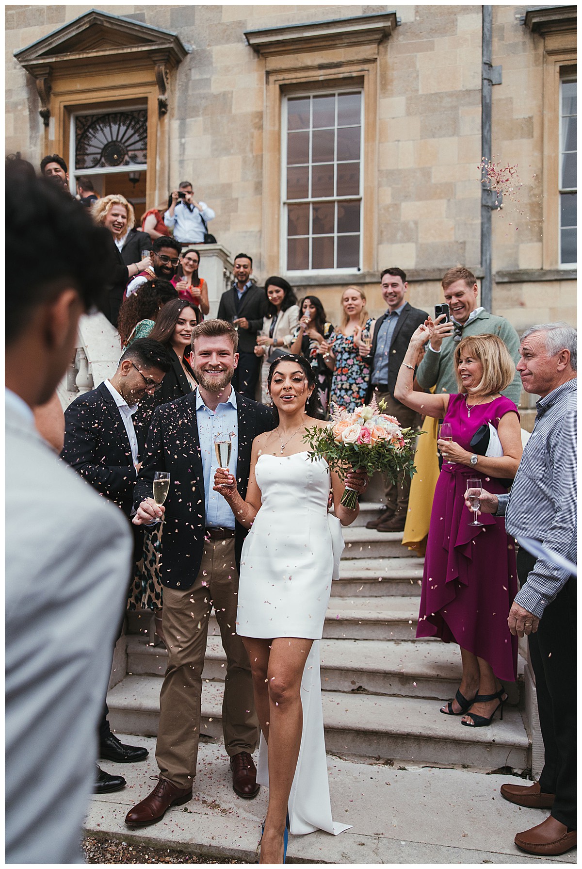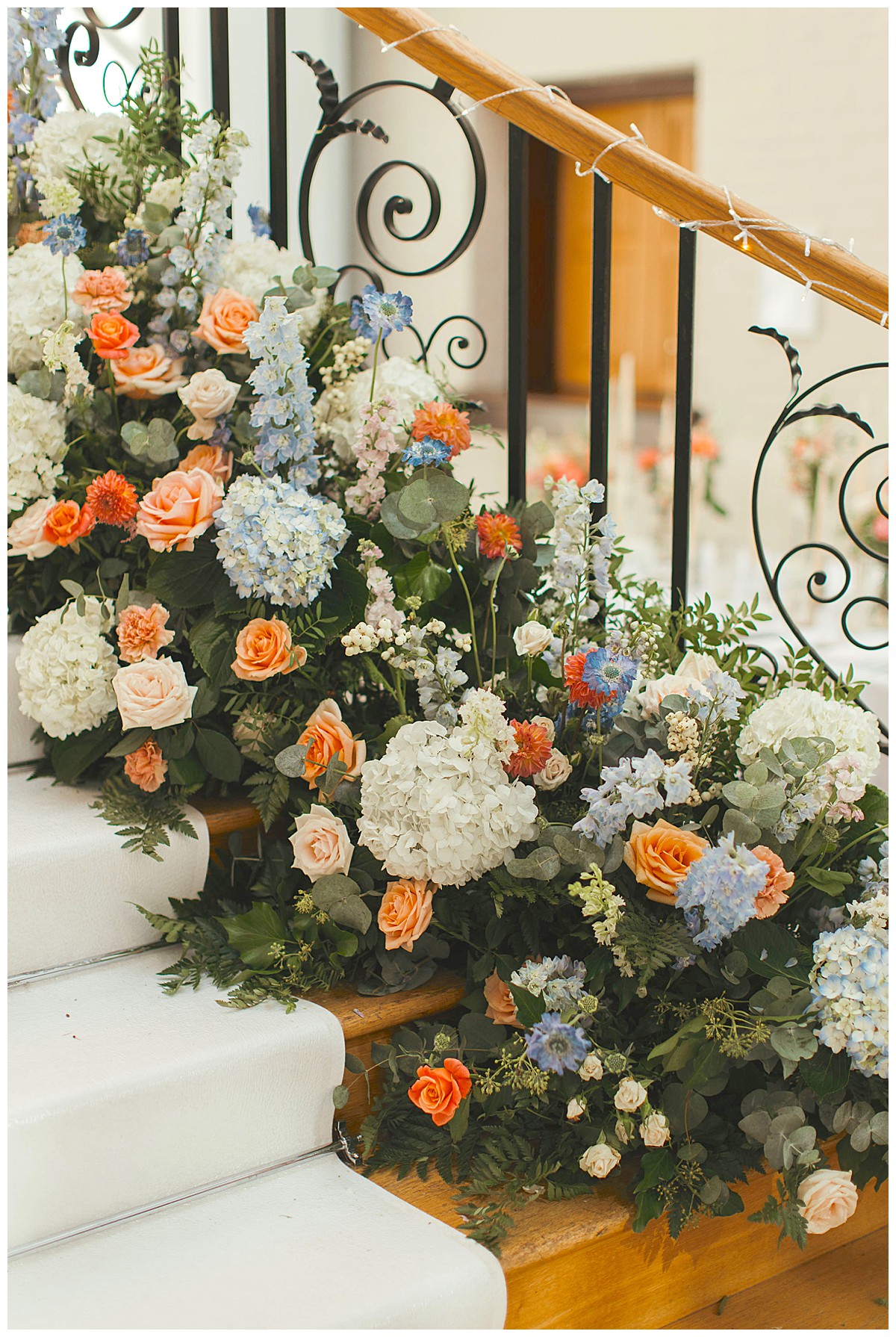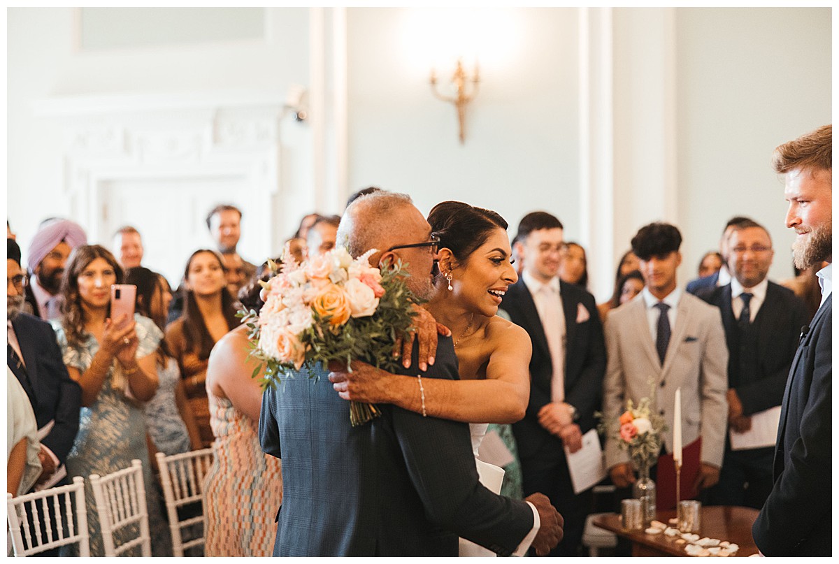 Jess & Nick’s big 2-days started off with a blessing ceremony – with more guests than I’ve ever seen filling up the Green Room at this Indian wedding at Botleys Mansion, we opted to have the ceremony facing the beautiful fireplace with long curved rows of seats being laid out amphitheatre style to maximise seating space. We created a semi-circle floral meadow in front of the mantlepiece, to surround Jess & Nick as they were saying their vows, and added pretty florals to the mantlepiece. To echo the beautiful gold wall lights and chandelier in the Green Room, we used gold vases and candlesticks to create a warm colour effect, perfectly complementing the delicate ivory, blush, apricot, pale coral and pale blue colour scheme. Jess wore a sexy short dress with drop-dead-gorgeous blue shoes and the pair really looked a million dollars and absolutely slayed! The rest of the day was spend on a fun outdoor Mendhi party in the Temple bar wing, with Indian street food and packing in many traditional customs, and finished with a Jaggo ceremony. During the Jaggo the relatives danced with pots on their heads decorated with oil candles (Jaggo literally translates to “wake-up” and this event would have historically happened by alerting the village at night about the upcoming wedding).