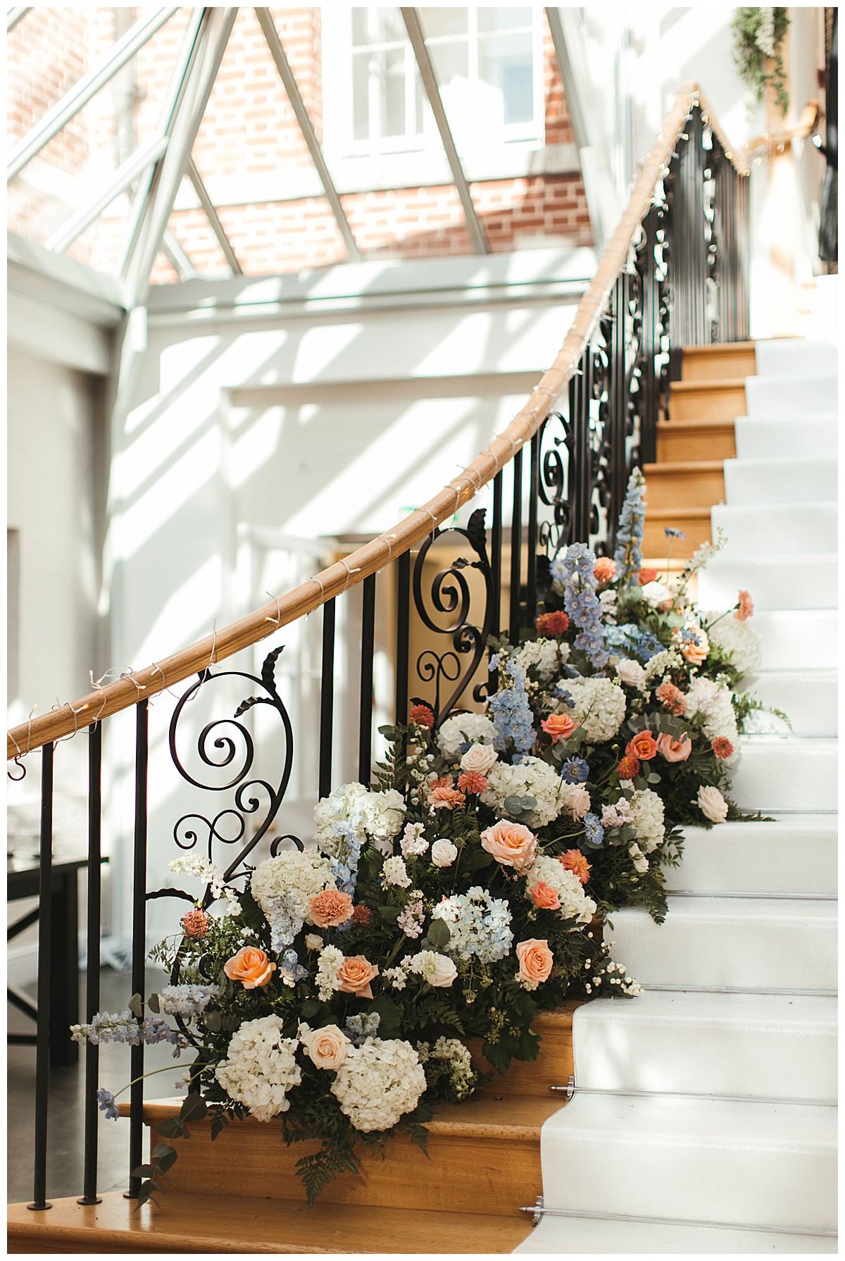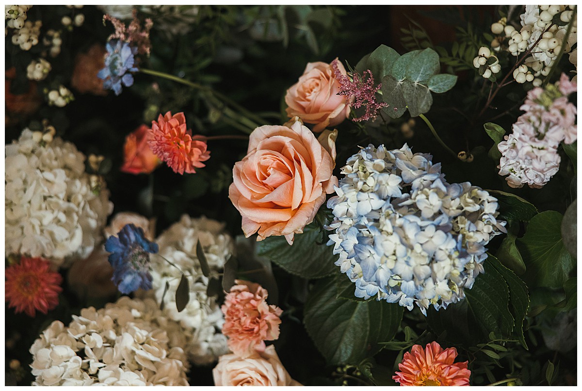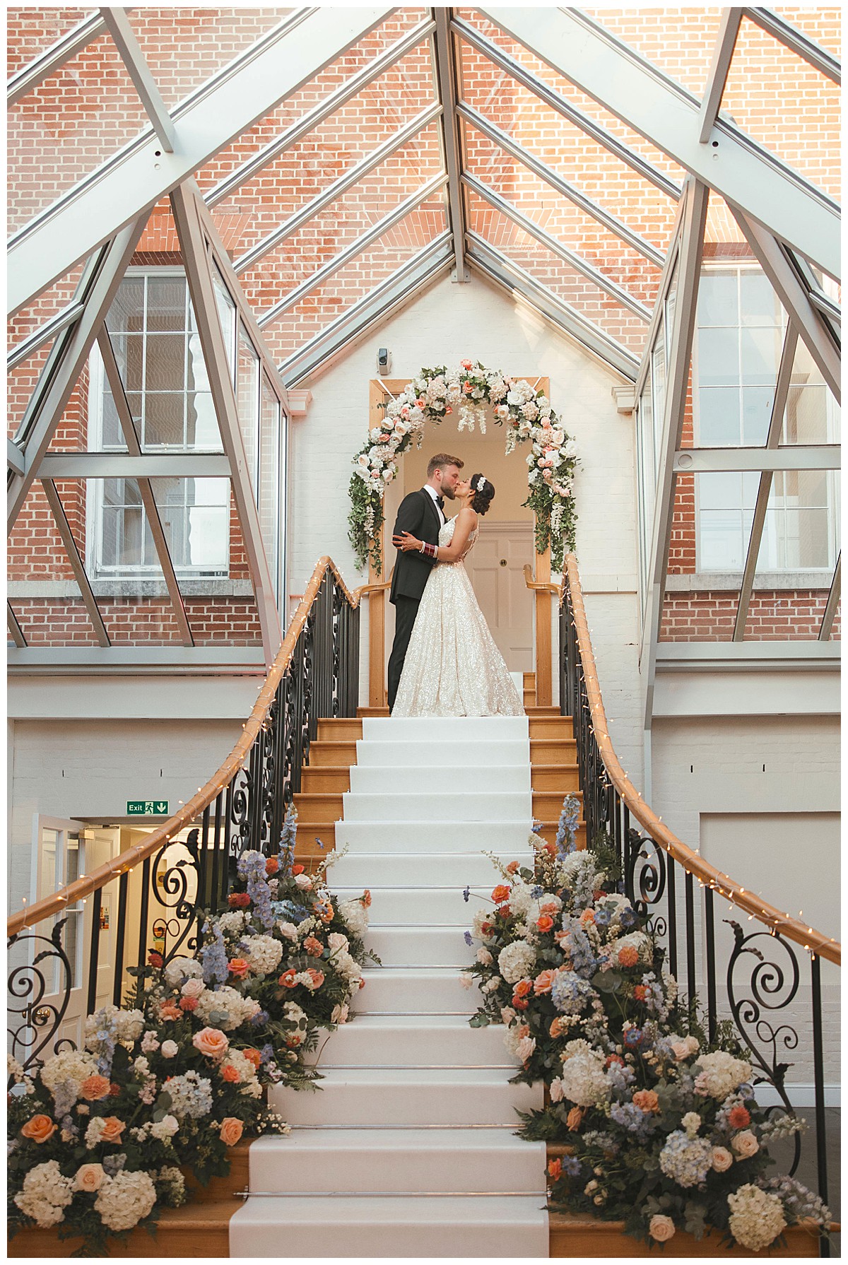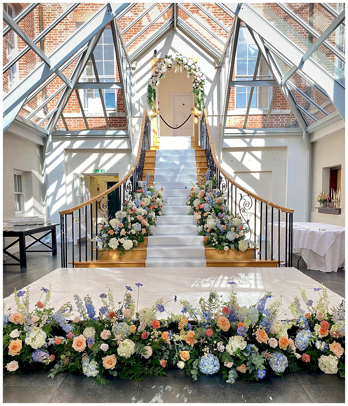 Day 2 commenced early with Jess and Nick getting ready and leaving together with at a very early 8:30 am, for the Sikh ceremony at the Gurdwara Sri Guru Singh Sabha. A couple of hours later, with this completed, 180 odd guests greeted Jess & Nick back at Botleys Mansion for an afternoon of dining and evening of big time partying…. We dressed the many tables with beautiful collections of candles in cylinder vases, votives and gold candlesticks, mixed in amongst pretty flower posies arranged in a relaxed and organic style. The feature of the room was the beautiful arch we created at the top of the stairs, to frame Jess & Nick as they entered the Atrium. A stunning cascade of flowers down the lower stairs visually lead the way down to an amazing floral runner at the bottom of the stage where the top table would be placed later on. The colours looked fantastic with the candlelight! We used a mix of roses, garden roses, blousy hydrangeas, pretty and delicate scabiosa, lisianthus, dianthus and dahlias, and added spired of delicate blue delphiniums to add occasional height to the stairs flowers. So so pleased with the colour blend and the overall effect.