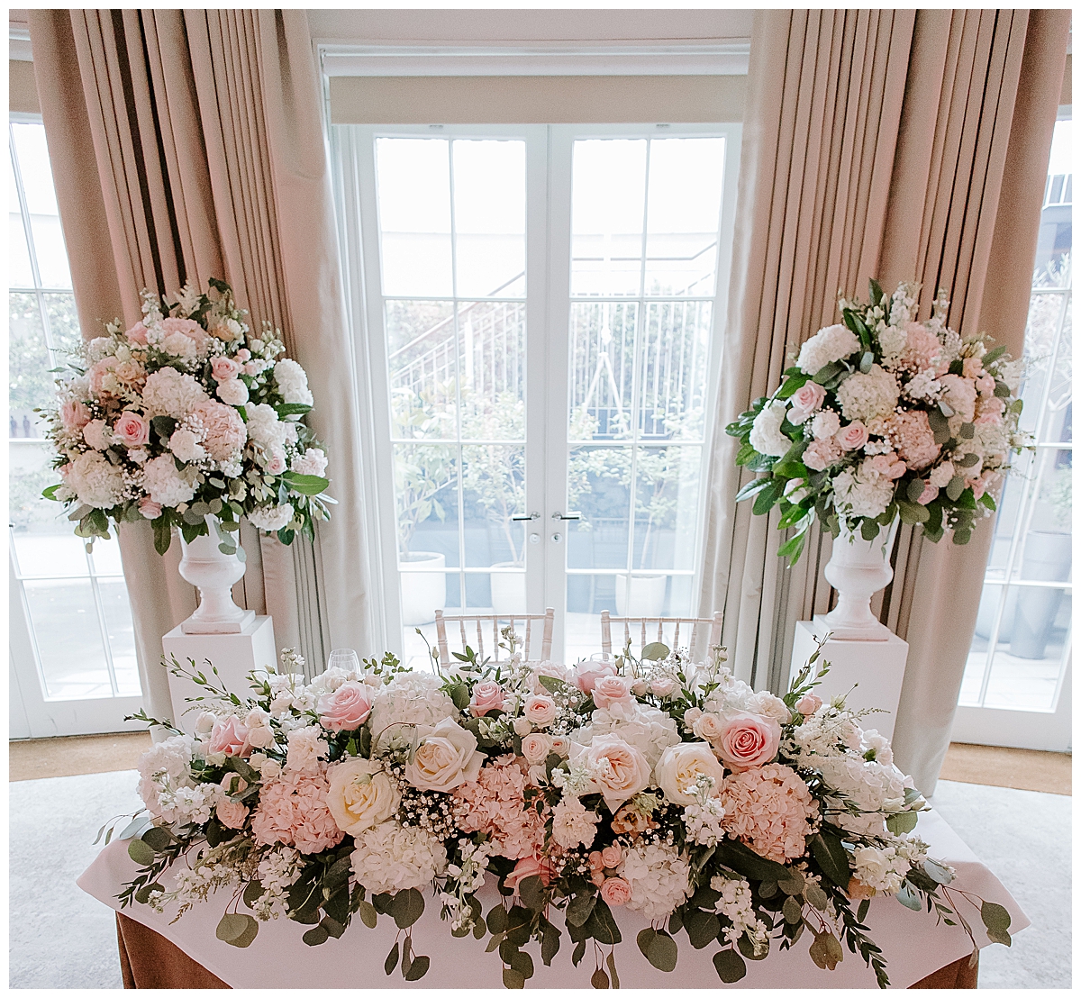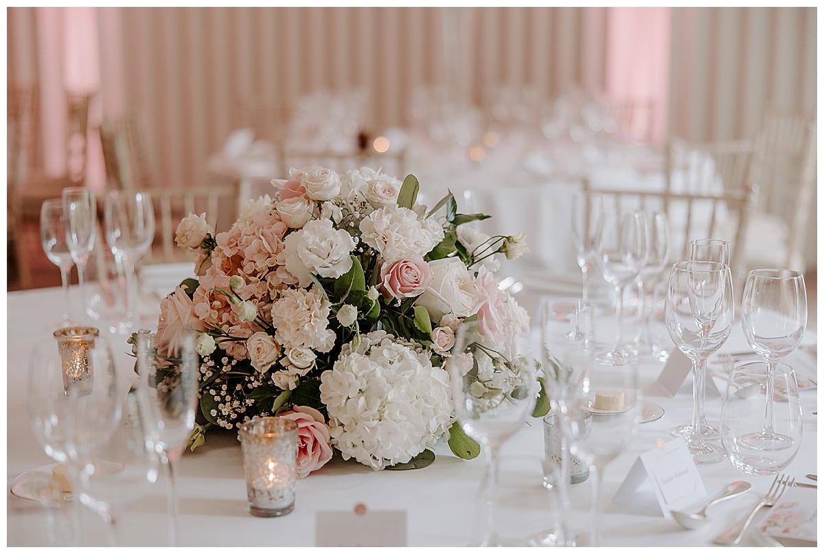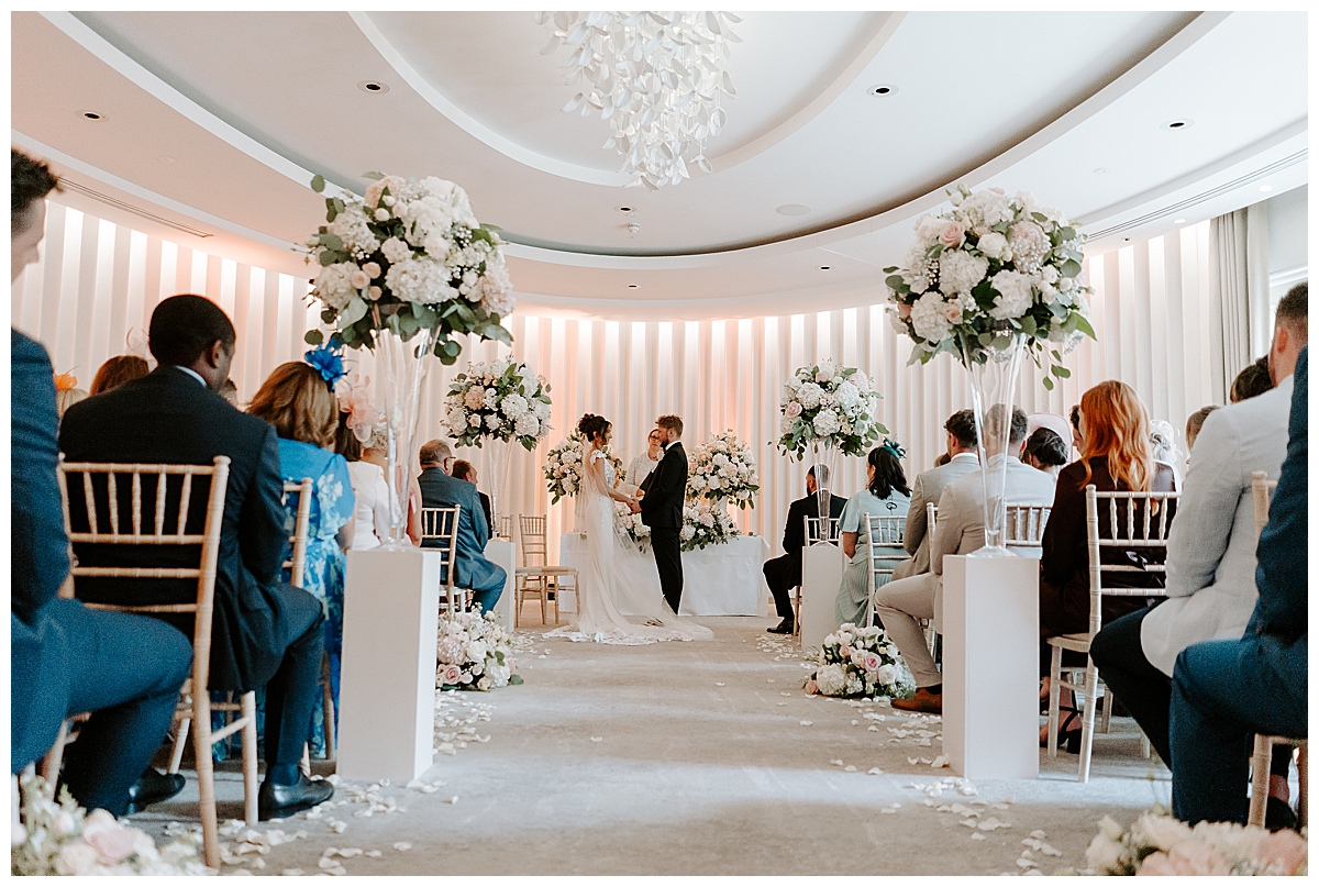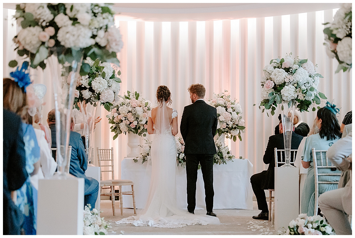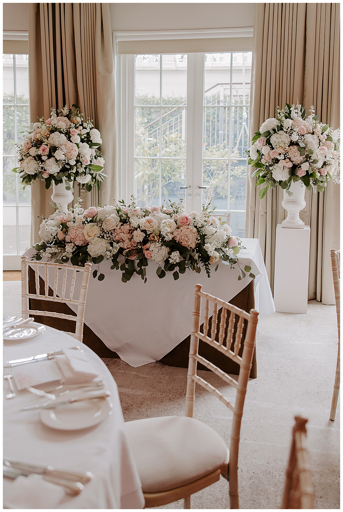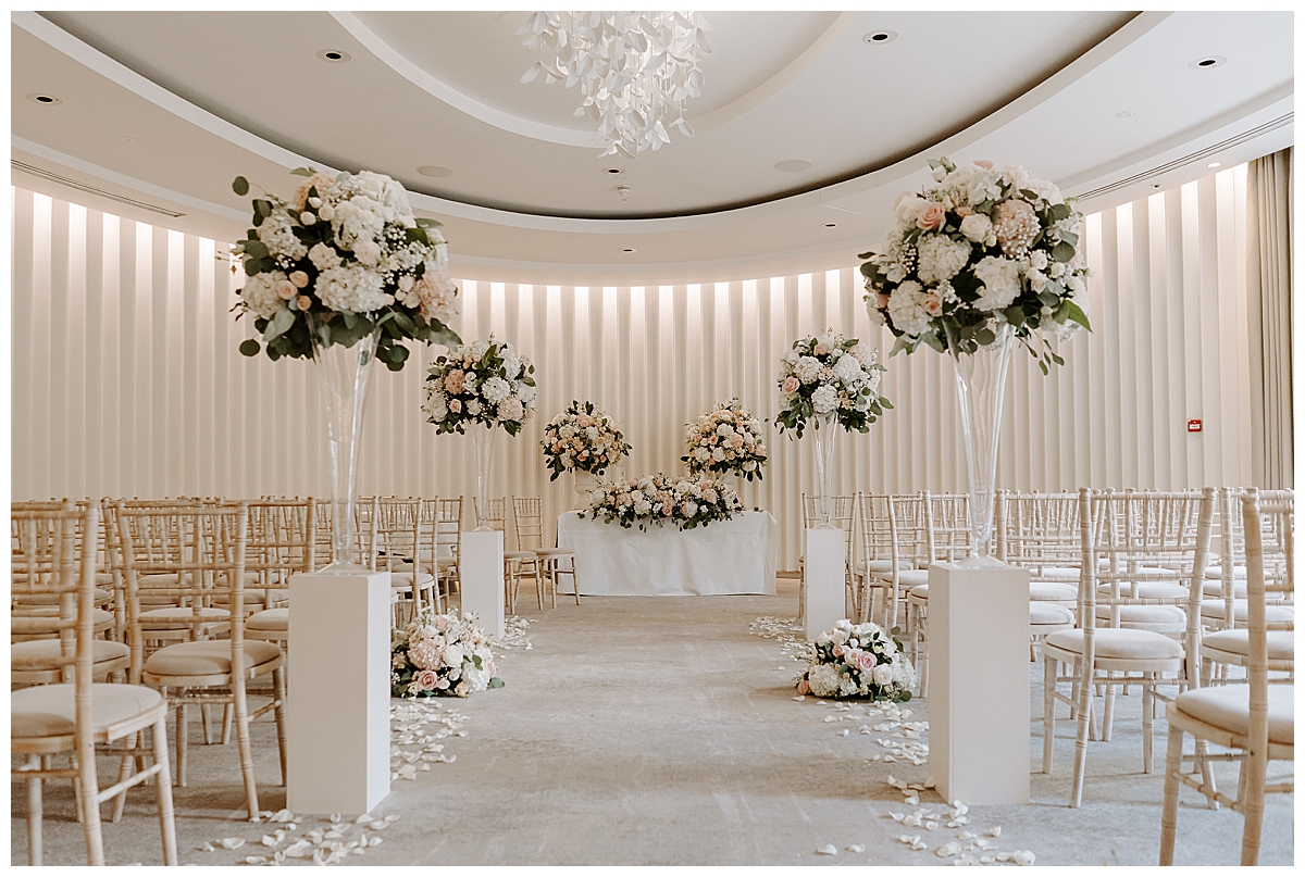 The ceremony was held in the Oval room, after which the guests went outside for photos and the room was turned around and tables laid with luxurious perfection, ready for the wedding breakfast. Since the Oval Suite is a neutral and modern backdrop, Chloe wanted to dress this abundantly with lots of luxury wedding flowers. We used our plinths to place the tall guest table centrepieces on them during the ceremony, and even the low guest table centrepieces were first used as floor meadows, down the aisle, at floor level. Two gorgeously blousy statement floral urns created a beautiful backdrop for the ceremony and were later repurposed to give the same big-bang impact behind the top table. Last but not least, the ceremony table was dressed with an amazing floral display bursting with all of Chloe’s favourite flowers.