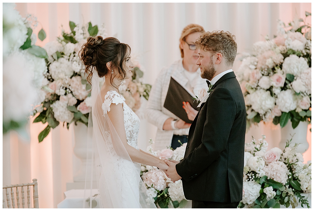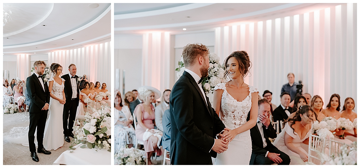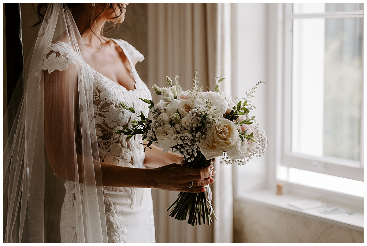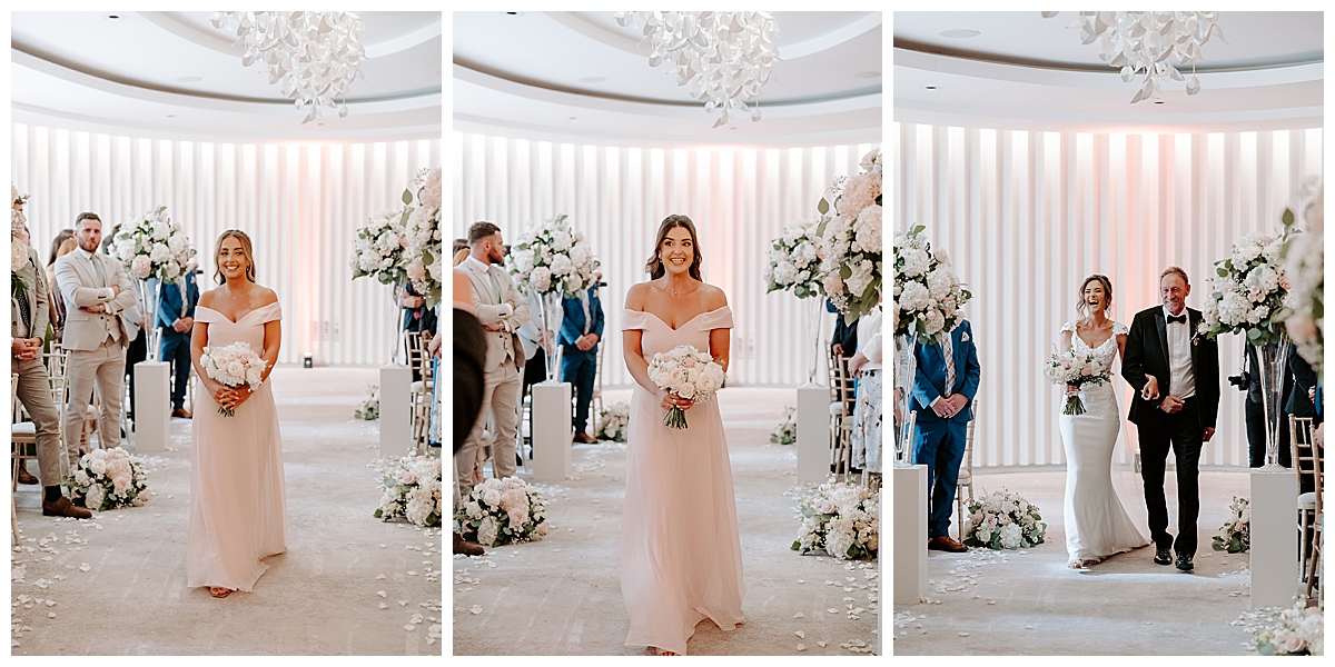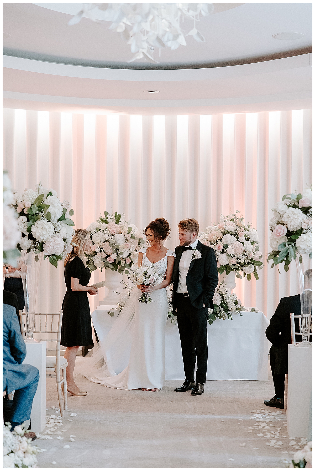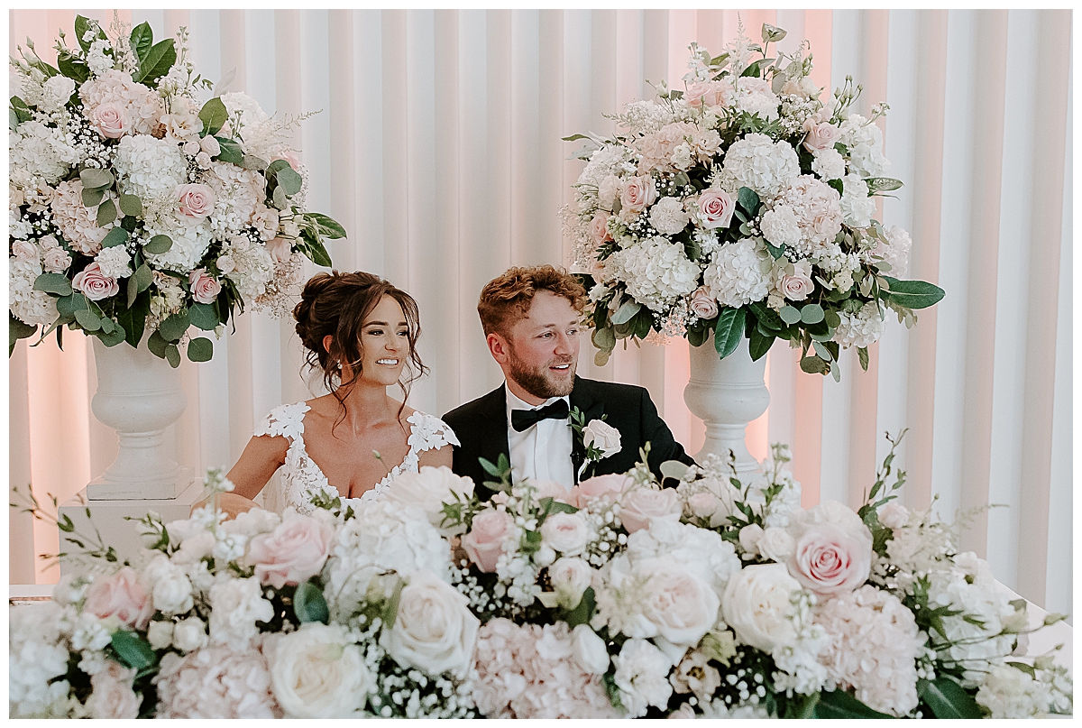 The ceremony was held in the Oval room, after which the guests went outside for photos and the room was turned around and tables laid with luxurious perfection, ready for the wedding breakfast. Since the Oval Suite is a neutral and modern backdrop, Chloe wanted to dress this abundantly with lots of luxury wedding flowers. We used our plinths to place the tall guest table centrepieces on them during the ceremony, and even the low guest table centrepieces were first used as floor meadows, down the aisle, at floor level. Two gorgeously blousy statement floral urns created a beautiful backdrop for the ceremony and were later repurposed to give the same big-bang impact behind the top table. Last but not least, the ceremony table was dressed with an amazing floral display bursting with all of Chloe’s favourite flowers.