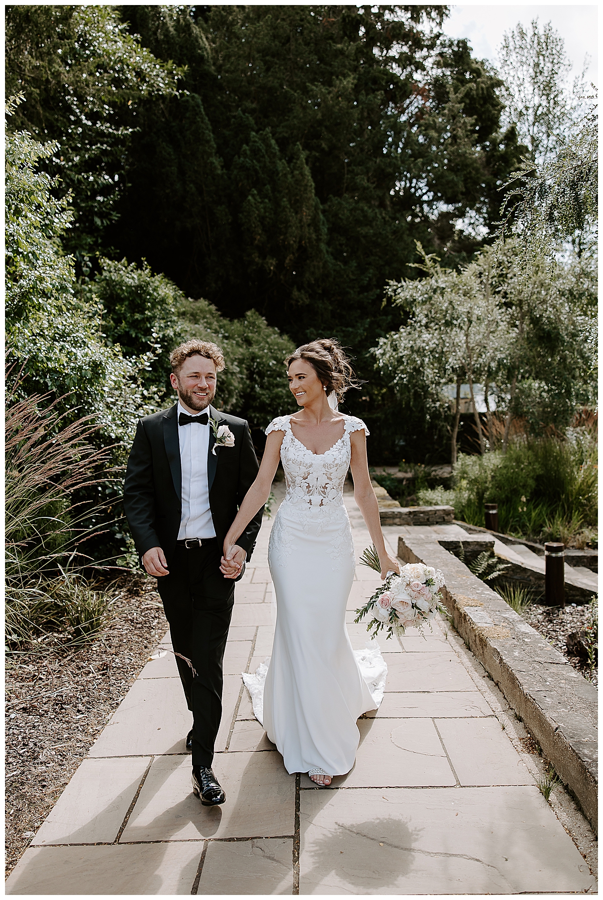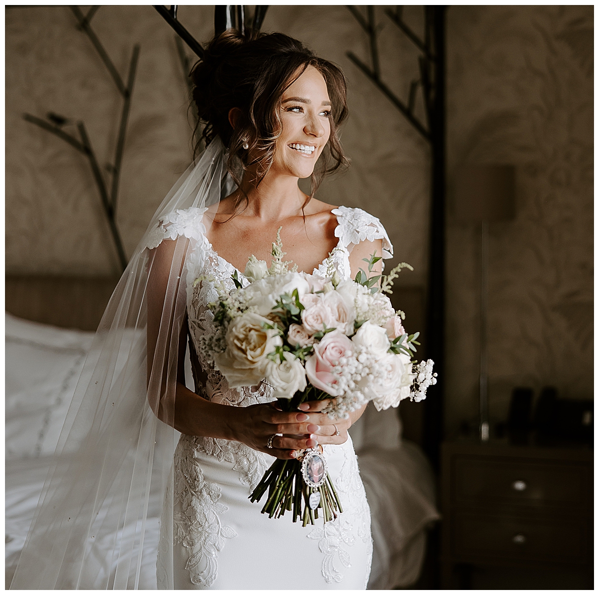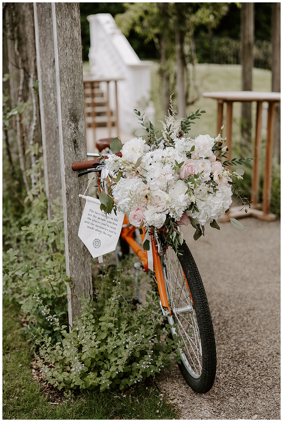 Chloe carried an amazingly scented bouquet of ivory and pale blush roses, speciality scented O’Hara garden roses, Bombastic spray roses, peonies, wispy astilbe and lacey gypsophila to echo the lacey texture of the bridal dress. When we delivered the bouquets in the morning, Chloe looked amazing and so happy surrounded by her dearest friends. Chloe’s mum had sadly passed away so although she couldn’t be there on this very special day, we added a pretty pendant with a picture of Chloe’s mum to the ribbon around the bridal bouquet, which was a lovely way to have her mum close. Chloe’s mum was known for being a really keen cyclist, wizzing around everywhere with Chloe and her brothers, all on their bikes, when they were younger. So we created a beautifully bloomy bouquet of flowers in memory of her mum, and added it, in a vintage basket that I sourced myself, to the cheery orange bikes that are part of the hotel collection or outdoor pursuits. Chloe was really speechless and loved this, and so did we!