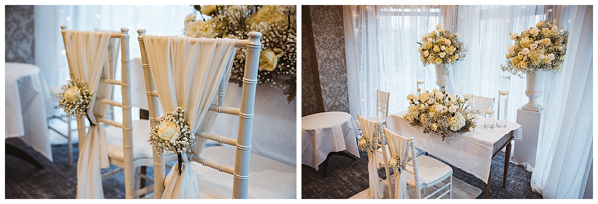To complete the enchanting aisle styling, rose and gypsophila clusters were added to each of the soft chair sashes provided by Host With Style. These delicate touches enhanced the elegance and created a seamless visual flow throughout the ceremony space. Additionally, two striking floral urns served as a statement backdrop for the ceremony area and table, adding a touch of grandeur to the surroundings.