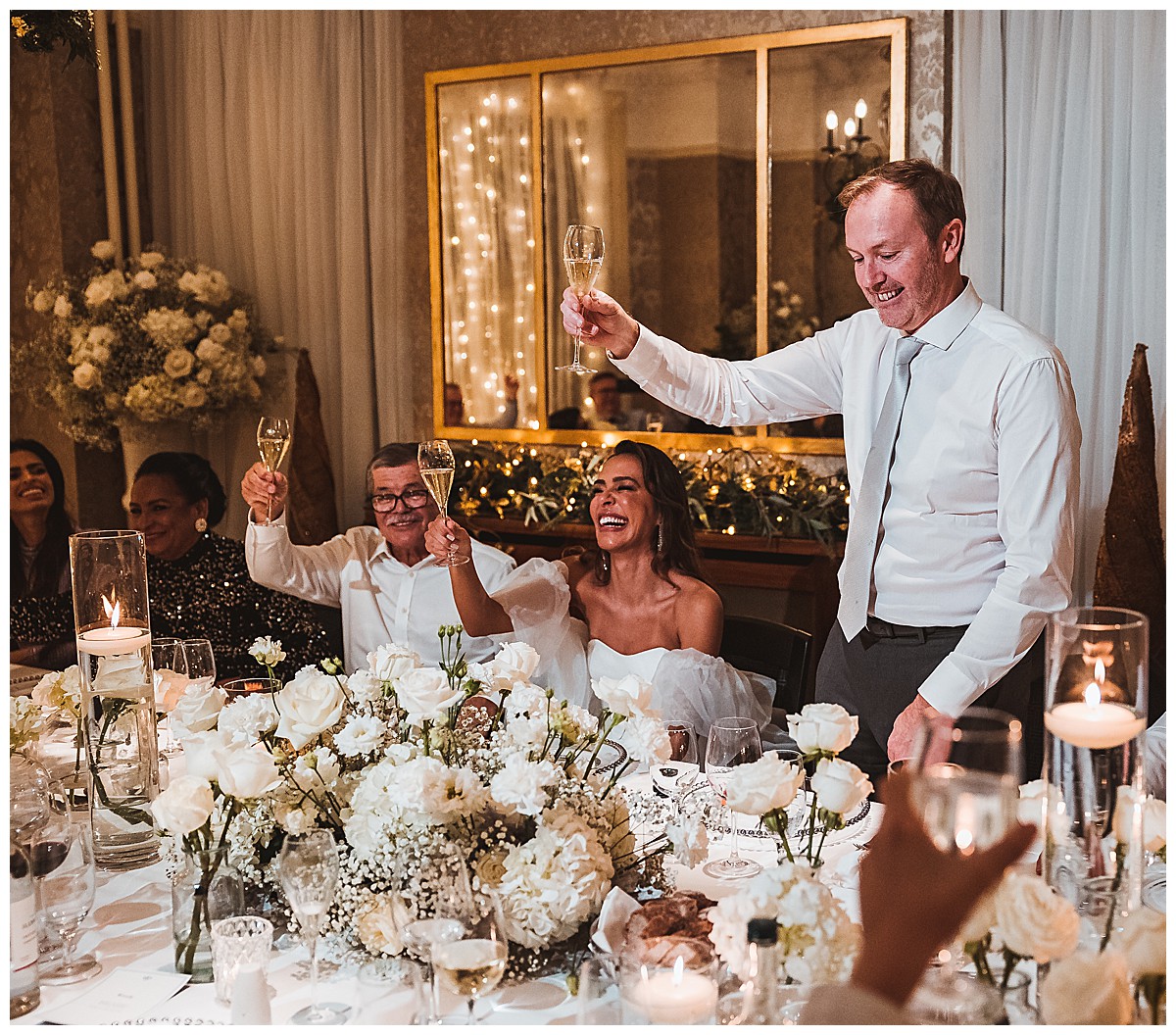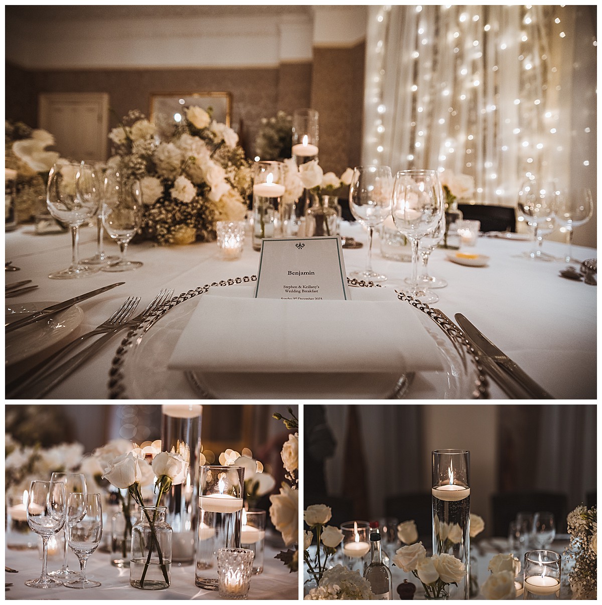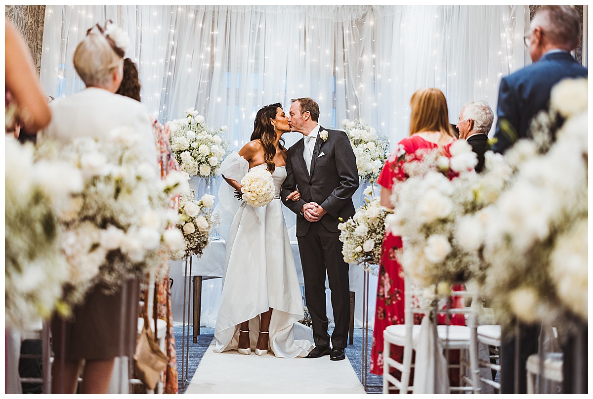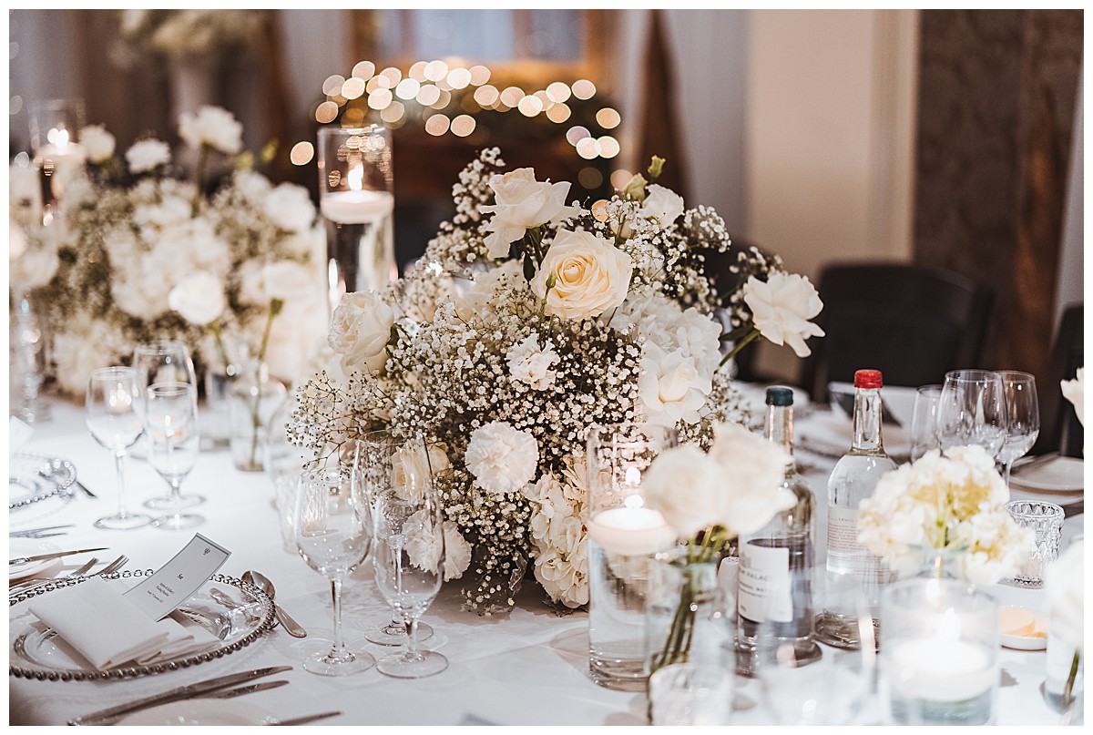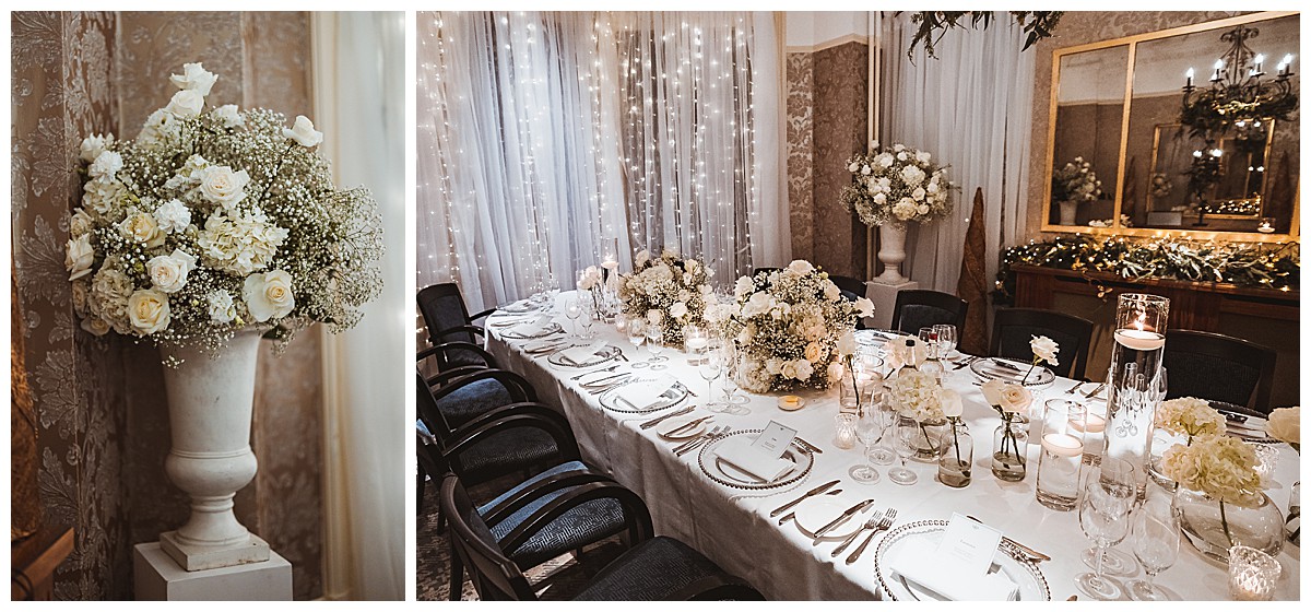Host With Style, a trusted partner in creating beautiful events, provided twinkling lights drapery on the windows behind the ceremony. This created a stunning magical backdrop, with softly veiled views over the picturesque riverside in Richmond. The wedding aisle was adorned with our raised floral centerpieces on elegant silver stands. Each centerpiece featured ethereal puffballs of lacy gypsophila complemented by textural white hydrangeas and magnificent Colombian import roses, perfectly capturing the essence of the winter wonderland theme.