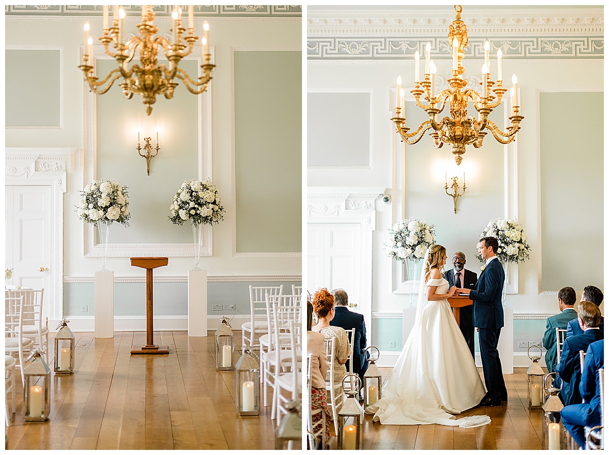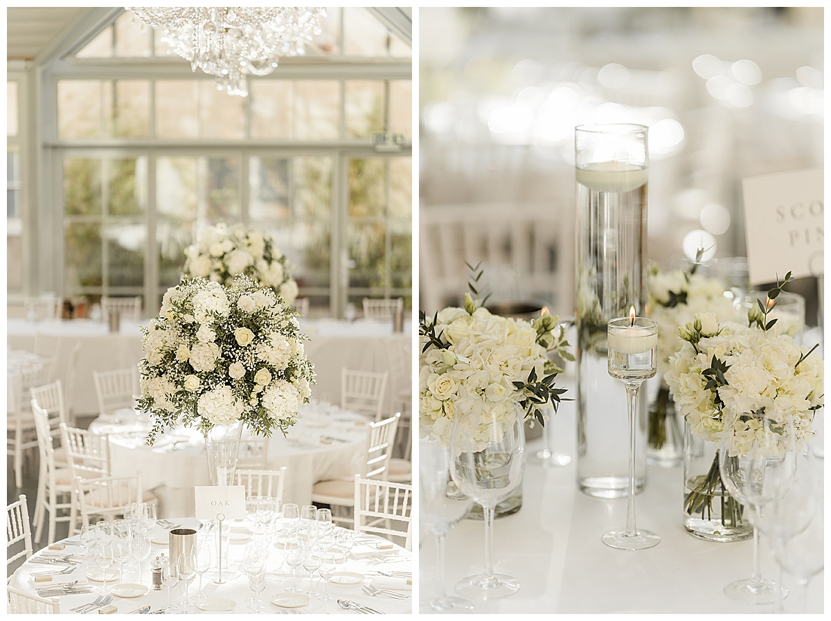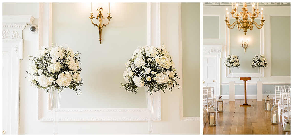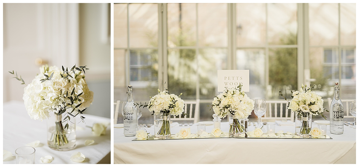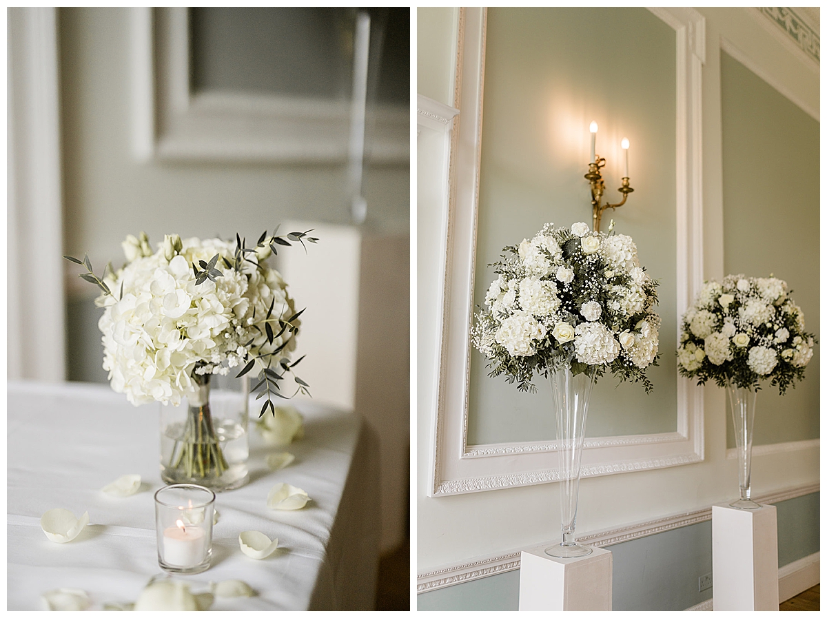 Sophie and Paul got married at Botleys Mansion’s elegant Georgian style Green Room, and the wedding breakfast was in the beautiful Atrium downstairs. Guests were welcome into the venue with a stunning tall table centrepiece on the feature table in the grand entrance hall, surrounded by elegant candlelit vases. Two matching grander vase centrepieces were used to flank Sophie and Paul during the wedding ceremony, creating the all important backdrop for the I-Do’s. The ceremony table and the mantlepiece were all dressed with pretty vases of hydrangeas and gypsophila, which were later reused to create low table centrepieces on some of the guest tables. The rest of the tables were dressed with the tall dramatic vase centrepieces from the hallway and ceremony room.