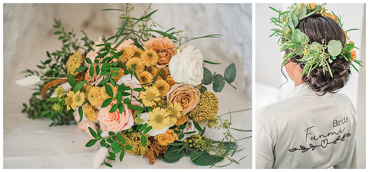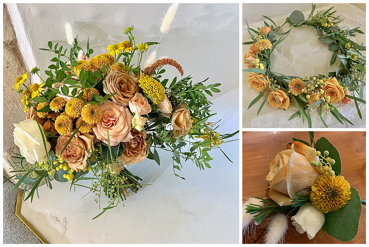 For Funmi and her bridesmaids’ bouquets we used an interesting mix of terracotta Toffee, Golden Mustard roses, golden achillea, sandy gold button chrysanthemums, and yellow daisies, with yellow mimosa, trailing terracotta amaranthus and wispy bunny tails here and there. Funmi was super keen to have a circlet and we picked out just gold & mustard wedding blooms, to echo the bridesmaids dress colour – we used dainty mimosa and golden mustard spray roses and cute button chrysanthemums again, all of which last really well and looked fabulous on.