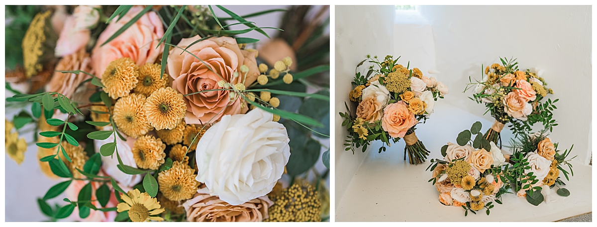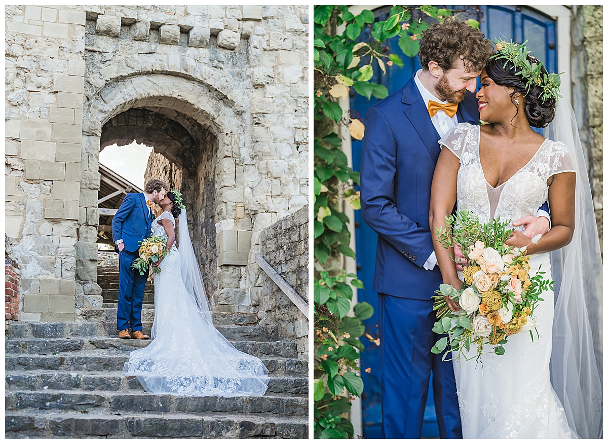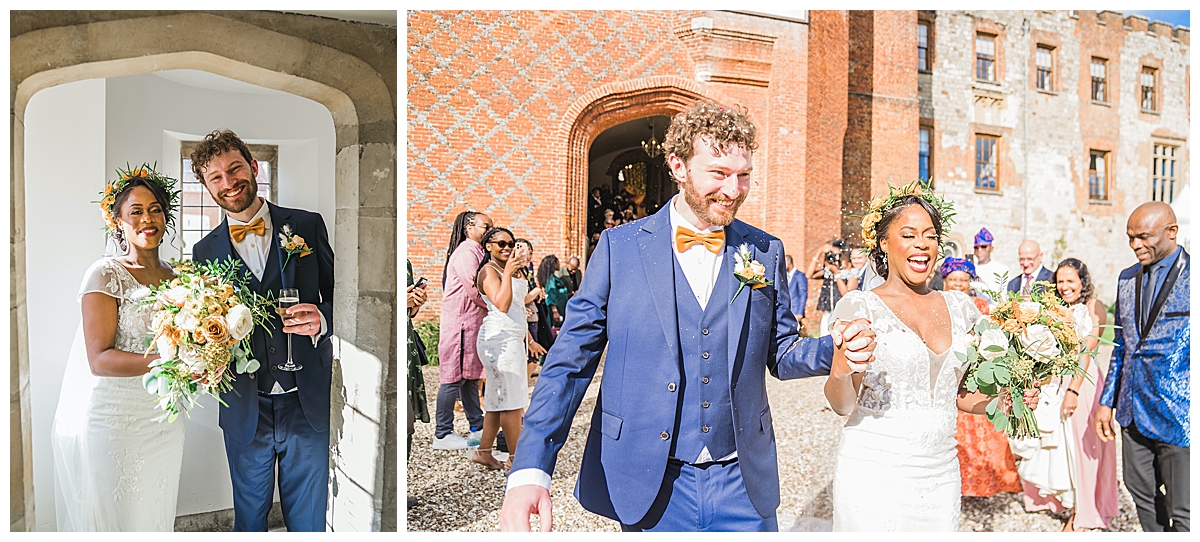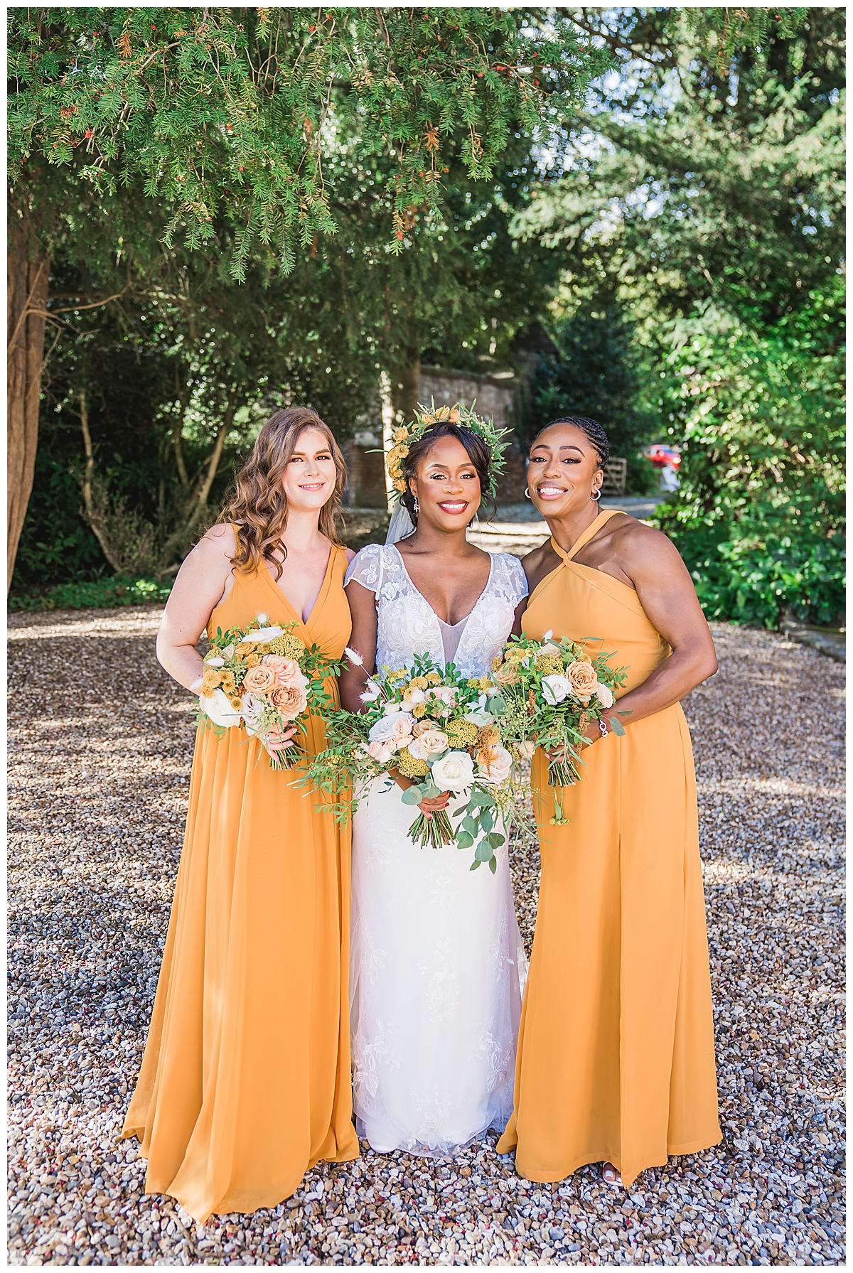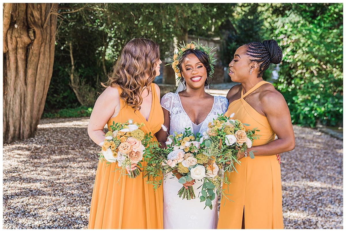 For their fabulous wedding at Farnham Castle on the Surrey & Hampshire border, Funmi & Taylor had a beautifully different cream, gold & mustard wedding flowers colour palette which was a delight to blend together. For the venue flowers we added a splash of warmer colours such as mellow corals and pinky earthy shades, to make sure they were a bit more vibrant and added to the autumn ambiance at the castle.