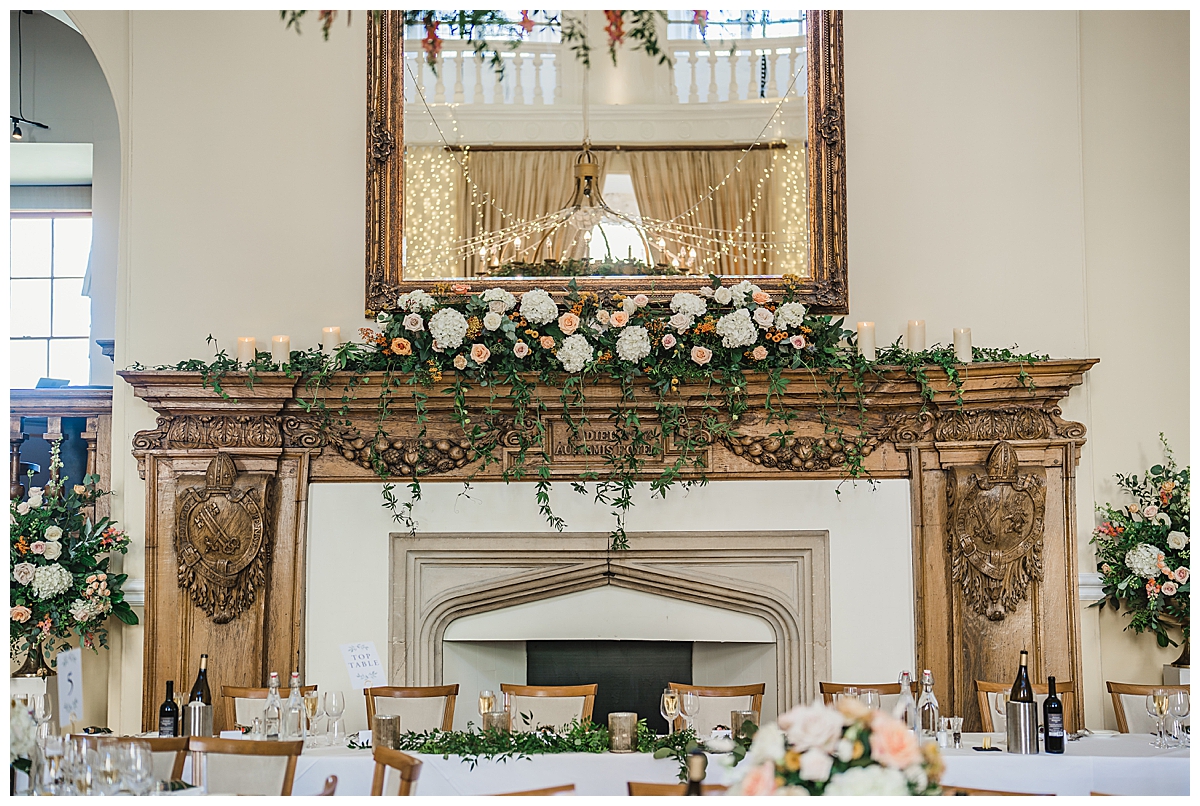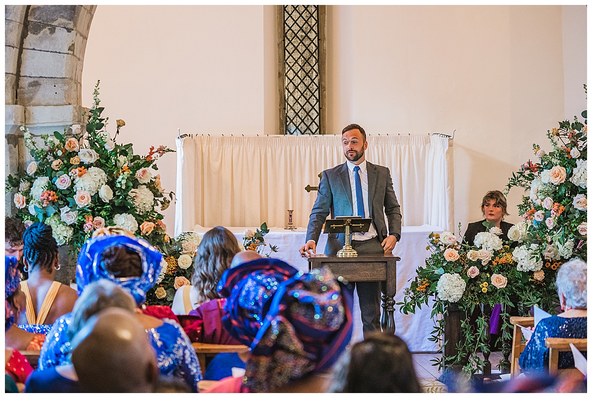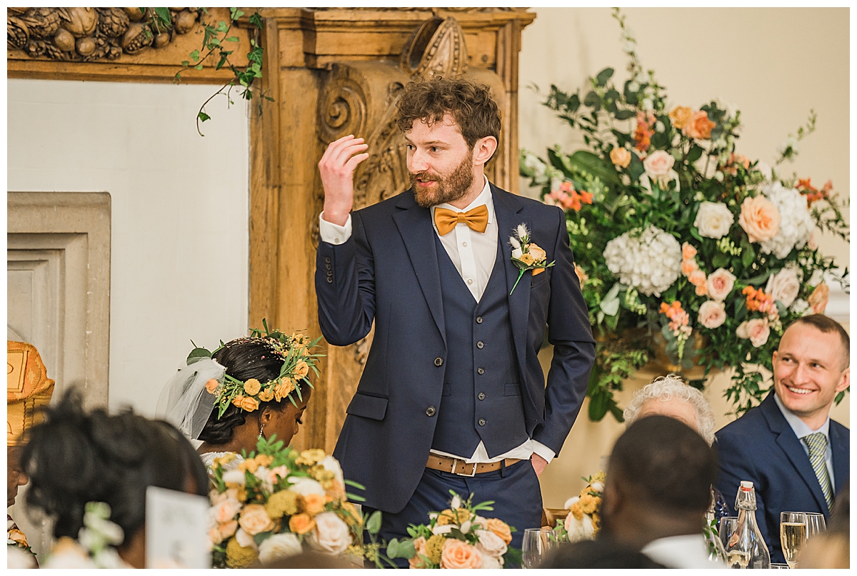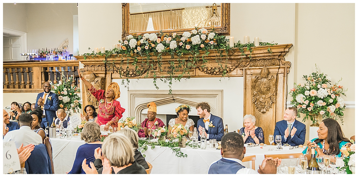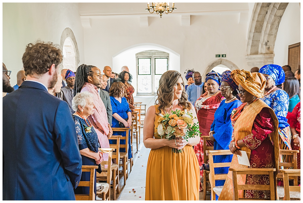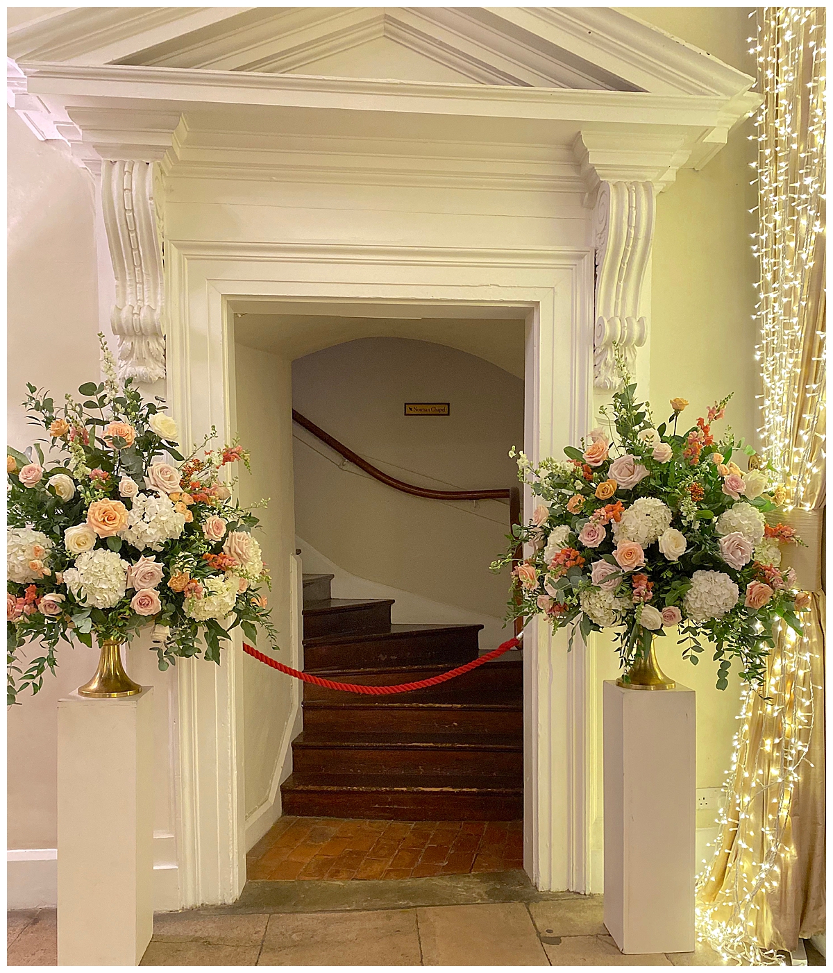 The ceremony was held in the beautiful Norman chapel, which looked lovely and vibrant beautifully decorated by gold & mustard wedding flowers displays and the guests’ colourful blue & mustard richly coloured Nigerian outfits and head-dresses. Decor-wise we created two beautiful urns to mark the ascent up the historic narrow staircase leading to the Norman Chapel, and two more to flank the ceremony area. The wooden railings at the front of the chapel were dressed with beautiful trailing floral runners flanking the ceremony area and later these were reused, joined up into one larger and impressive, mirror-wide runner, to dress the grand fireplace behind the top table, creating a stunning backdrop to the whole table and warm and animated speeches