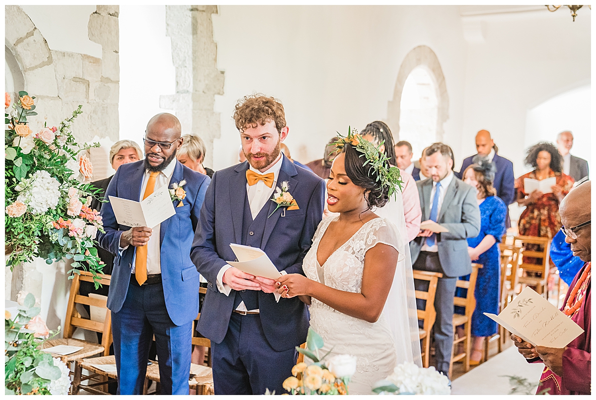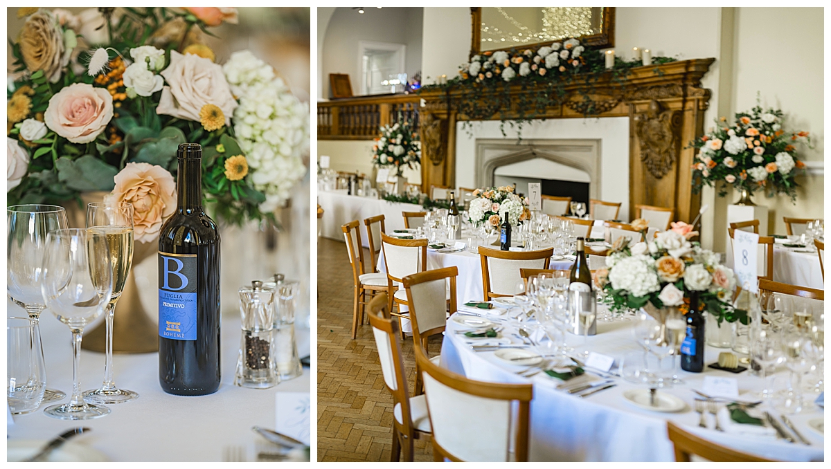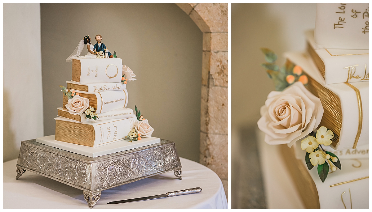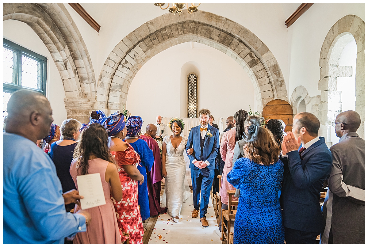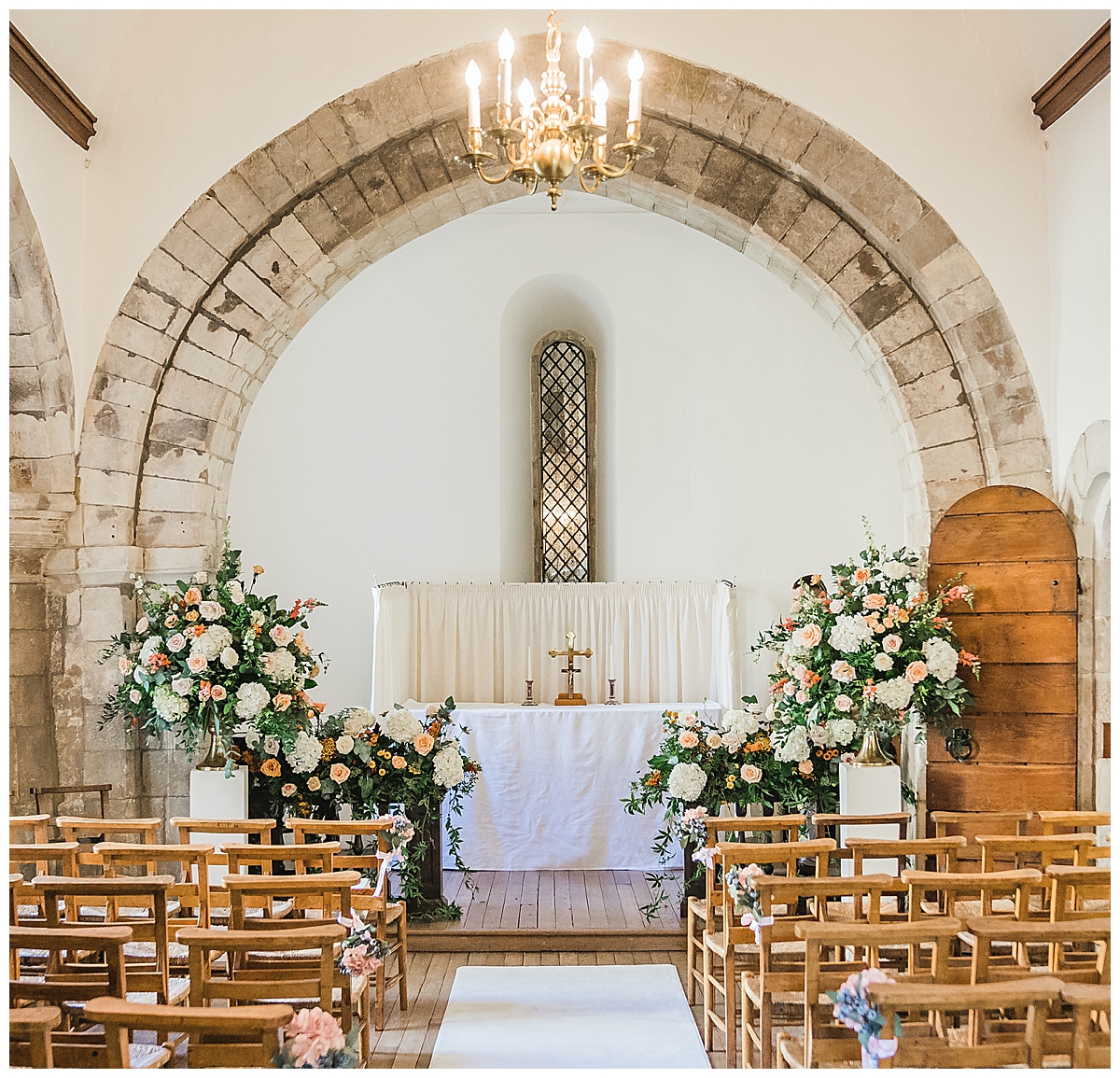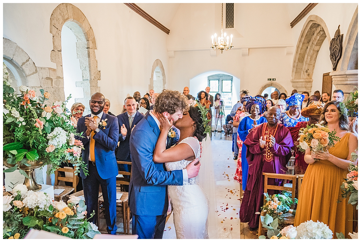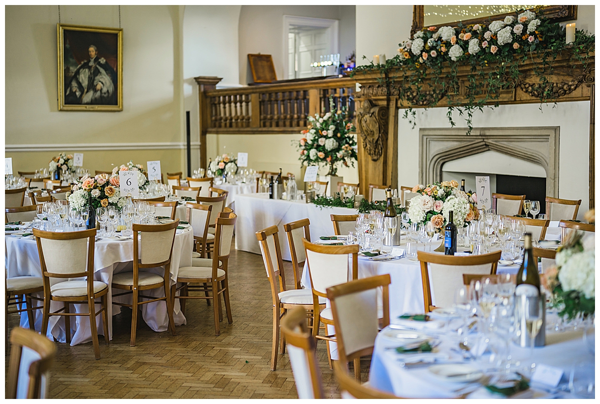 The ceremony was held in the beautiful Norman chapel, which looked lovely and vibrant beautifully decorated by gold & mustard wedding flowers displays and the guests’ colourful blue & mustard richly coloured Nigerian outfits and head-dresses. Decor-wise we created two beautiful urns to mark the ascent up the historic narrow staircase leading to the Norman Chapel, and two more to flank the ceremony area. The wooden railings at the front of the chapel were dressed with beautiful trailing floral runners flanking the ceremony area and later these were reused, joined up into one larger and impressive, mirror-wide runner, to dress the grand fireplace behind the top table, creating a stunning backdrop to the whole table and warm and animated speeches