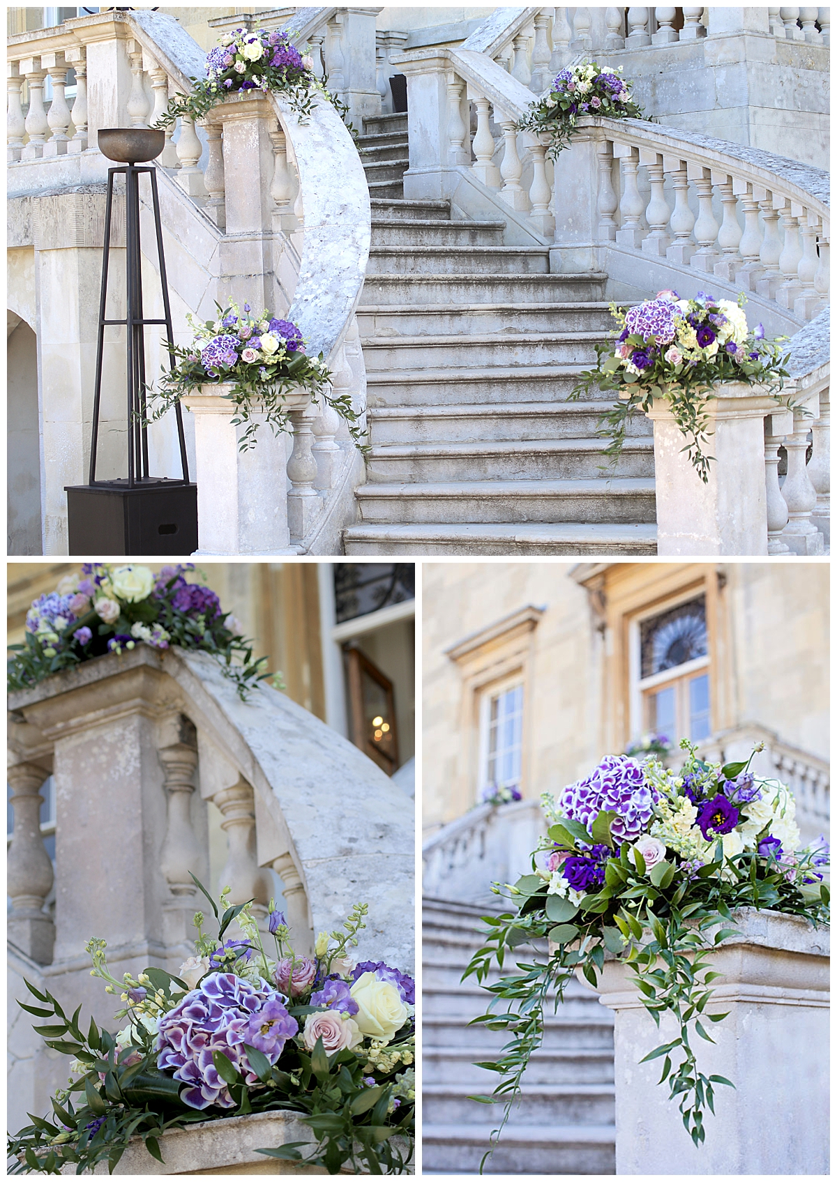 The sun was truly shinning that day, and it was one of the first few sunny spring days this year. So the displays we made for the grand stone stairs leading up to Botleys entrance, really came into their own and were much admired. I was so glad to not have to revert to plan B of using them inside! Carrying on the welcoming theme, we arranged a beautiful urn display for the focal table in the entrance foyer, with rare lilac-rosé lavender delphiniums, ivory and deep purple larkspurs, lots of roses and hydrangeas. In the bold mix of flowers we had the pleasure of using a rather rare type of hydrangea, called Harlequin, with pretty two tone blooms, which looked just so lovely, rather exotic and unusual.