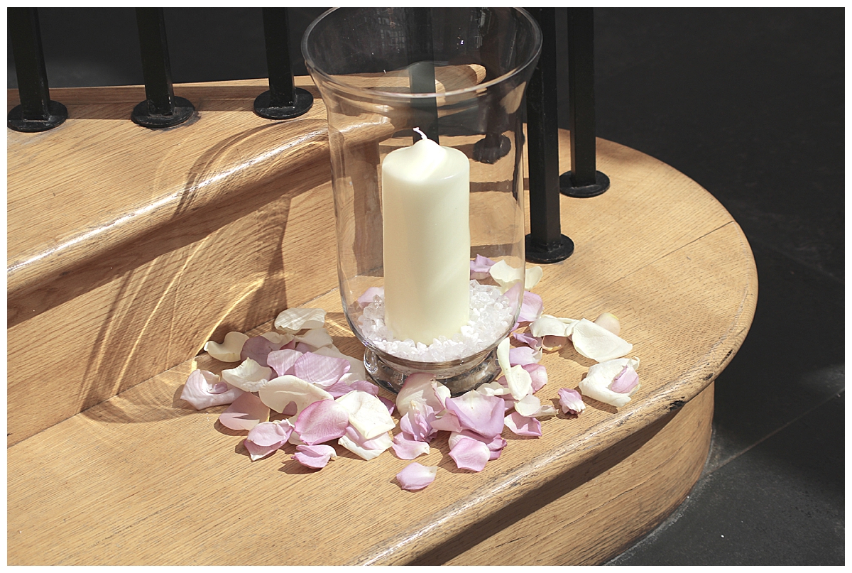 For the central tables right in front of the top table, we created large floral wreaths to go around the base of the candelabras, so that guests seated at the back of the Atrium, nearer the stairs, had a clear view of the top table at speeches time. For the oval top table, we made up a matching oval display in the same style, again, with the amazing Harlequin and deep purple hydrangeas. Finally, we dressed the stairs quite simply, with storm vases surrounded by petal scatter, and dressed the pretty square cake made by Shereé’s mum, with dainty blooms studded here and there.