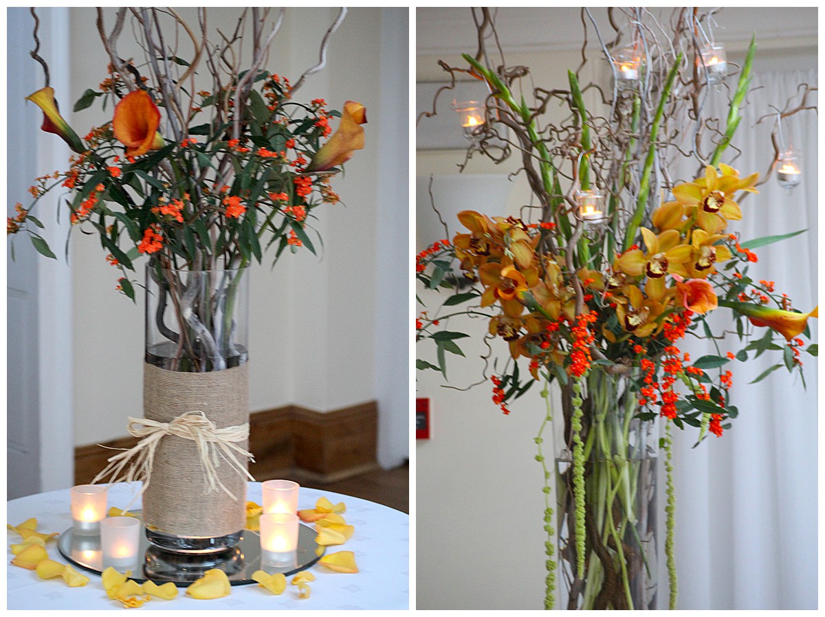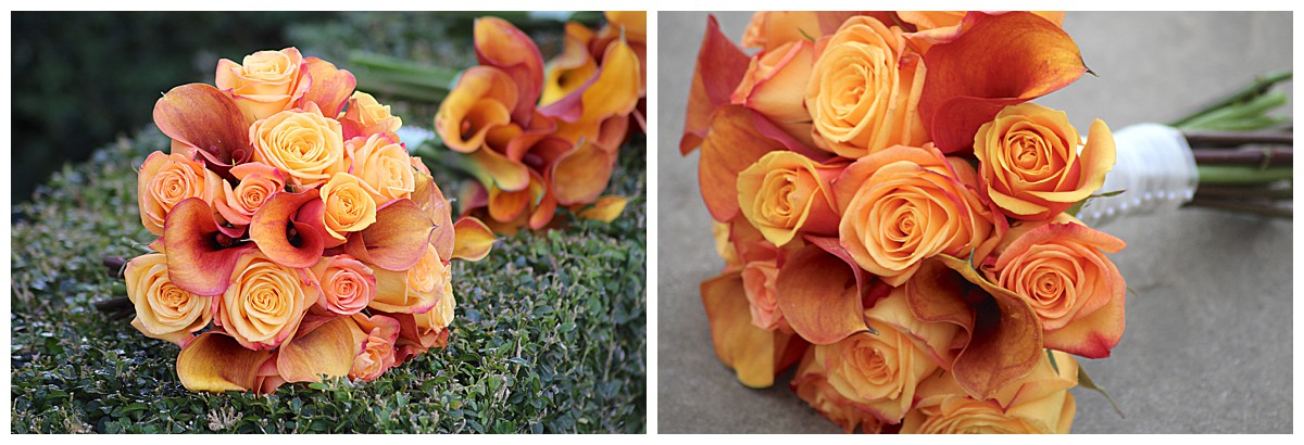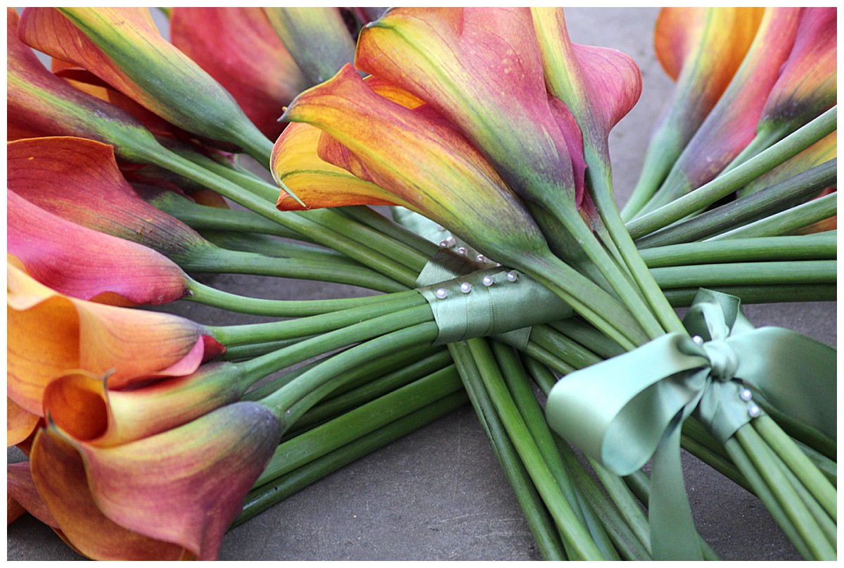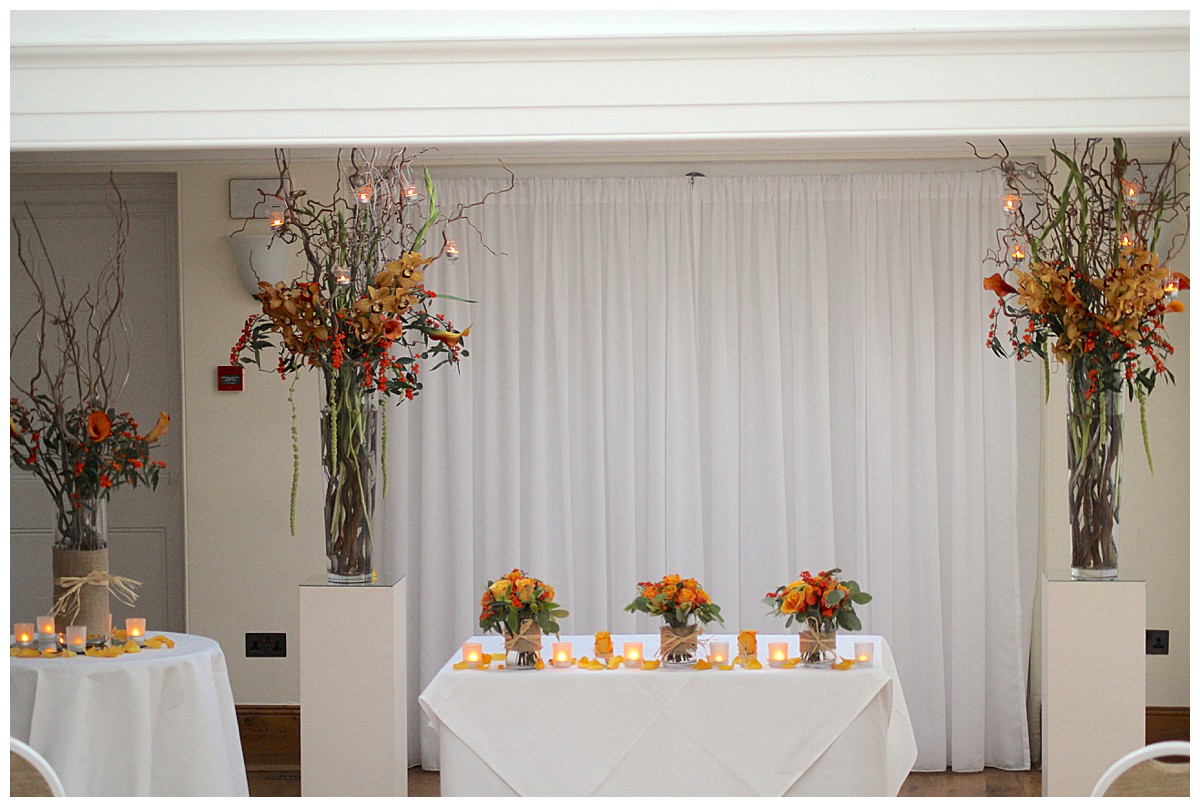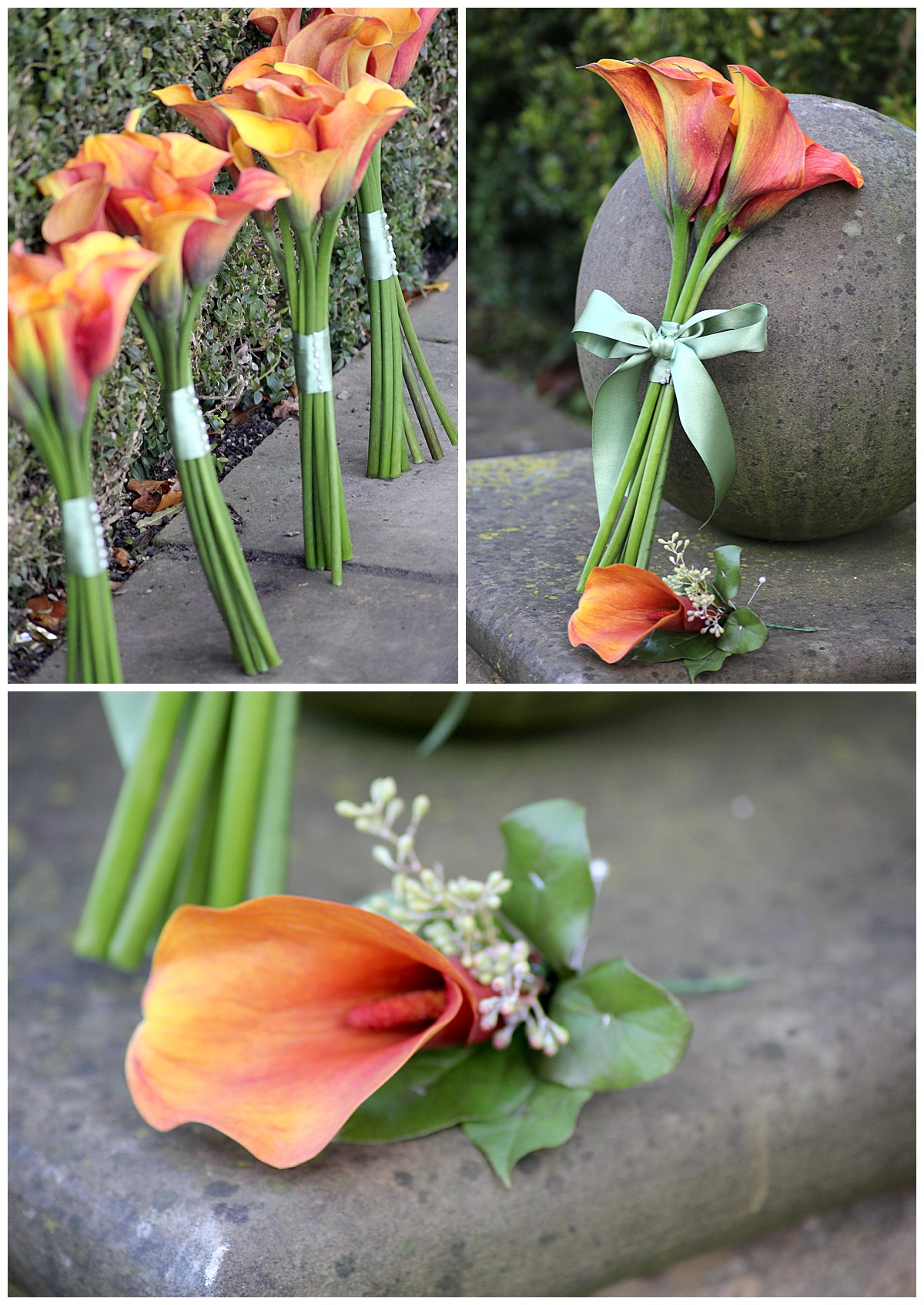 So here’s how we brought all of this together… Maddi carried a bouquet of rich orange roses and burnt orange Mango calla lilies, while the 4 bridesmaids and the younger flower girl had coordinating simple handtied bouquets of elegant Mango calla lilies, to contrast against their fresh sage green dresses. When it came to the venue flowers Maddi wanted understated centrepieces which could be reused after the ceremony. So we created two rustic twig centrepieces with burnt orange calla lilies and cymbidium orchids, and pretty hanging lanterns, to frame the ceremony table and give a lovely warm ambiance during the autumnal ceremony. A smaller matching display was used to dress the registrar’s table at the front, and the ceremony table was dressed with a line up of pretty vases with orange roses and calla lilies, and joint together by romantic votives and petal scatter.