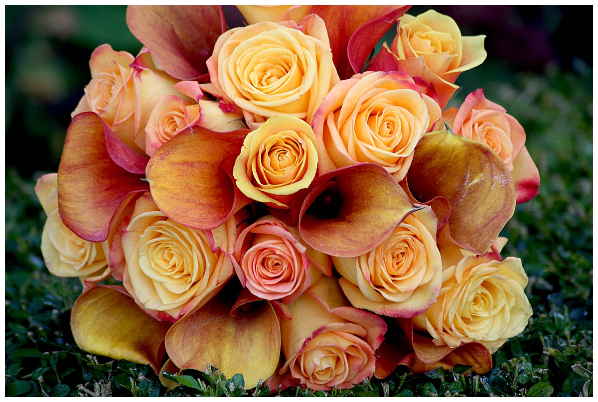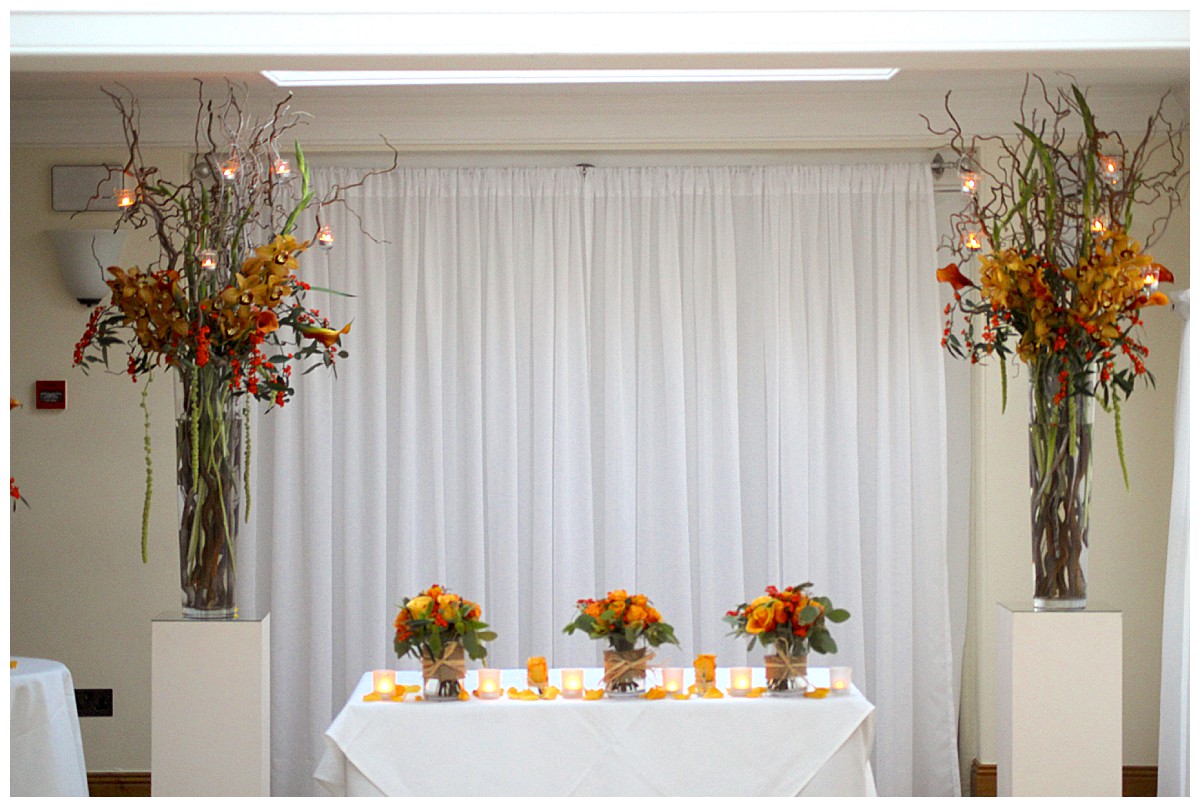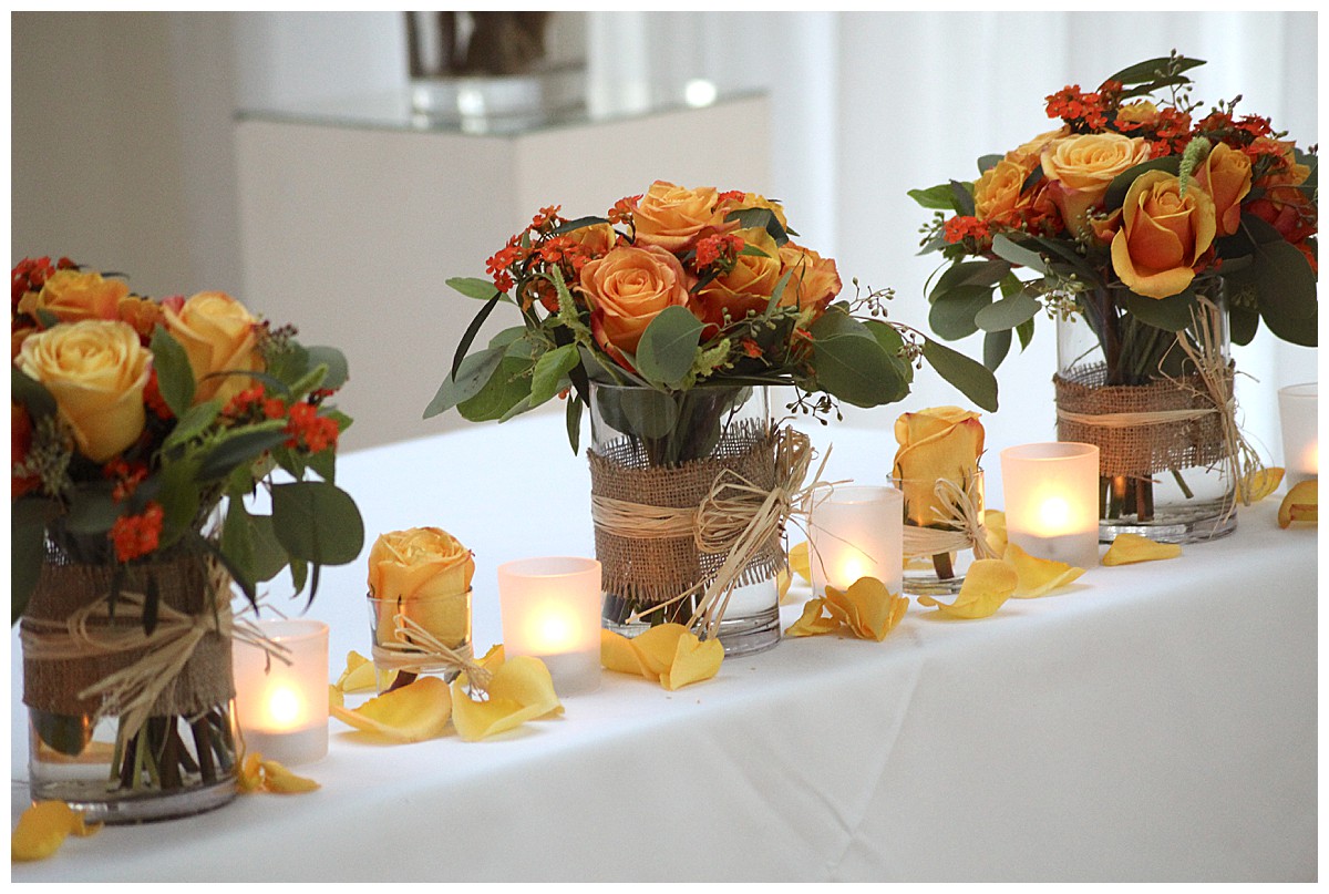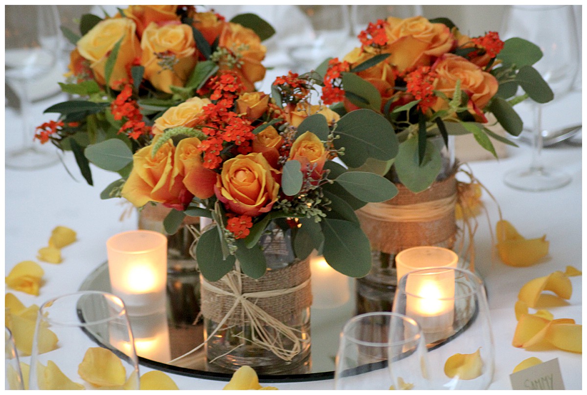 So here’s how we brought all of this together… Maddi carried a bouquet of rich orange roses and burnt orange Mango calla lilies, while the 4 bridesmaids and the younger flower girl had coordinating simple handtied bouquets of elegant Mango calla lilies, to contrast against their fresh sage green dresses. When it came to the venue flowers Maddi wanted understated centrepieces which could be reused after the ceremony. So we created two rustic twig centrepieces with burnt orange calla lilies and cymbidium orchids, and pretty hanging lanterns, to frame the ceremony table and give a lovely warm ambiance during the autumnal ceremony. A smaller matching display was used to dress the registrar’s table at the front, and the ceremony table was dressed with a line up of pretty vases with orange roses and calla lilies, and joint together by romantic votives and petal scatter.