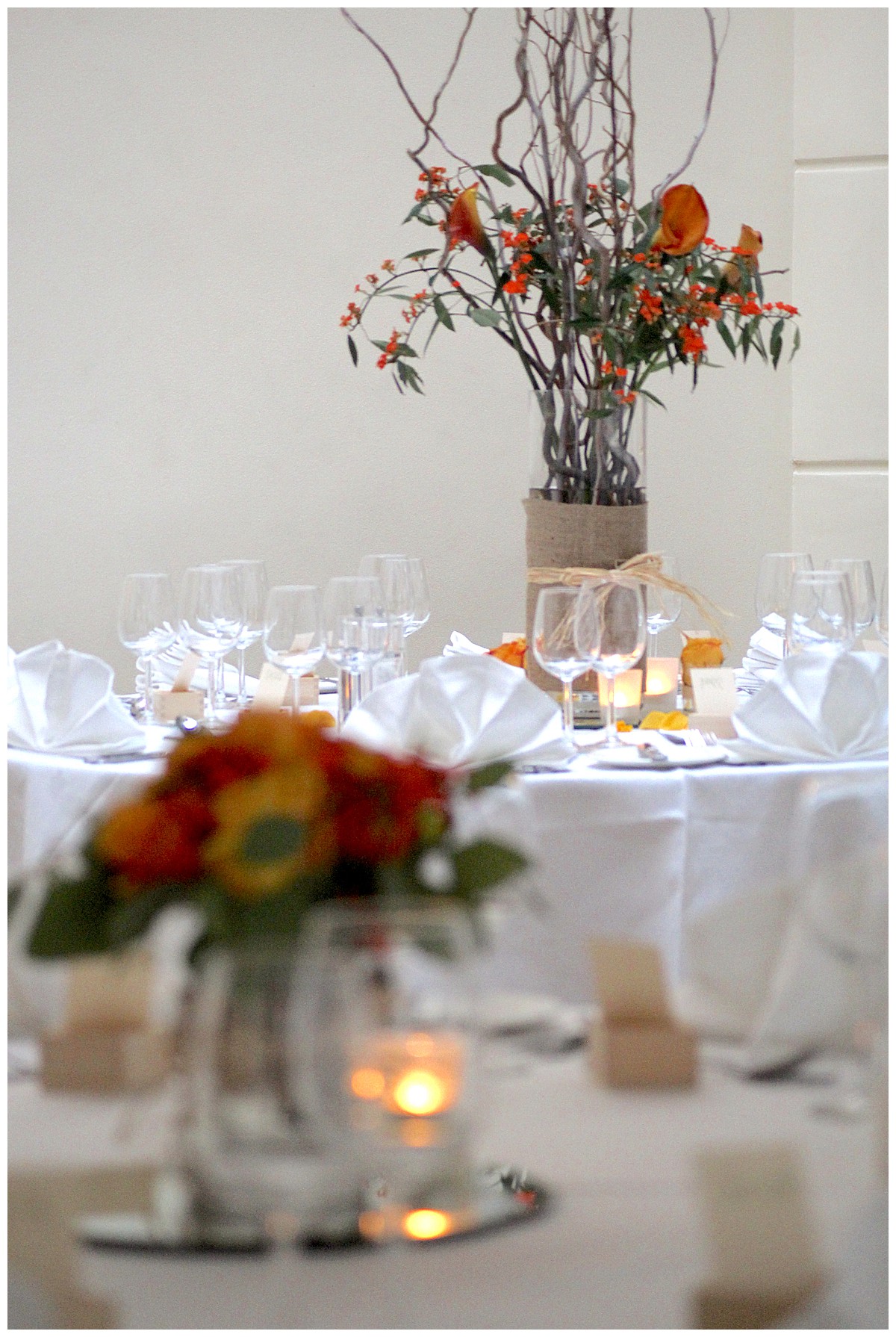 For Maddi’s autumnal wedding at Pembroke Lodge, the key part of the brief was to have a mellow autumnal colour scheme without the traditional and more usual take on autumn colours. So instead of going down the more frequently taken path of red and orange shades, we focussed on the softer orange and burnt orange, colours, with minimal pops of the brighter and more vivid orange tones. Maddi loved orchids and calla lilies which both come in burnt orange, and also wanted to add a little bit of a rustic touch, with pretty warm candlelight for an inviting ambience.
