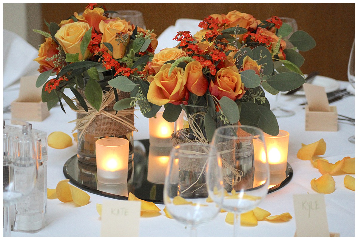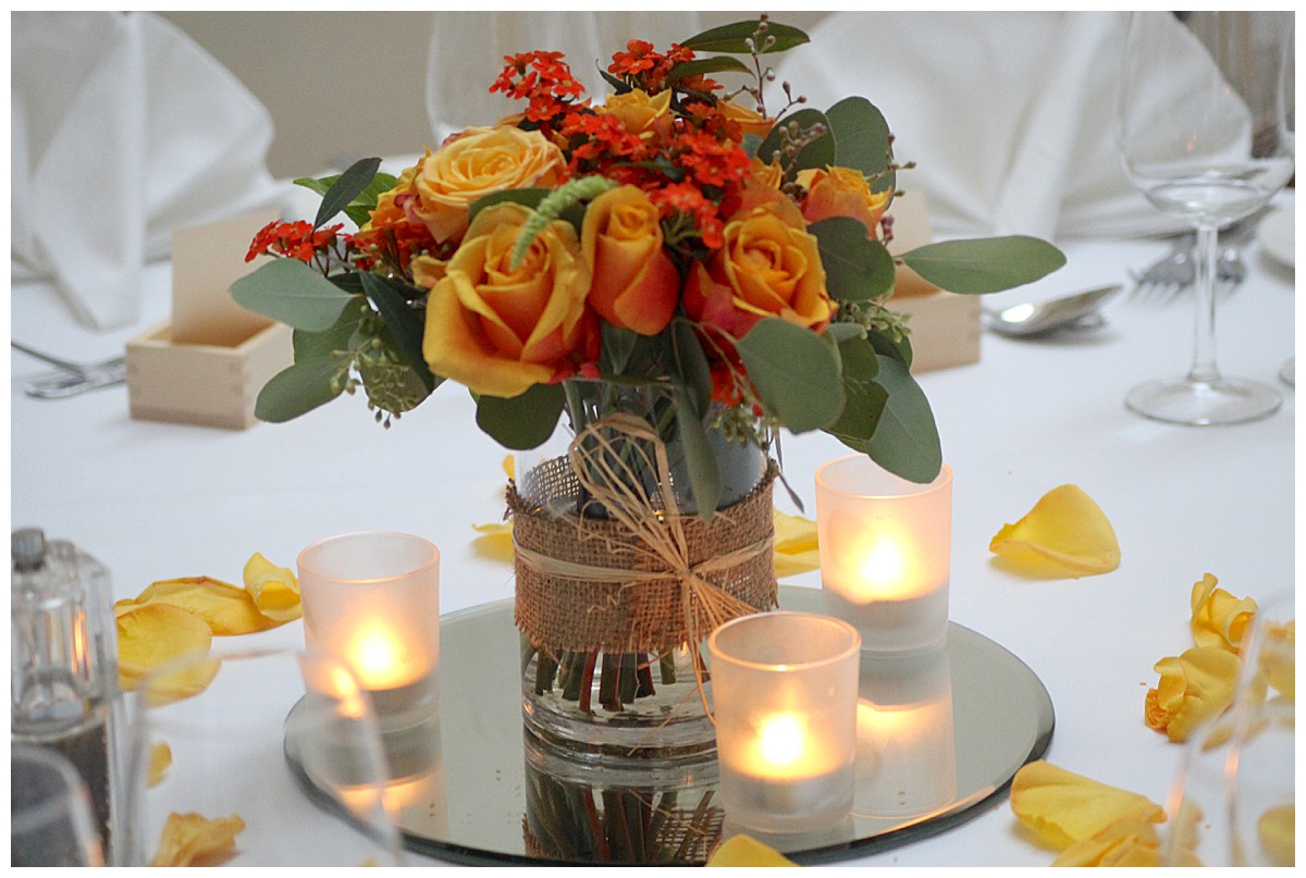 For the wedding breakfast guest tables, we reused all these ceremony displays and added extra ones, dressing all of the guest tables slightly differently, some with a taller centrepiece, some with just one of the lower centrepieces and the top table with a cluster of 3 pretty vases of flowers. Again, all of them surrounded by pretty candlelight and rose petal scatter.