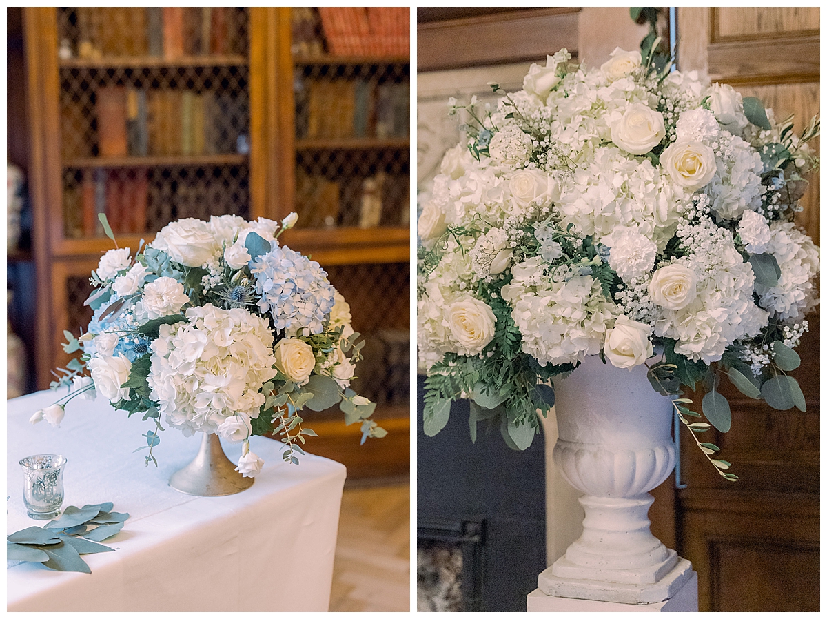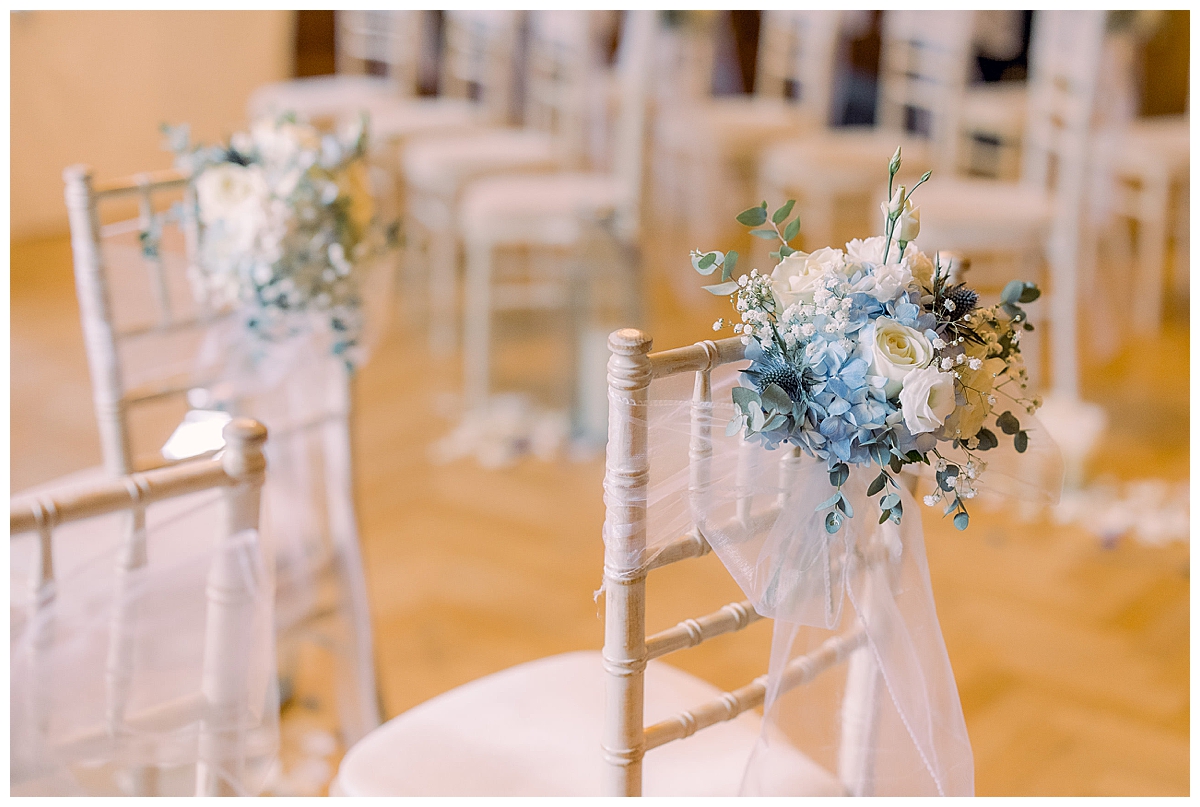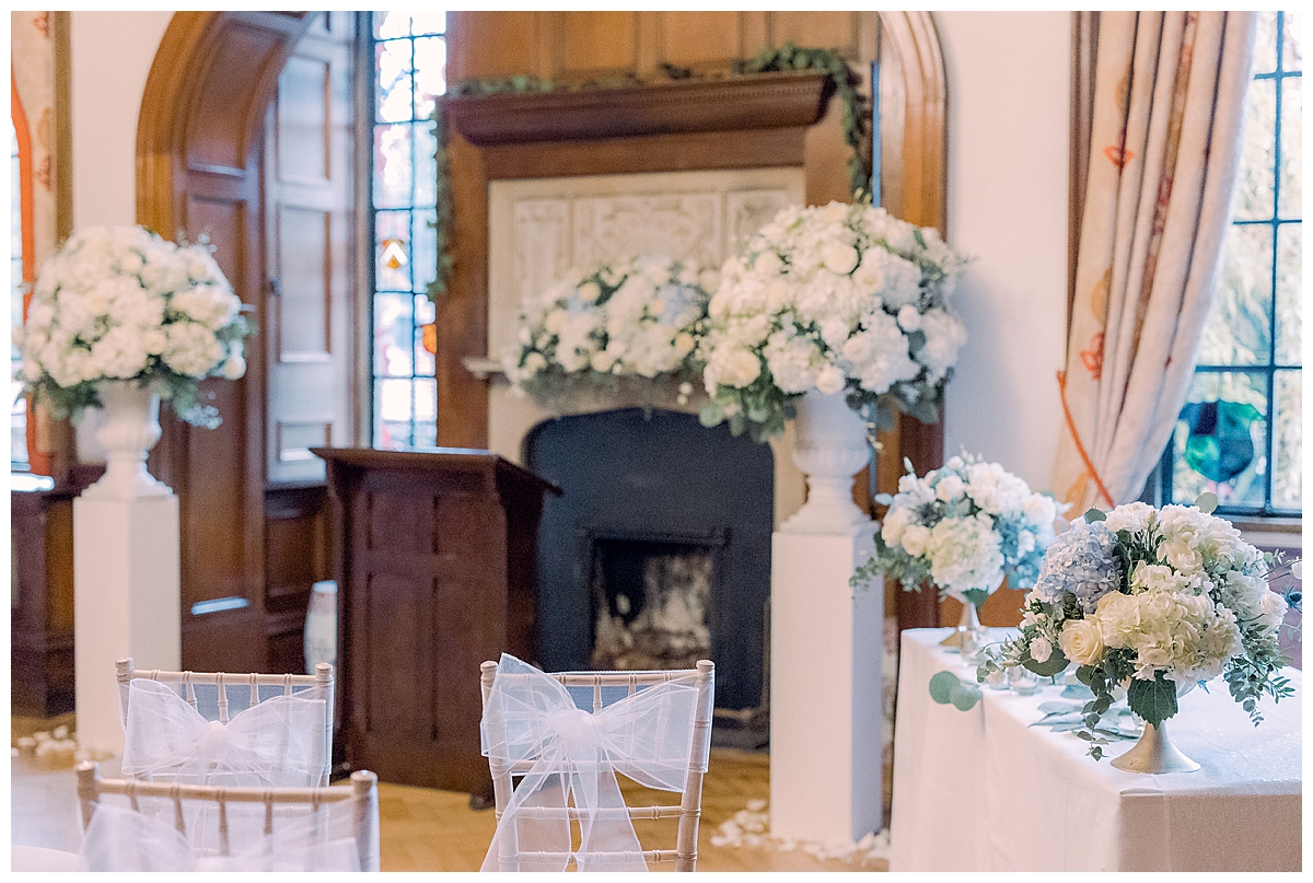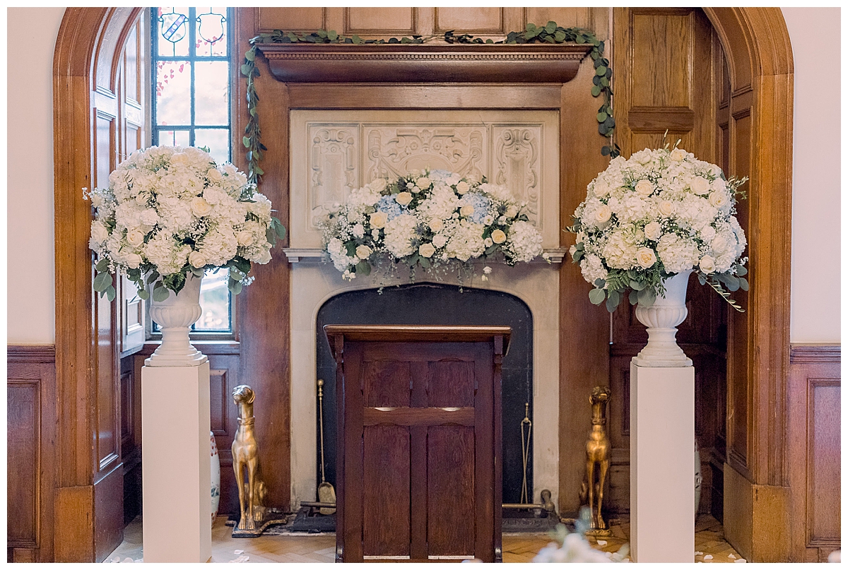 The wedding was in November and the grounds at Pennyhill Park were lovely and frosty as we arrived to set up. We got straight into the set up by installing two of our stunning candlelit blossom trees at the approach to the library, then moved on to the ceremony decor. Bethany and Liam were ken to make use of the beautiful fireplace as a backdrop to the ceremony itself, and since they had fewer guests, the room could be set up with the fireplace as a focus point which was really unusual and beautiful. The ceremony area was flanked by two amazing statement floral urns absolutely bursting with hydrangeas and roses, which provided a really luxurious backdrop to the couple as they said their vows. The beautiful stone fireplace was not forgotten either and we dressed it with a stunning mantlepiece display abundant with flowers. For the wedding aisle, we created a romantic look with wintry chair posies of bud hydrangeas, white flowers and navy blue thistles, to echo the colour scheme of the wedding, and added our silver lanterns to line the wedding aisle.