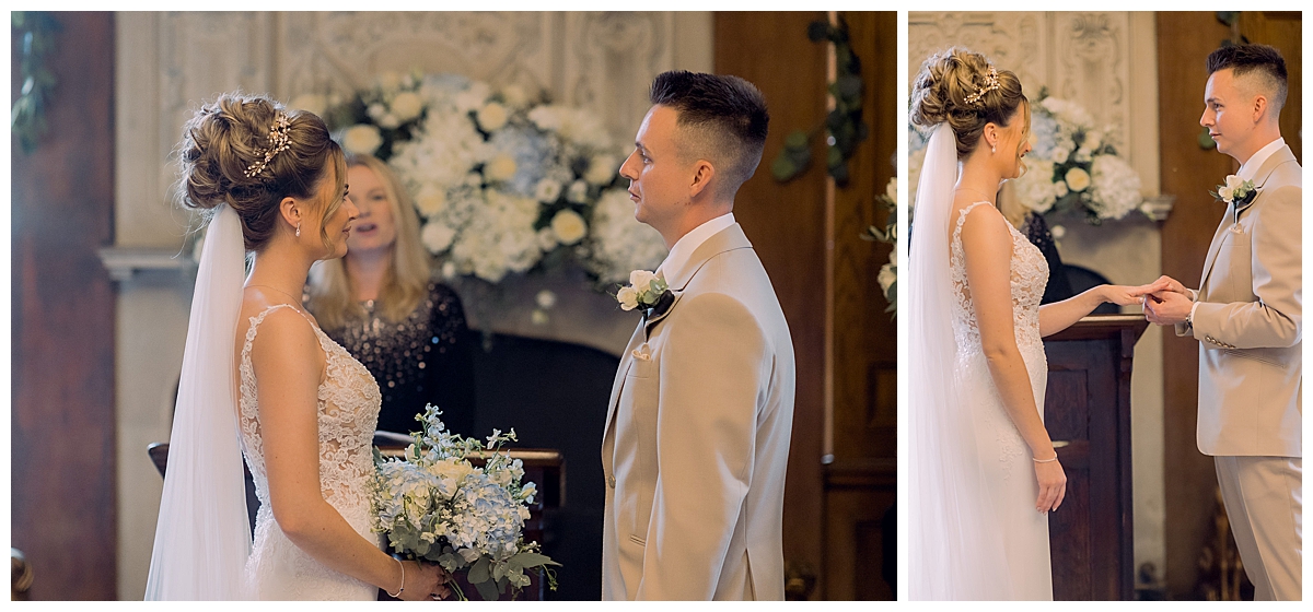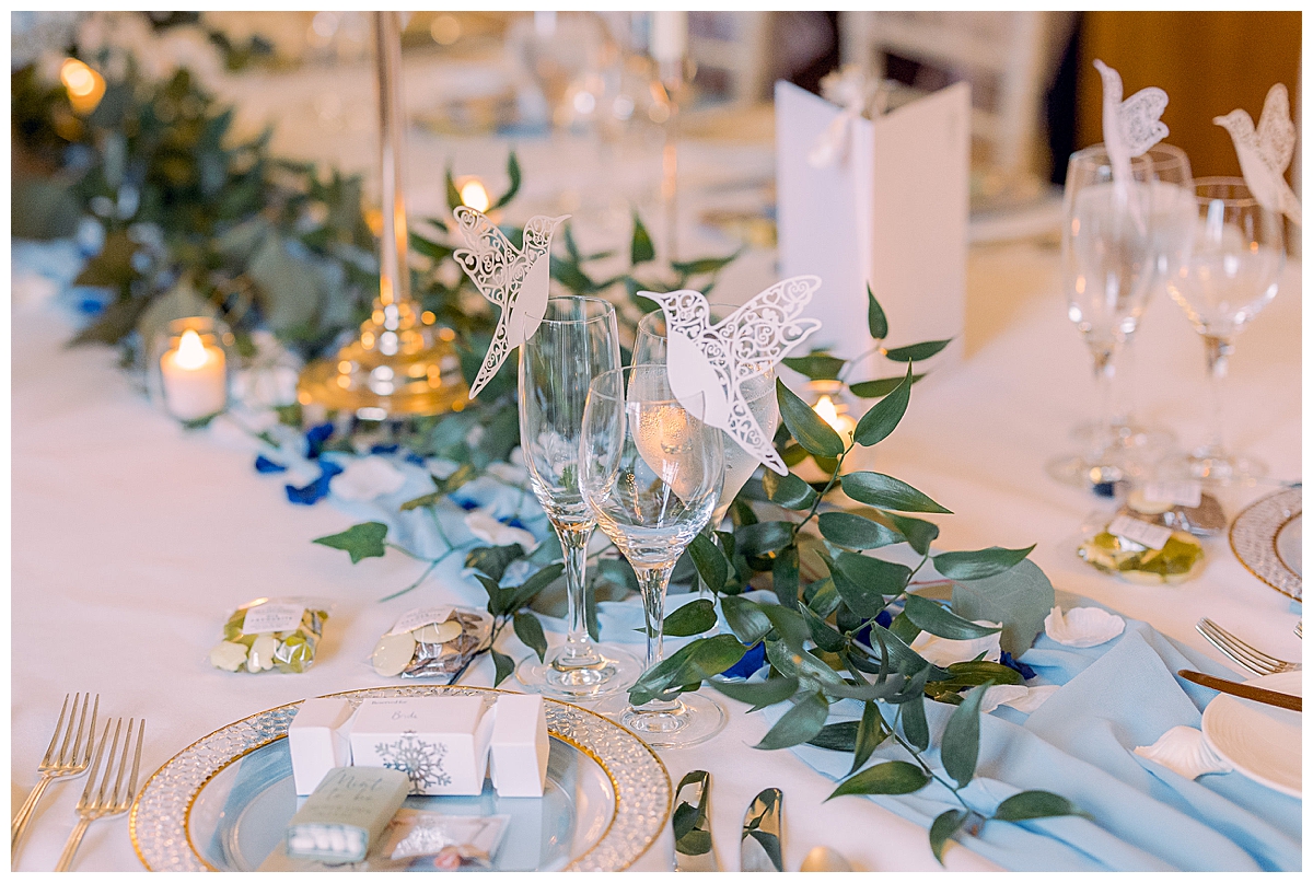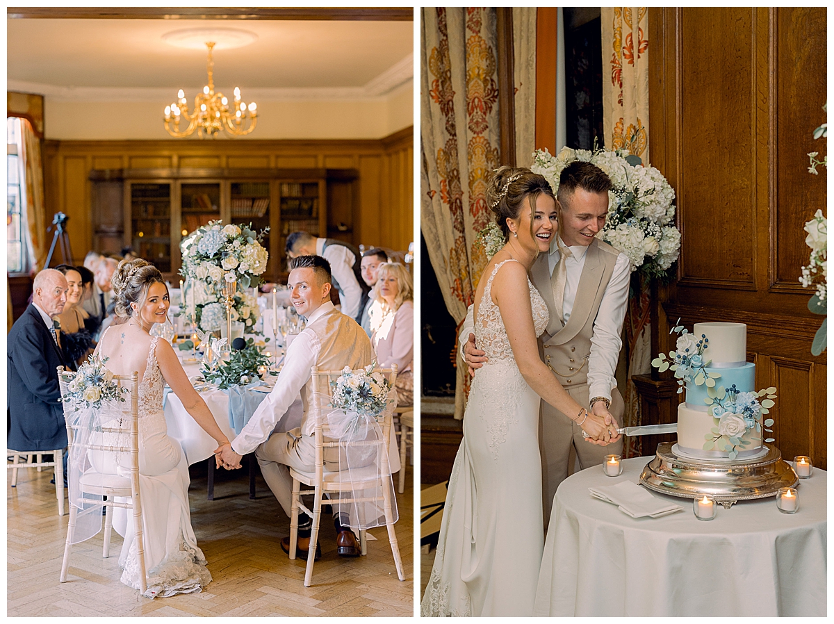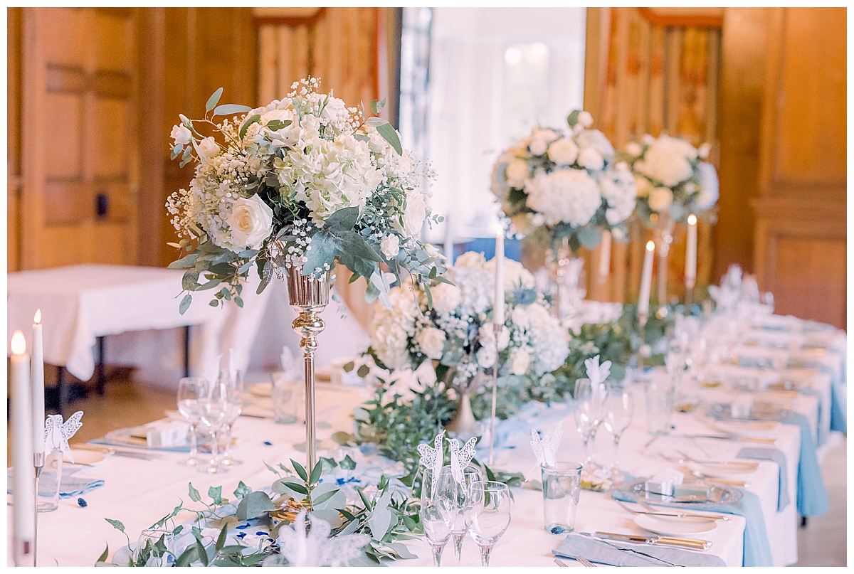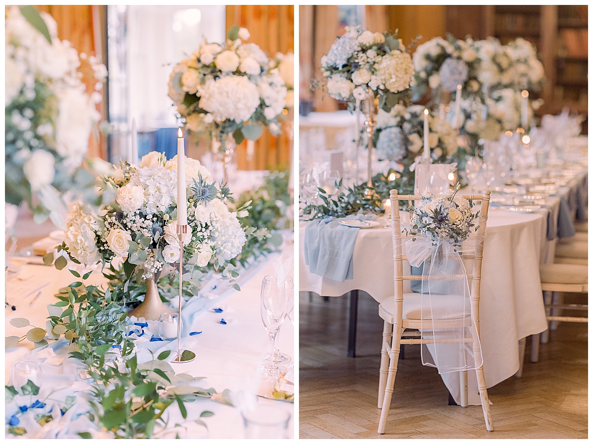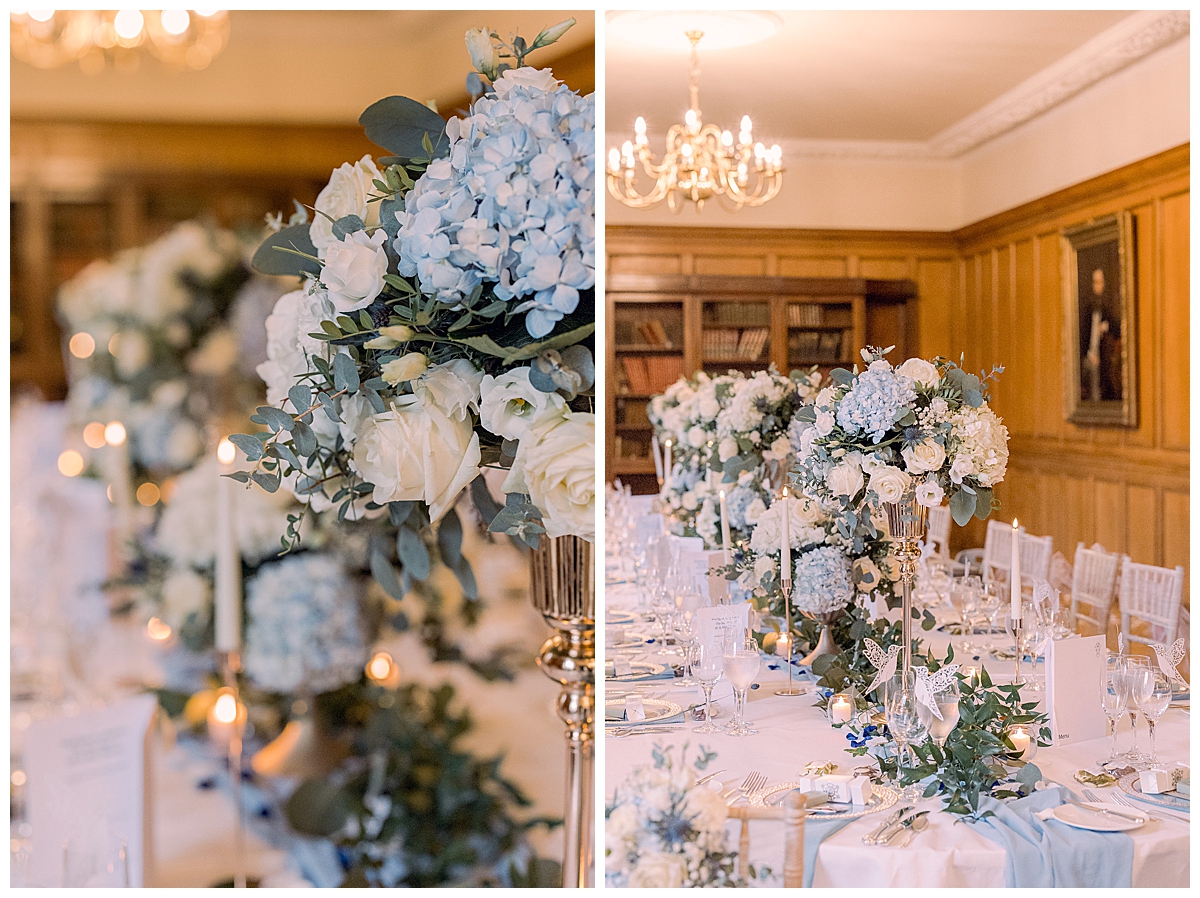 While Bethany and Liam and guests were all enjoying outdoor photos and drinks in the conservatory, we set about transforming the library, where a long banquet table had been laid with a pale blue runner. We dressed this with an abundance of flowers, mixing tall and low centrepieces for an interesting tablescape, and added tonnes of gorgeous candlelight with our elegant gold candlesticks and votives, connected by trailing foliage. The result was incredible and luxurious, and all the details that Bethany and I had been planning added a magical sparkle to the day.