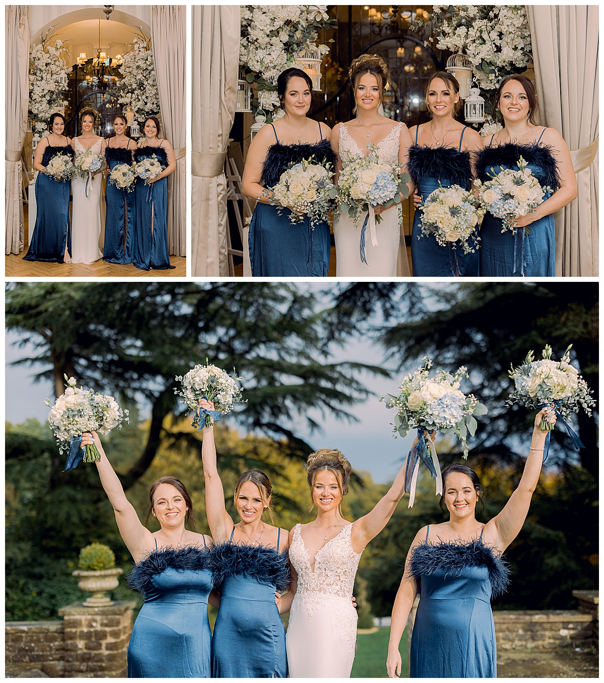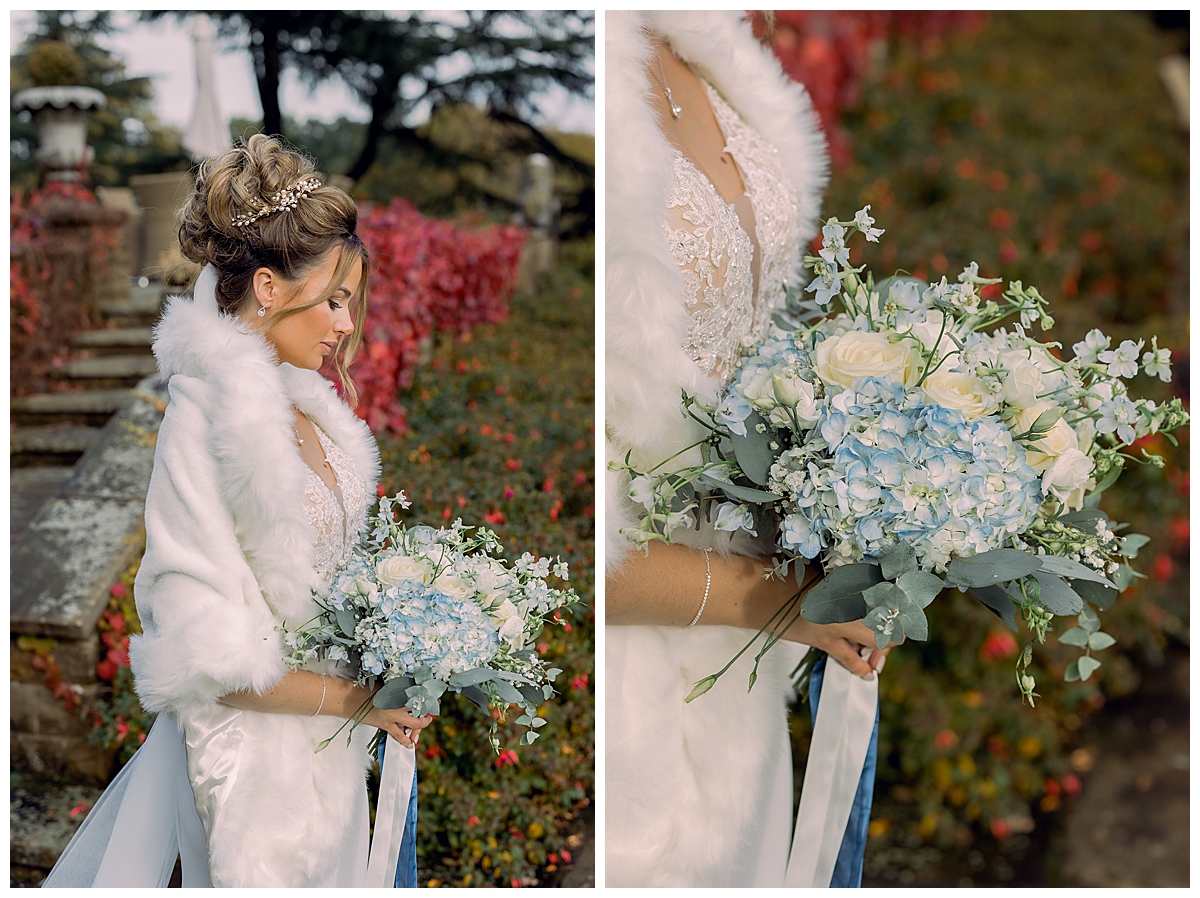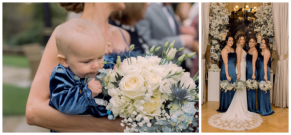 Bethany, and her bridesmaids – wearing elegant dark navy blue floor length dresses, all looked amazing with wintry bouquets of hydrangeas, roses, lisianthus, thistles and pale blue delphiniums, a gorgeous choice which looked lovely and wintry but still very feminine and pretty. Liam and his groomsmen wore white rose and thistle buttonholes, which were really well suited for this winter wedding at Pennyhill Park, the thistle adding a wintry touch to the flowers.