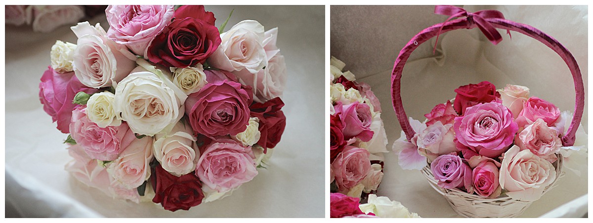 We used some amazing new varieties that I will now be hooked on forwever – beautifully scented White O’Hara roses and Pink O’Hara roses, huge blooms of All For Love pink roses, and some amazing deep fuchsia pink Purple Power roses. The colour combination was just stunning and just reminds me of pretty Cath Kidston textile prints! Camilla’s bouquet and the bridesmaids bouquets all used a fabulous blend of various roses including those amazing O’Hara and All For Love blooms. For the little flower girls we made up pretty baskets with… you guessed it, more stunning roses in.