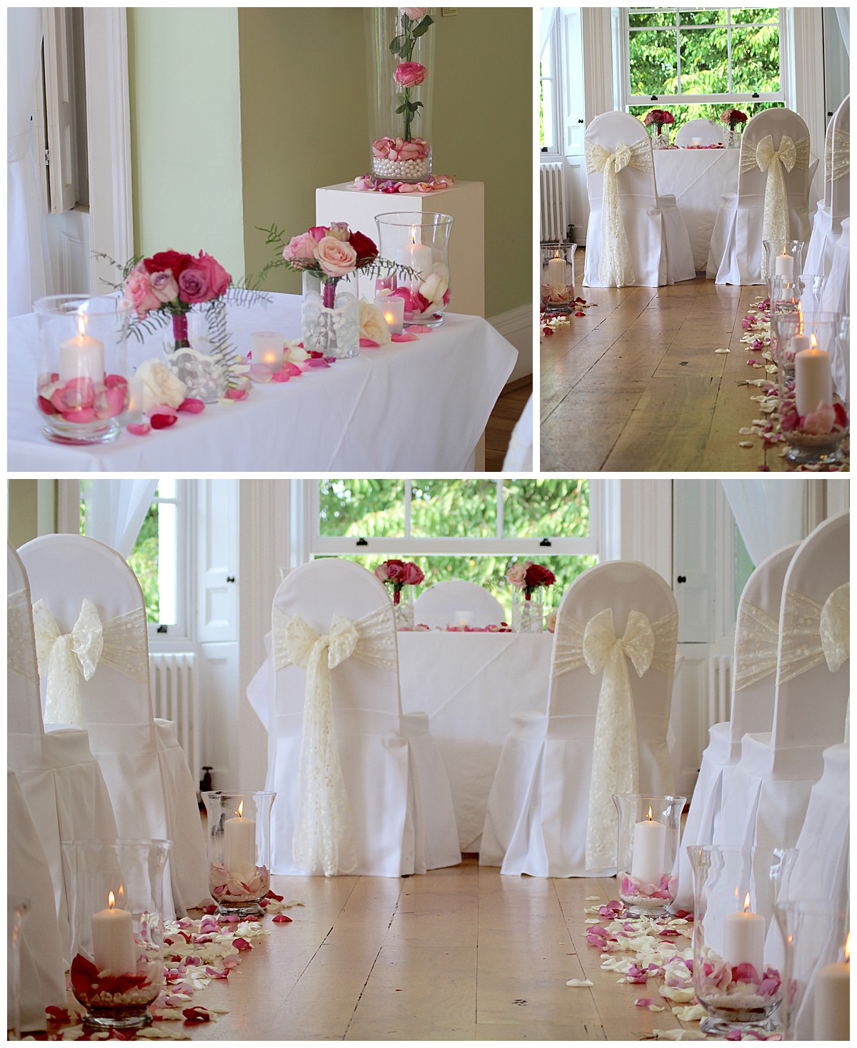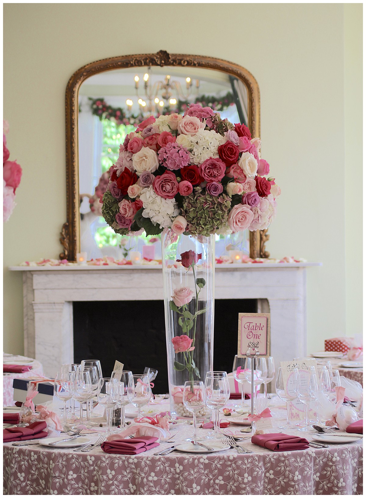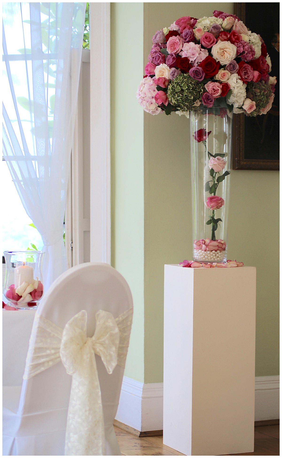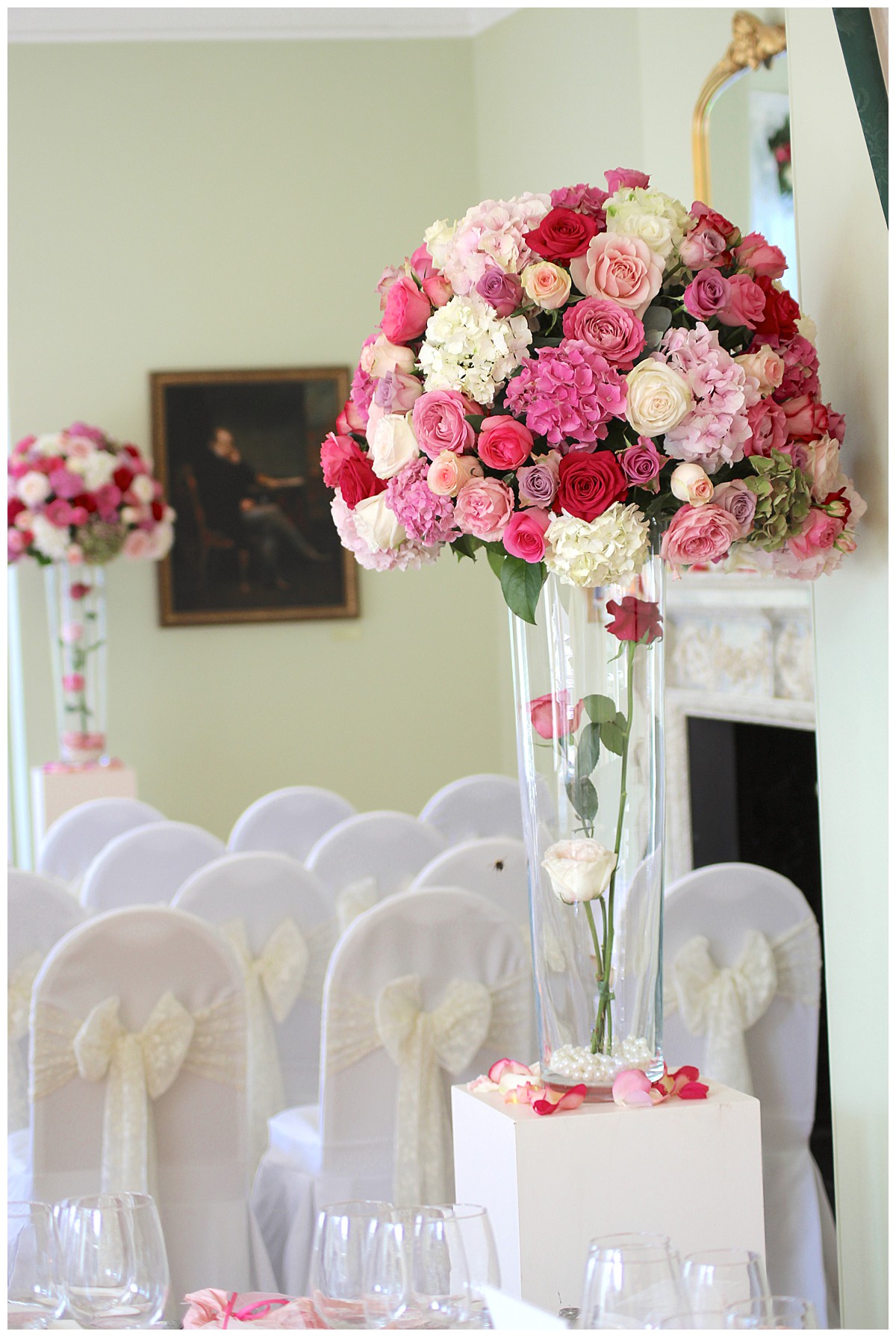 Four show-stopping tall vase centrepieces, with massive clouds of roses and hydrangeas resting on tall vases with roses and pearls in them, were used first to frame the start and end of the aisle. Then they became table centrepieces rising up above guests heads and sending heavenly scent around the room. We dressed the window behind the ceremony table with opulent garlands of roses and spray roses, with feathery coral fern, and Host with Style added floaty drapes behind them. The aisle was lined with romantic petal scatter and storm vases, and the fireplace was decorated with votives, loose rose blooms and lace-embellished candle holders.