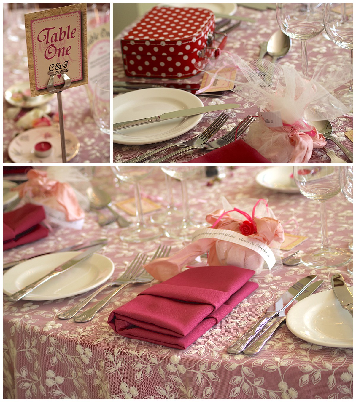 The tables were dressed with raspbery table cloths overlaid with textural vintage lace tablecloths, and pretty raspbery napkins, all from Host With Style who give the most attention to detail to their beautiful table settings, and Camilla had sourced vintage cups and saucers to put her favours in.