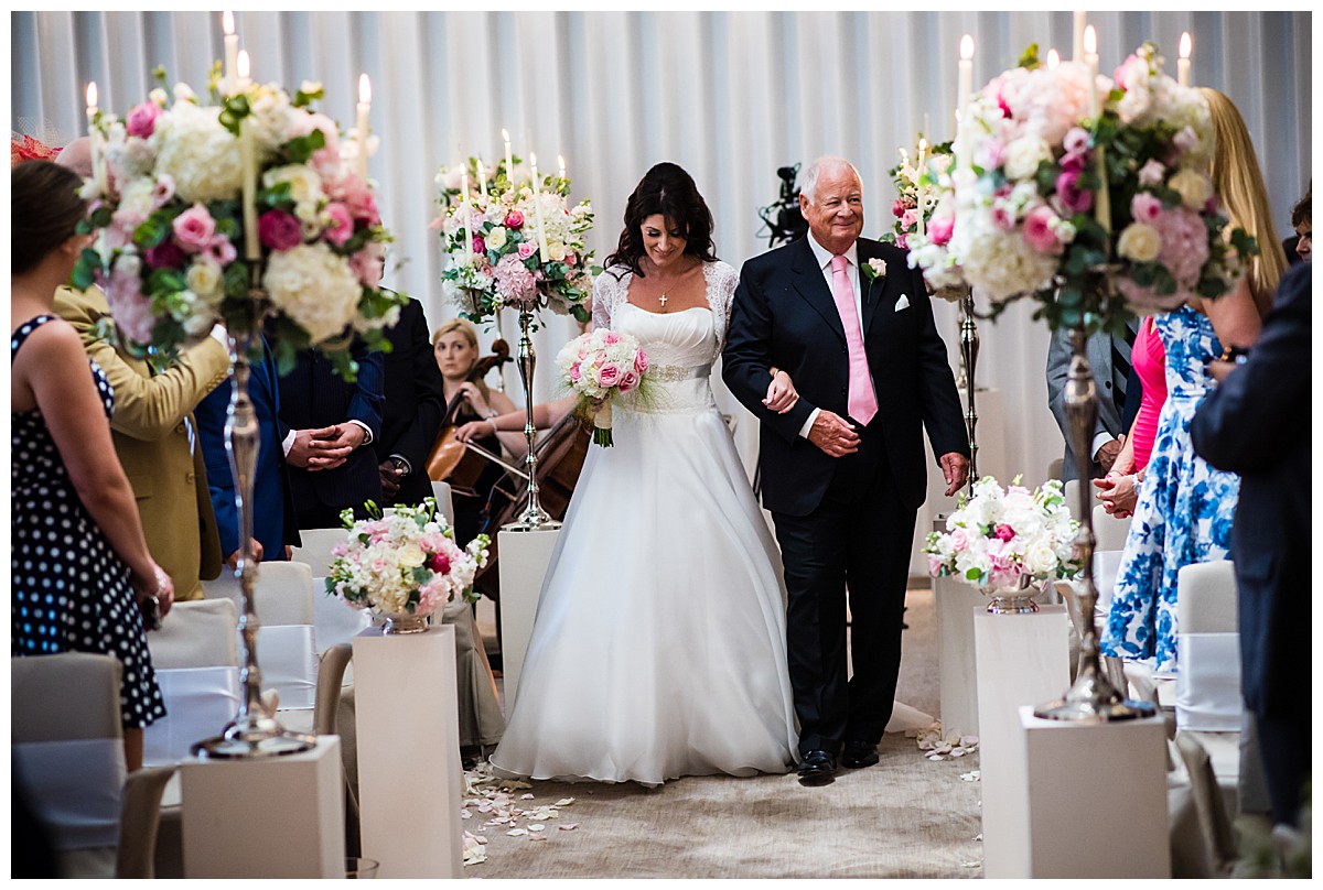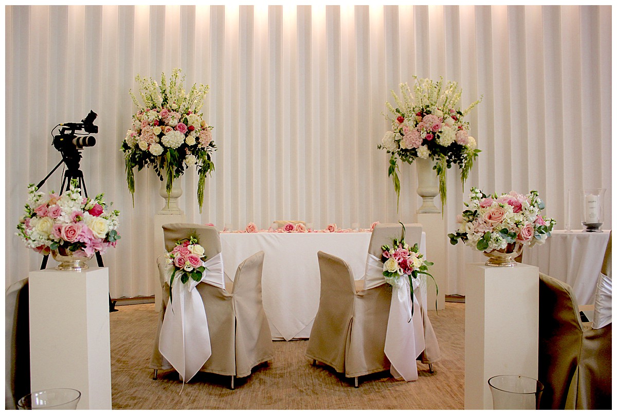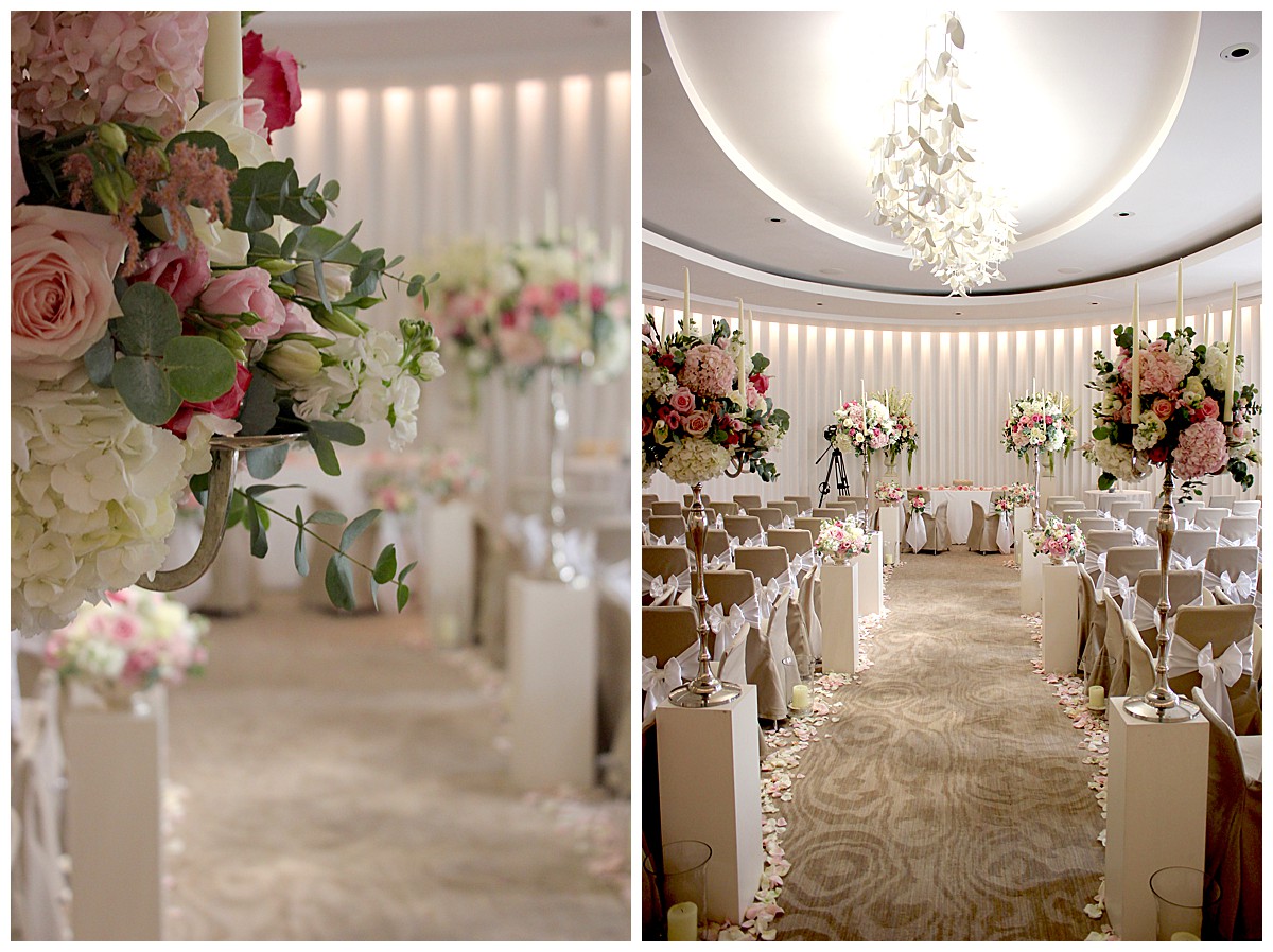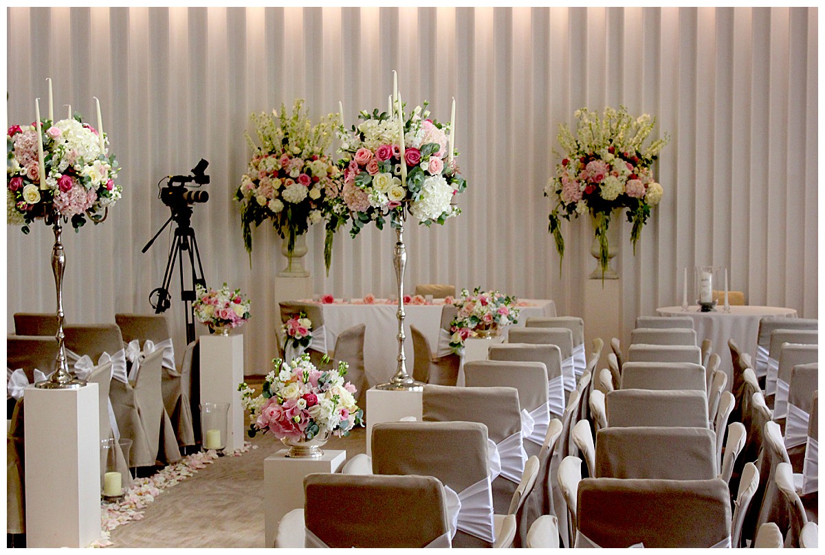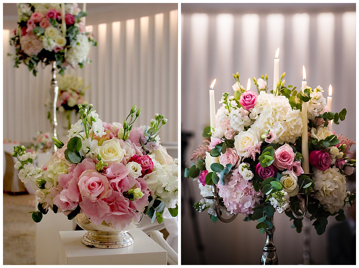 Drawn to the allure of the lovely wedding ceremony and romantic aisle adorned with gorgeous flowers from the wedding they happened to view, Stephanie got in touch with us a few days later and the rest as they say was history. While the other wedding was undoubtedly a seed of inspiration, Stephanie very much put her own stamp on these flowers and opted for a gorgeous mix of ivory, blush and bolder pinks, with elegant tall silver candelabras. Stephanie wanted to create an uplifting and summery effect, and embraced bold contrasts against the white backdrop of the venue wedding suite.