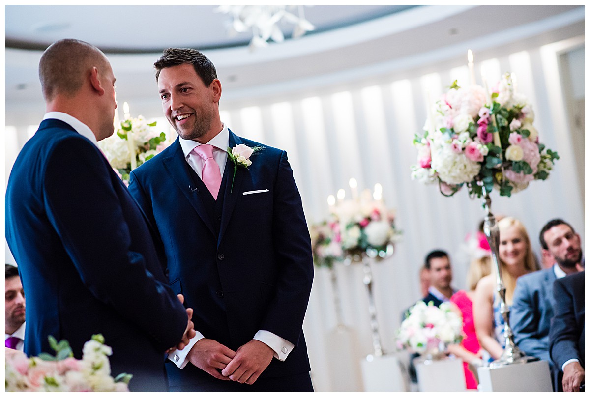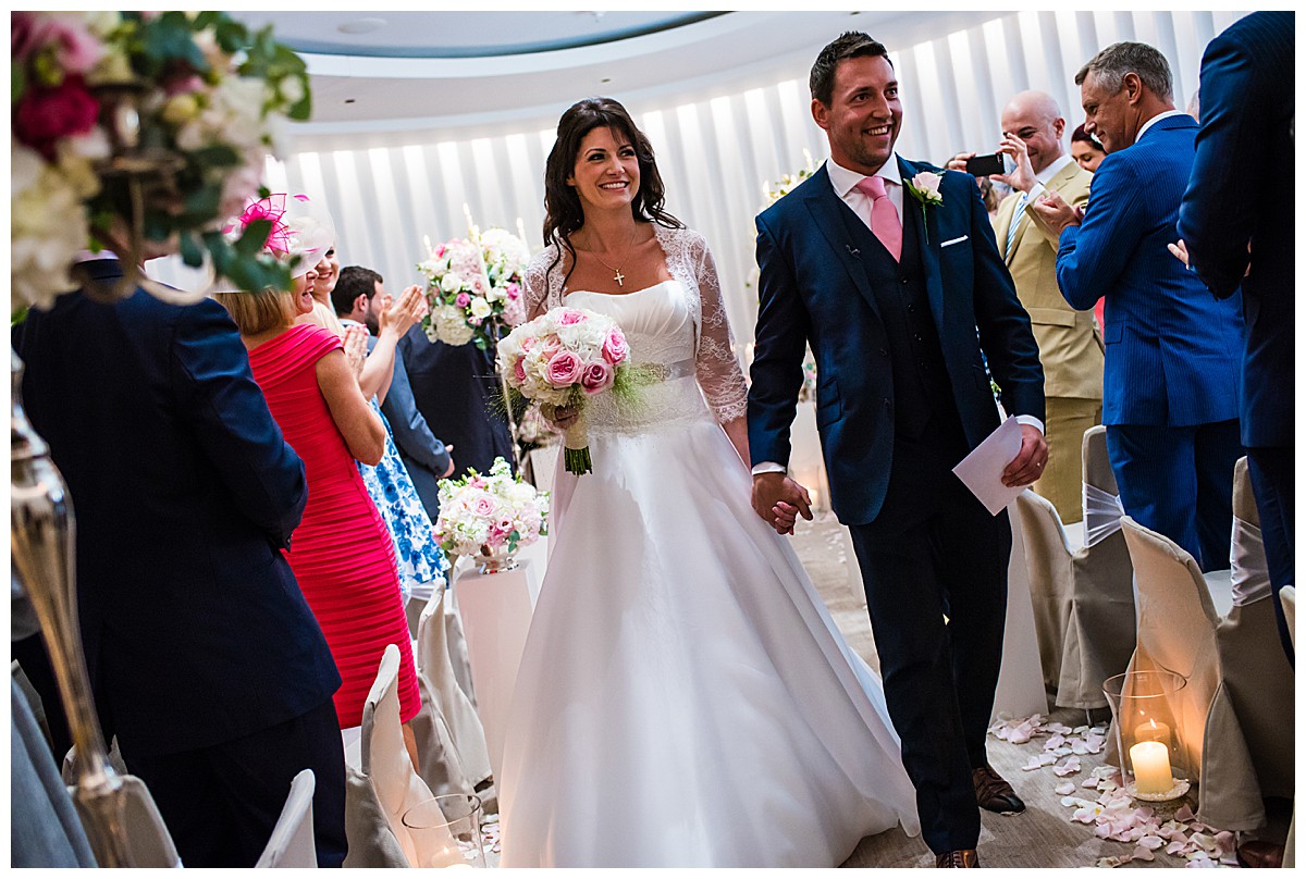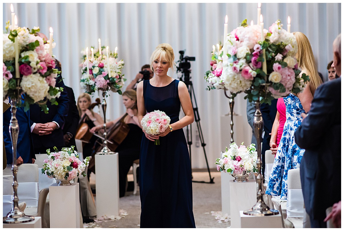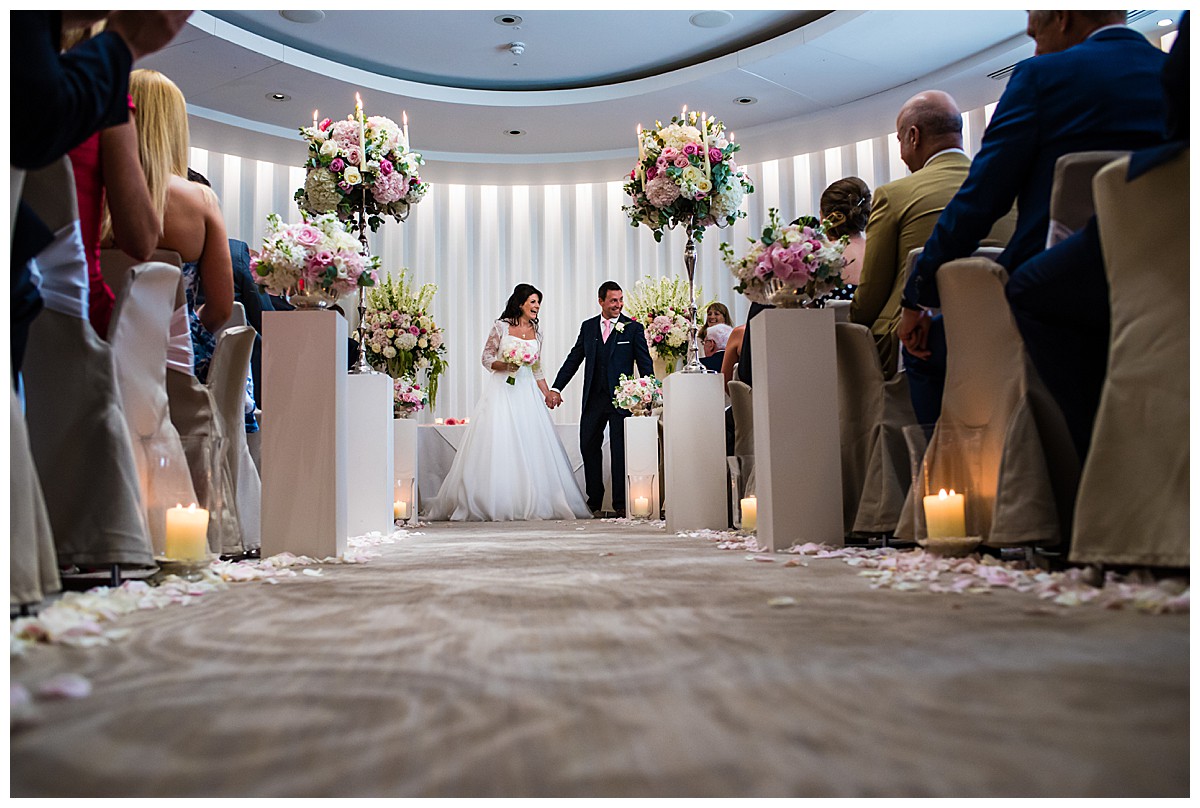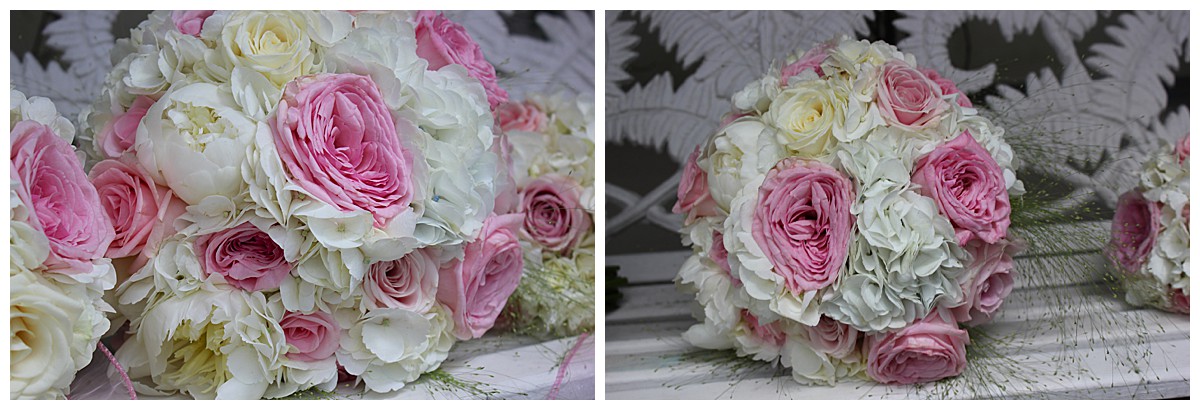 Drawn to the allure of the lovely wedding ceremony and romantic aisle adorned with gorgeous flowers from the wedding they happened to view, Stephanie got in touch with us a few days later and the rest as they say was history. While the other wedding was undoubtedly a seed of inspiration, Stephanie very much put her own stamp on these flowers and opted for a gorgeous mix of ivory, blush and bolder pinks, with elegant tall silver candelabras. Stephanie wanted to create an uplifting and summery effect, and embraced bold contrasts against the white backdrop of the venue wedding suite.