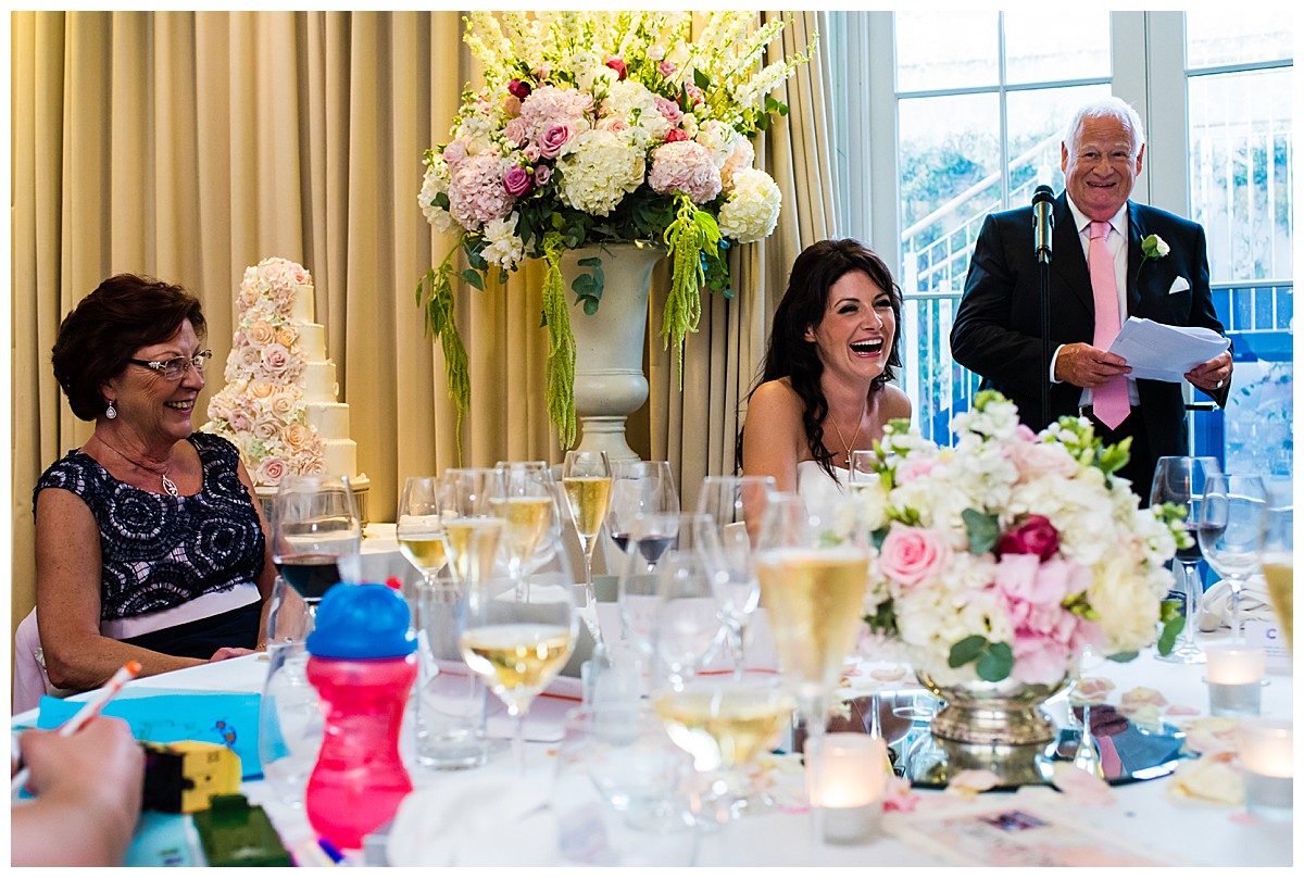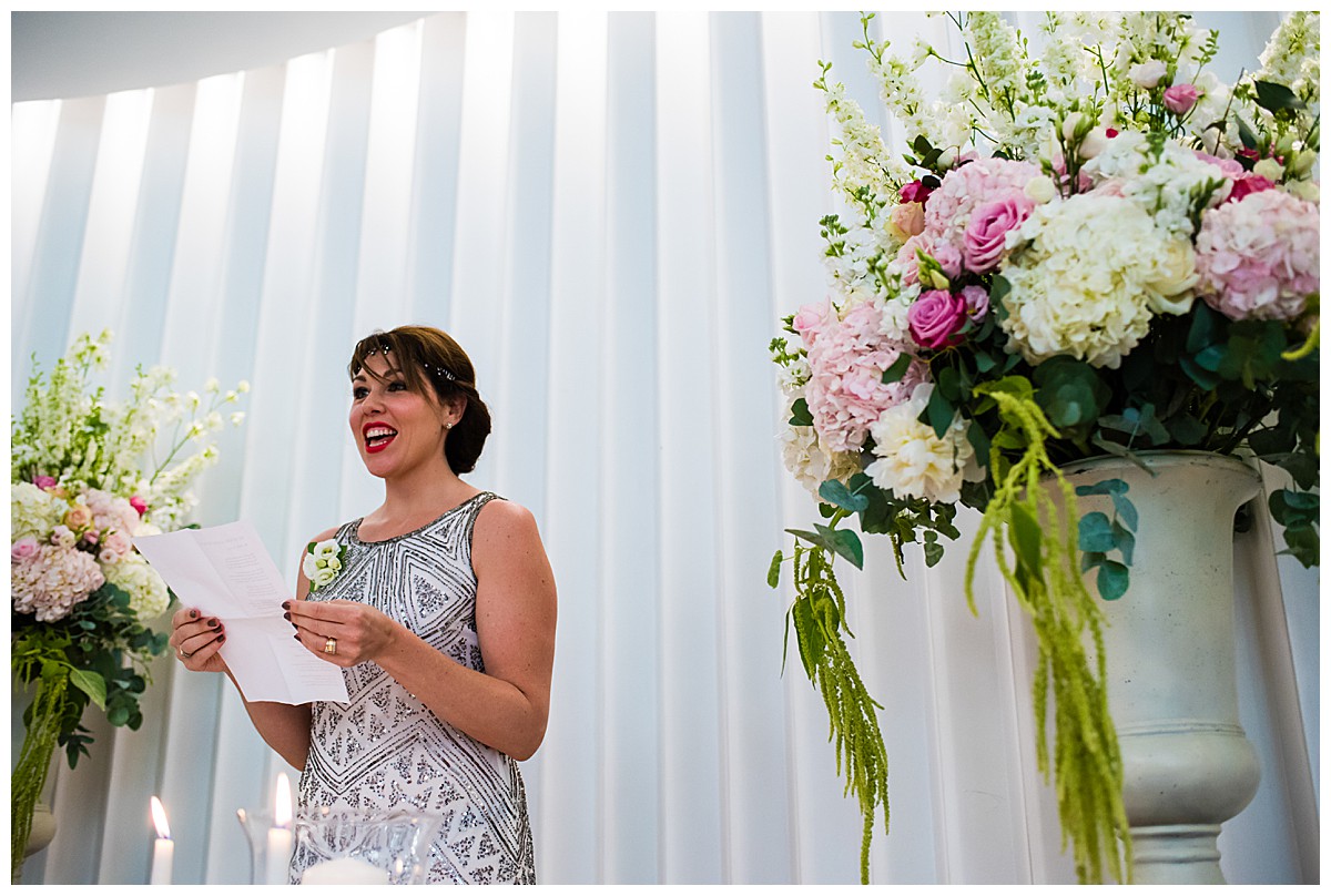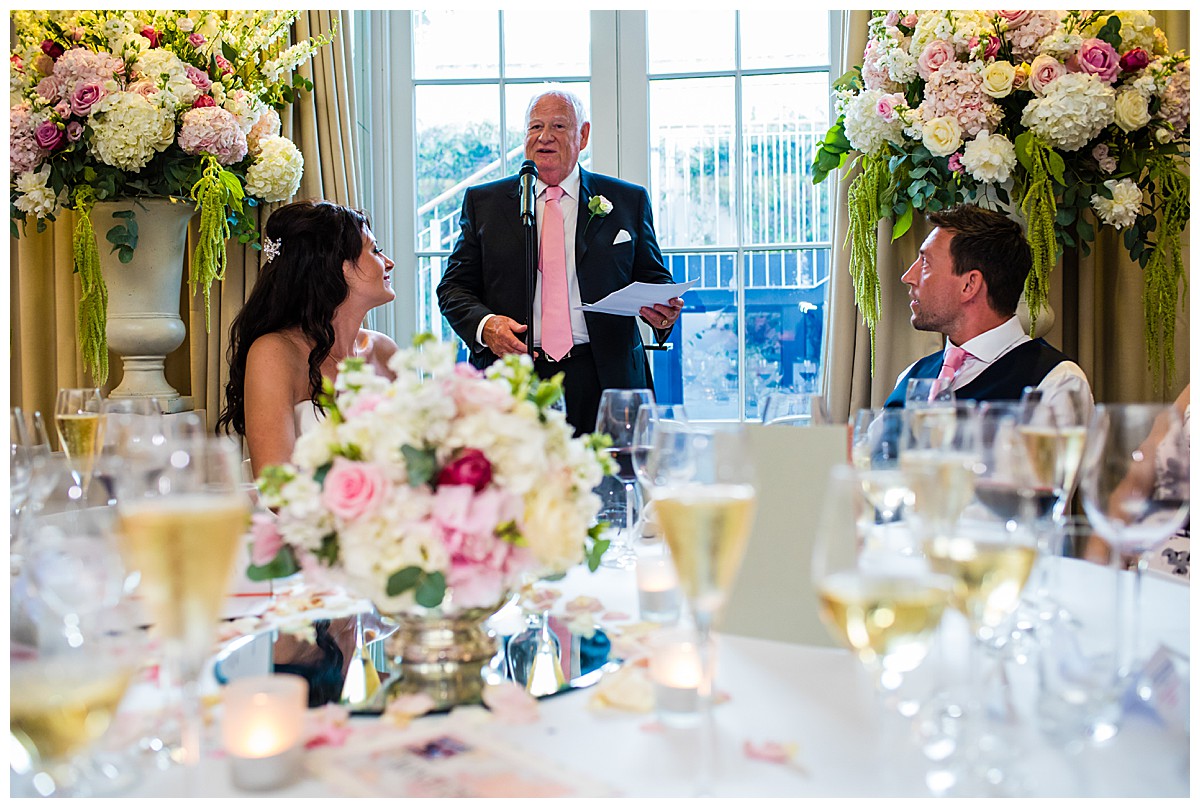 Following the ceremony, the floral centrepieces seamlessly transitioned to the wedding breakfast, with the two impressive urns serving as a magnificent backdrop for heartfelt speeches. The guest tables, adorned with a mix of gorgeously scented candelabras and silver rose bowls, radiated warmth and intimacy, inviting guests to immerse themselves into this beautiful wedding celebration.