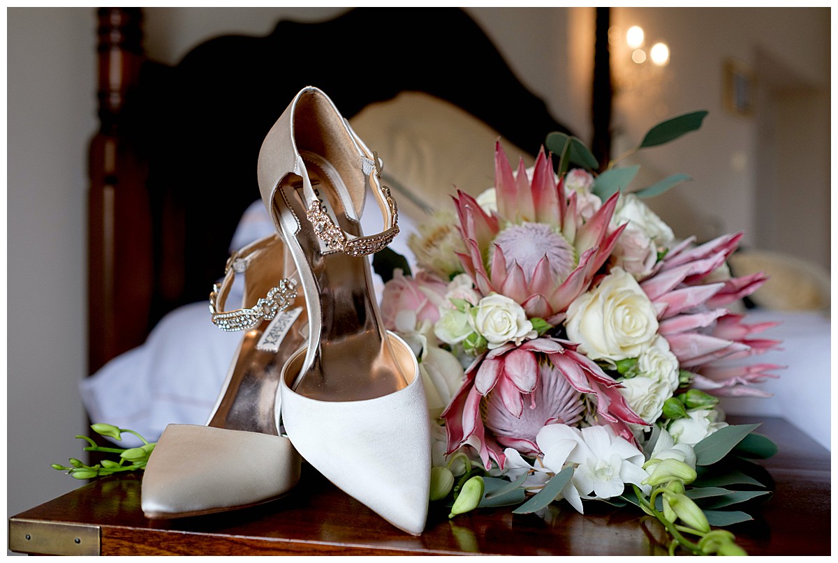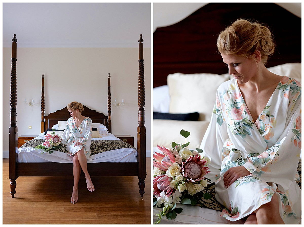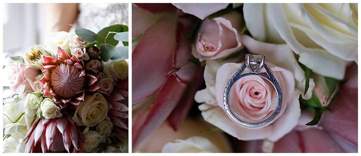 Alison chose a tear-drop bouquet of king proteas, roses, spray roses and long trailing Singapore orchids, and the 5 bridesmaids carried posies of a large king protea surrounded by daintier white proteas, spray roses and eucalyptus.