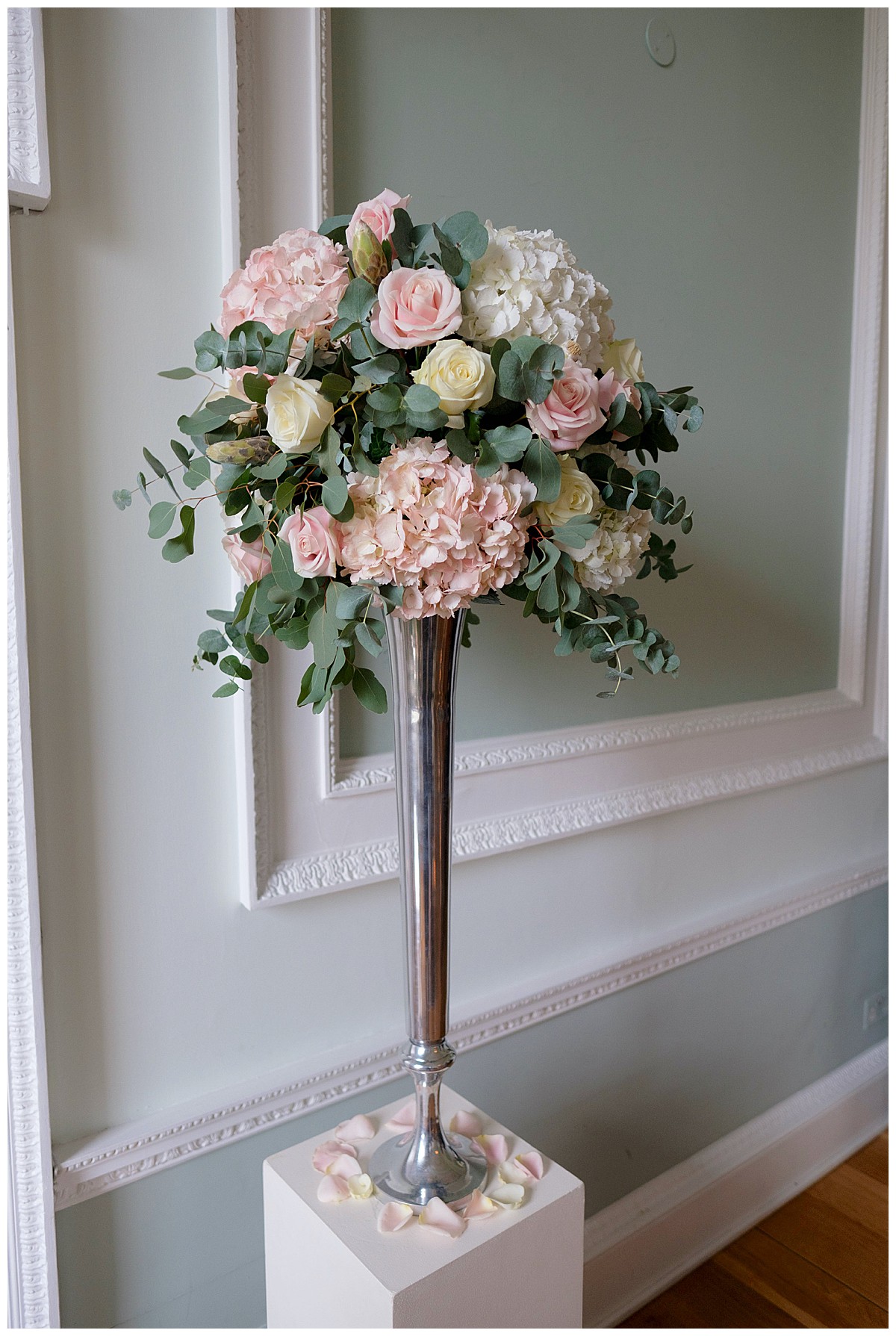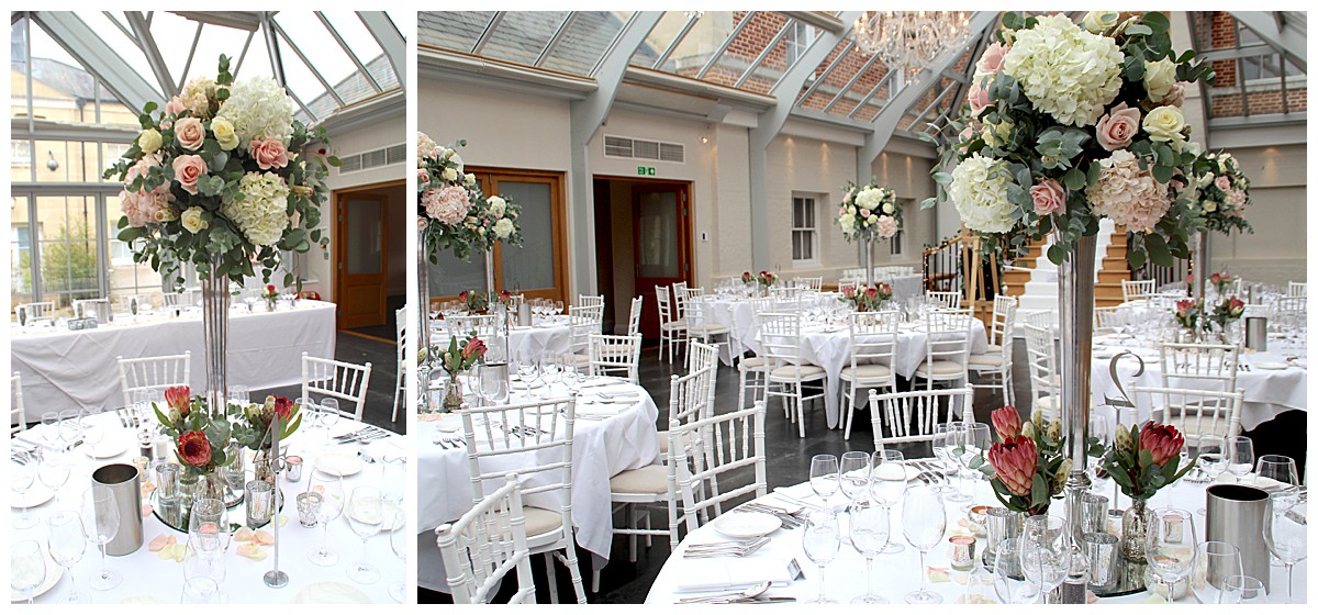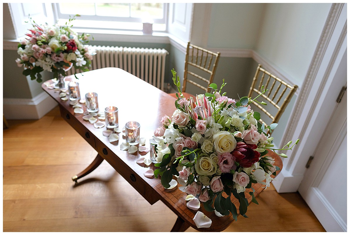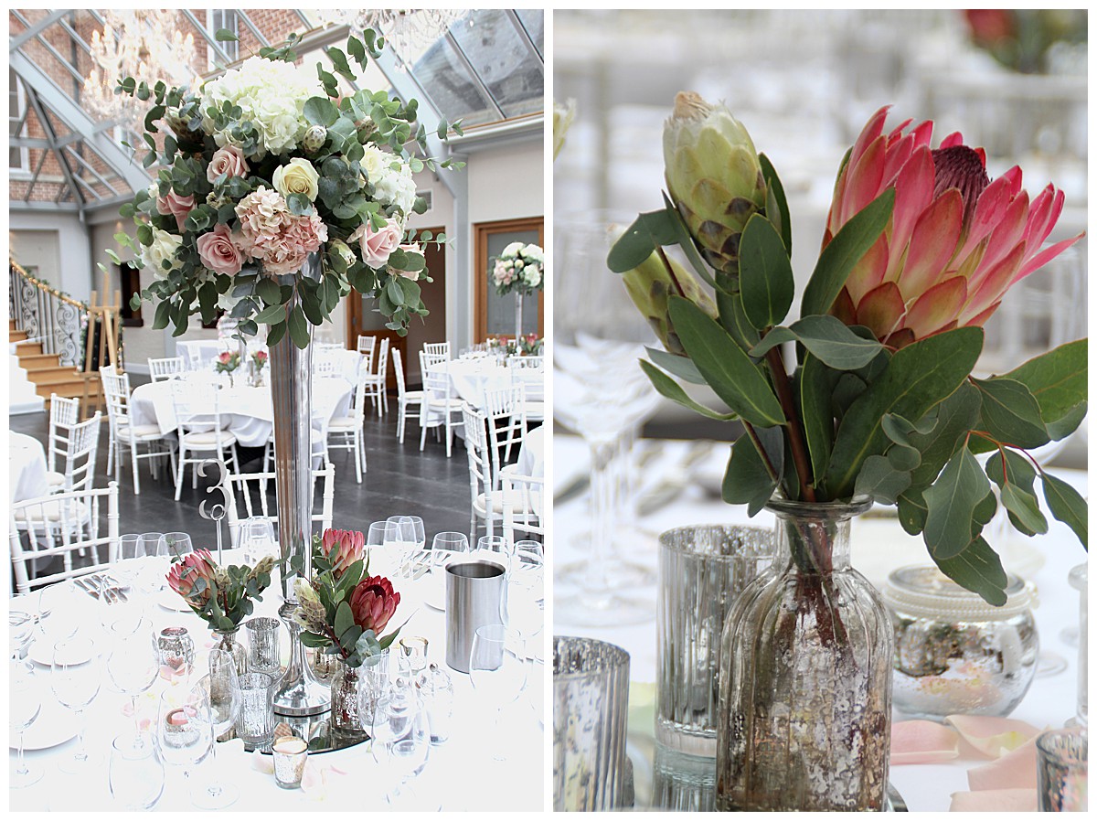 The beautiful Green ceremony room at Botleys Mansion was dressed with single proteas and eucalyptus chair ends posies, pretty rose petals and candle-lit hurricane vases down the aisle. Dressing the ceremony table, there were two very opulent rose bowls displays bursting with roses, proteas, hydrangeas and orchids. Framing the ceremony area, Alison wanted to make the most of her flowers budget and simply used two of her tall guest table centrepieces, placed on our lovely white plinths to add a nice background to the ceremony. The low displays were later reused on the long top table, alongside the bridesmaids posies, placed in matching silver vases, again, cleverly putting flowers to double usage through the day. The rest of the guest tables were dressed with tall elegant silver vase centrepieces of ivory and blush hydrangeas, roses and eucalyptus. To link in with the proteas theme, each centrepiece was surrounded by 3 silver vintage bottles with large and bud proteas in them.