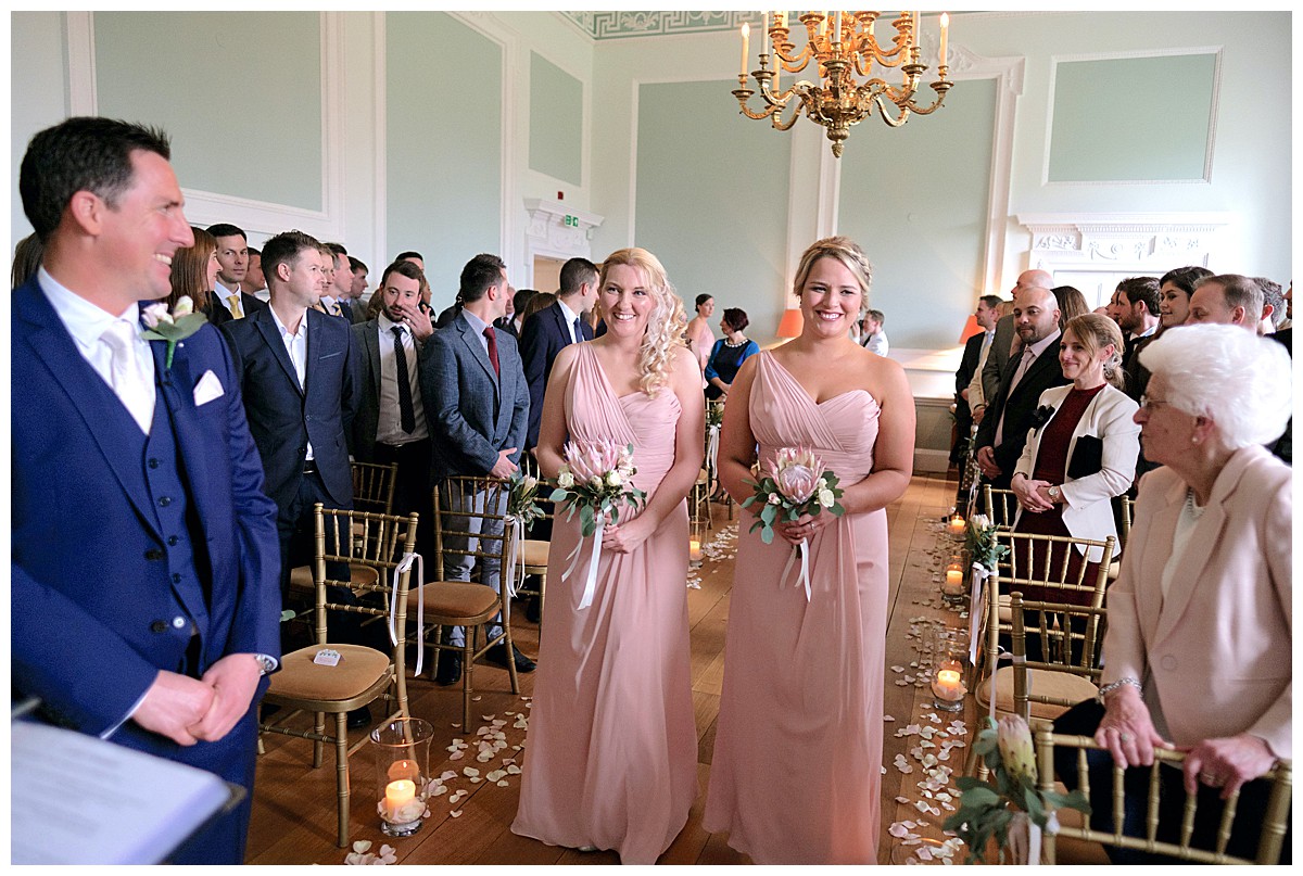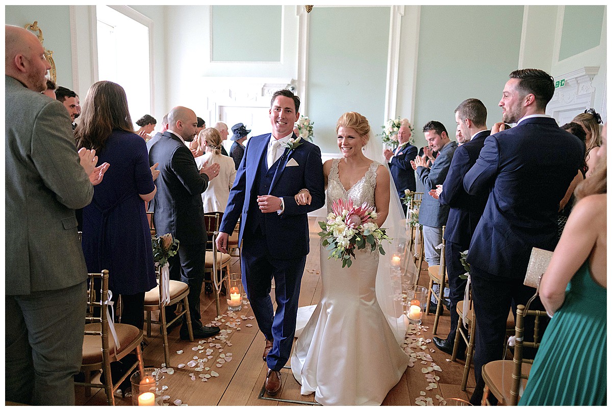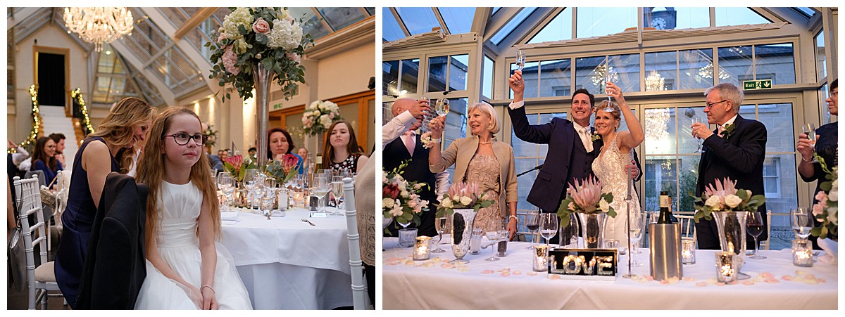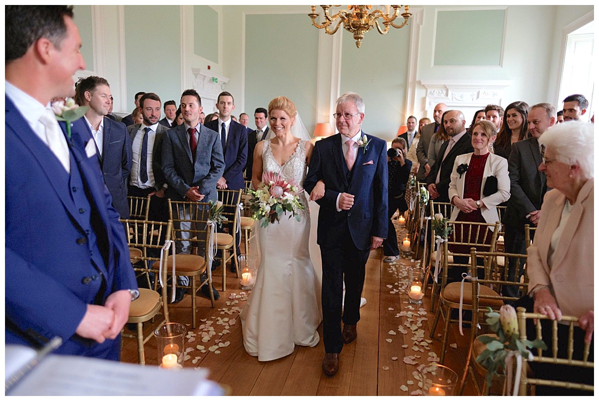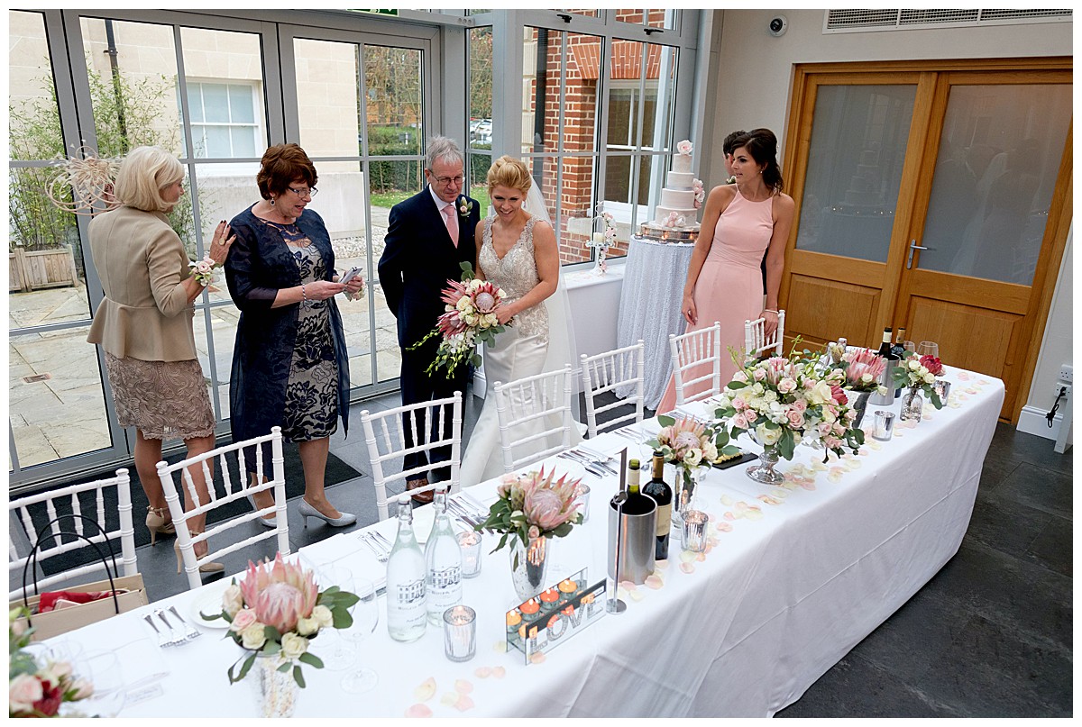 The beautiful Green ceremony room at Botleys Mansion was dressed with single proteas and eucalyptus chair ends posies, pretty rose petals and candle-lit hurricane vases down the aisle. Dressing the ceremony table, there were two very opulent rose bowls displays bursting with roses, proteas, hydrangeas and orchids. Framing the ceremony area, Alison wanted to make the most of her flowers budget and simply used two of her tall guest table centrepieces, placed on our lovely white plinths to add a nice background to the ceremony. The low displays were later reused on the long top table, alongside the bridesmaids posies, placed in matching silver vases, again, cleverly putting flowers to double usage through the day. The rest of the guest tables were dressed with tall elegant silver vase centrepieces of ivory and blush hydrangeas, roses and eucalyptus. To link in with the proteas theme, each centrepiece was surrounded by 3 silver vintage bottles with large and bud proteas in them.
