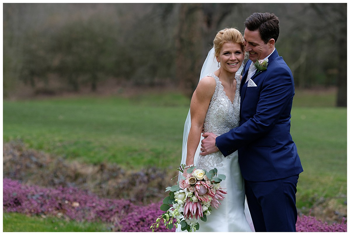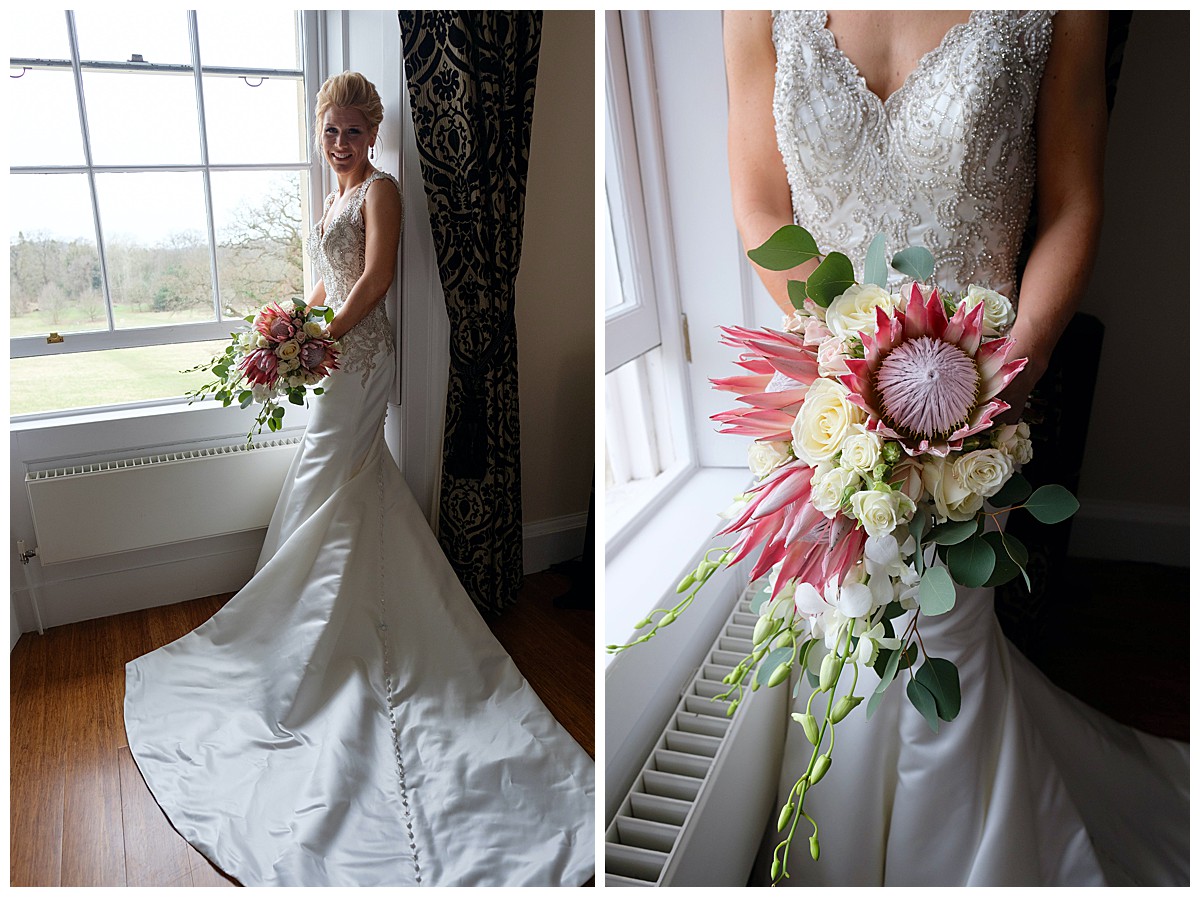 For their spring wedding at Botleys Mansion, Alison and Dylan set their heart on a fusion of striking South African proteas and English roses and hydrangeas. As Ali always wanted to include aspects of South Africa within the wedding it was non-negotiable that the king proteas (the national flower of South Africa) featured heavily throughout. The challenge was to incorporate them into the designs in a way which didn’t totally dominate. Style wise they also had to fit in with the English stately home setting that Botleys offers as a venue. The end designs were really lovely and unusual, the hardy structural proteas complementing the feminine English blooms rather nicely.